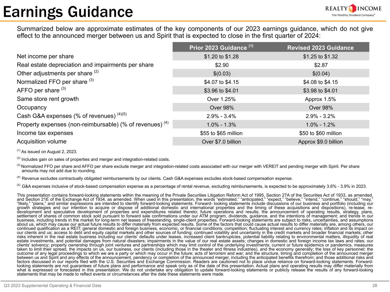 Q3 2023 Supplemental Operating & Financial Data 28 Earnings Guidance Summarized below are approximate estimates of the key components of our 2023 earnings guidance, which do not give effect to the announced merger between us and Spirit that is expected to close in the first quarter of 2024: Prior 2023 Guidance (1) Revised 2023 Guidance Net income per share $1.20 to $1.28 $1.25 to $1.32 Real estate depreciation and impairments per share $2.90 $2.87 Other adjustments per share (2) $(0.03) $(0.04) Normalized FFO per share (3) $4.07 to $4.15 $4.08 to $4.15 AFFO per share (3) $3.96 to $4.01 $3.98 to $4.01 Same store rent growth Over 1.25% Approx 1.5% Occupancy Over 98% Over 98% Cash G&A expenses (% of revenues) (4)(5) 2.9% - 3.4% 2.9% - 3.2% Property expenses (non-reimbursable) (% of revenues) (4) 1.0% - 1.3% 1.0% - 1.2% Income tax expenses $55 to $65 million $50 to $60 million Acquisition volume Over $7.0 billion Approx $9.0 billion (1) As issued on August 2, 2023. (2) Includes gain on sales of properties and merger and integration-related costs. (3) Normalized FFO per share and AFFO per share exclude merger and integration-related costs associated with our merger with VEREIT and pending merger with Spirit. Per share amounts may not add due to rounding. (4) Revenue excludes contractually obligated reimbursements by our clients. Cash G&A expenses excludes stock-based compensation expense. (5) G&A expenses inclusive of stock-based compensation expense as a percentage of rental revenue, excluding reimbursements, is expected to be approximately 3.6% - 3.9% in 2023. This presentation contains forward-looking statements within the meaning of the Private Securities Litigation Reform Act of 1995, Section 27A of the Securities Act of 1933, as amended, and Section 21E of the Exchange Act of 1934, as amended. When used in this presentation, the words “estimated,” “anticipated,” “expect,” “believe,” “intend,” “continue,” “should,” “may,” “likely,” “plans,” and similar expressions are intended to identify forward-looking statements. Forward- looking statements include discussions of our business and portfolio (including our growth strategies and our intention to acquire or dispose of additional domestic and international properties and the timing of these acquisitions and dispositions), re-lease, re- development and speculative development of properties and expenditures related thereto; future operations and results; the announcement of operating results, strategy, plans, settlement of shares of common stock sold pursuant to forward sale confirmations under our ATM program, dividends, guidance, and the intentions of management; and trends in our business, including trends in the market for long-term net leases of freestanding, single-client properties. Forward-looking statements are subject to risks, uncertainties, and assumptions about us, which may cause our actual future results to differ materially from expected results. Some of the factors that could cause actual results to differ materially are, among others, our continued qualification as a REIT; general domestic and foreign business, economic, or financial conditions; competition; fluctuating interest and currency rates; inflation and its impact on our clients and us; access to debt and equity capital markets and other sources of funding; continued volatility and uncertainty in the credit markets and broader financial markets; other risks inherent in the real estate business including our clients' defaults under leases, increased client bankruptcies, potential liability relating to environmental matters, illiquidity of real estate investments, and potential damages from natural disasters; impairments in the value of our real estate assets; changes in domestic and foreign income tax laws and rates; our clients' solvency; property ownership through joint ventures and partnerships which may limit control of the underlying investments; current or future epidemics or pandemics, measures taken to limit their spread, the impacts on us, our business, our clients (including those in the theater and fitness industries), and the economy generally; the loss of key personnel; the outcome of any legal proceedings to which we are a party or which may occur in the future; acts of terrorism and war; and the structure, timing and completion of the announced merger between us and Spirit and any effects of the announcement, pendency or completion of the announced merger, including the anticipated benefits therefrom; and those additional risks and factors discussed in our reports filed with the U.S. Securities and Exchange Commission. Readers are cautioned not to place undue reliance on forward-looking statements. Forward- looking statements are not guarantees of future plans and performance and speak only as of the date of this presentation. Actual plans and operating results may differ materially from what is expressed or forecasted in this presentation. We do not undertake any obligation to update forward-looking statements or publicly release the results of any forward-looking statements that may be made to reflect events or circumstances after the date these statements were made.