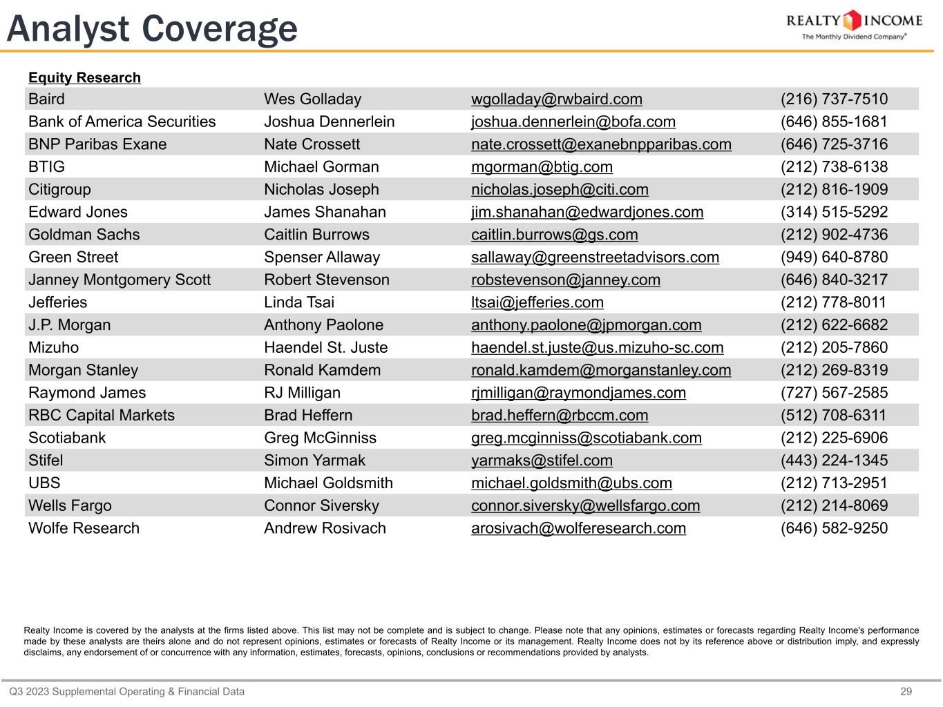 Q3 2023 Supplemental Operating & Financial Data 29 Analyst Coverage Equity Research Baird Wes Golladay wgolladay@rwbaird.com (216) 737-7510 Bank of America Securities Joshua Dennerlein joshua.dennerlein@bofa.com (646) 855-1681 BNP Paribas Exane Nate Crossett nate.crossett@exanebnpparibas.com (646) 725-3716 BTIG Michael Gorman mgorman@btig.com (212) 738-6138 Citigroup Nicholas Joseph nicholas.joseph@citi.com (212) 816-1909 Edward Jones James Shanahan jim.shanahan@edwardjones.com (314) 515-5292 Goldman Sachs Caitlin Burrows caitlin.burrows@gs.com (212) 902-4736 Green Street Spenser Allaway sallaway@greenstreetadvisors.com (949) 640-8780 Janney Montgomery Scott Robert Stevenson robstevenson@janney.com (646) 840-3217 Jefferies Linda Tsai ltsai@jefferies.com (212) 778-8011 J.P. Morgan Anthony Paolone anthony.paolone@jpmorgan.com (212) 622-6682 Mizuho Haendel St. Juste haendel.st.juste@us.mizuho-sc.com (212) 205-7860 Morgan Stanley Ronald Kamdem ronald.kamdem@morganstanley.com (212) 269-8319 Raymond James RJ Milligan rjmilligan@raymondjames.com (727) 567-2585 RBC Capital Markets Brad Heffern brad.heffern@rbccm.com (512) 708-6311 Scotiabank Greg McGinniss greg.mcginniss@scotiabank.com (212) 225-6906 Stifel Simon Yarmak yarmaks@stifel.com (443) 224-1345 UBS Michael Goldsmith michael.goldsmith@ubs.com (212) 713-2951 Wells Fargo Connor Siversky connor.siversky@wellsfargo.com (212) 214-8069 Wolfe Research Andrew Rosivach arosivach@wolferesearch.com (646) 582-9250 Realty Income is covered by the analysts at the firms listed above. This list may not be complete and is subject to change. Please note that any opinions, estimates or forecasts regarding Realty Income's performance made by these analysts are theirs alone and do not represent opinions, estimates or forecasts of Realty Income or its management. Realty Income does not by its reference above or distribution imply, and expressly disclaims, any endorsement of or concurrence with any information, estimates, forecasts, opinions, conclusions or recommendations provided by analysts.