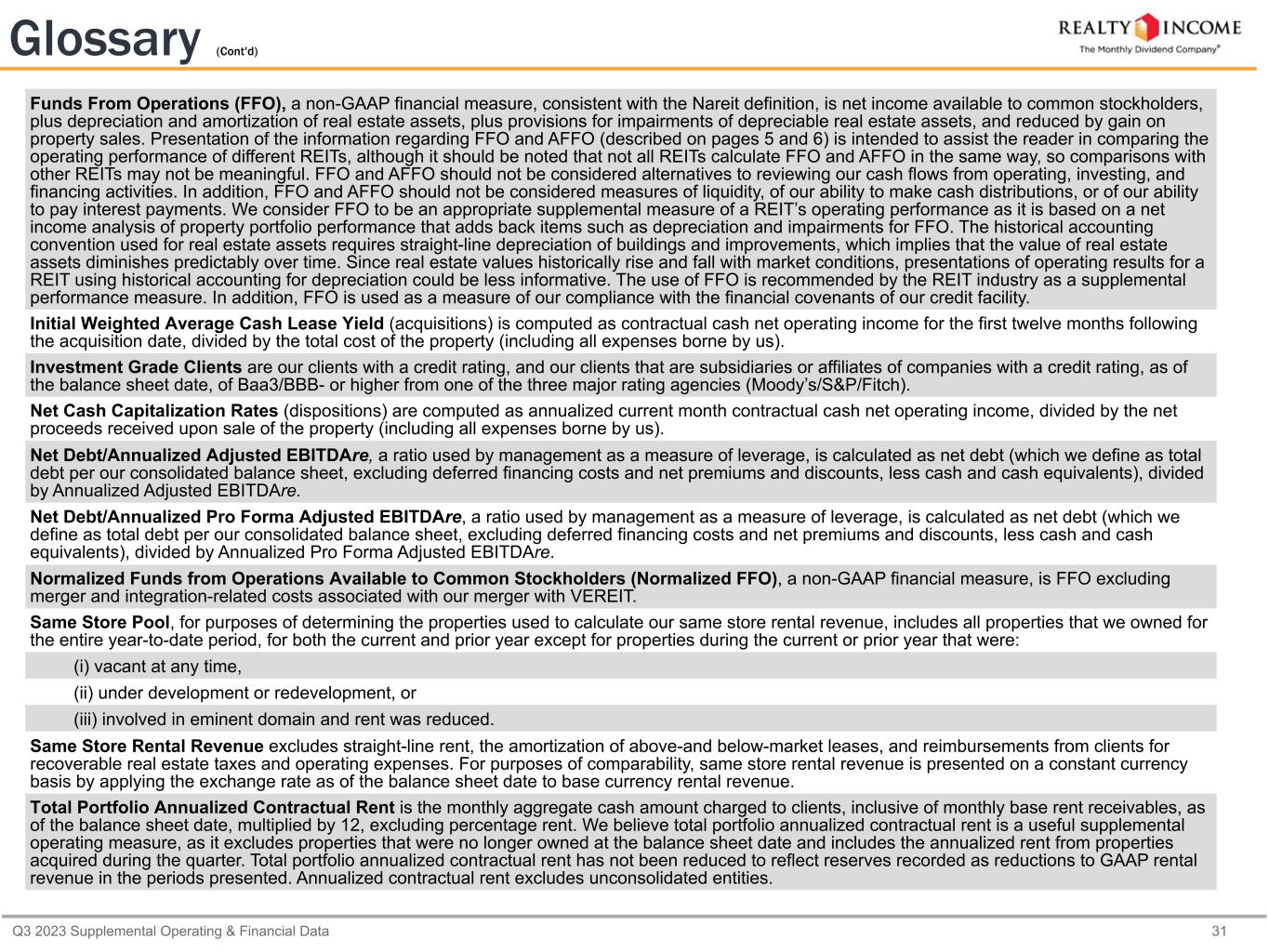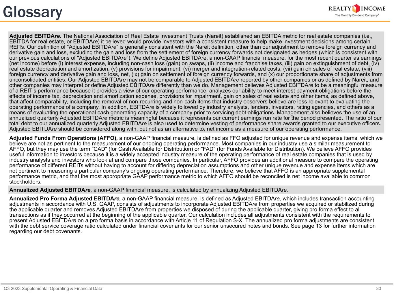 Q3 2023 Supplemental Operating & Financial Data 30 Glossary Adjusted EBITDAre. The National Association of Real Estate Investment Trusts (Nareit) established an EBITDA metric for real estate companies (i.e., EBITDA for real estate, or EBITDAre) it believed would provide investors with a consistent measure to help make investment decisions among certain REITs. Our definition of “Adjusted EBITDAre” is generally consistent with the Nareit definition, other than our adjustment to remove foreign currency and derivative gain and loss, excluding the gain and loss from the settlement of foreign currency forwards not designated as hedges (which is consistent with our previous calculations of "Adjusted EBITDAre"). We define Adjusted EBITDAre, a non-GAAP financial measure, for the most recent quarter as earnings (net income) before (i) interest expense, including non-cash loss (gain) on swaps, (ii) income and franchise taxes, (iii) gain on extinguishment of debt, (iv) real estate depreciation and amortization, (v) provisions for impairment, (vi) merger and integration-related costs, (vii) gain on sales of real estate, (viii) foreign currency and derivative gain and loss, net, (ix) gain on settlement of foreign currency forwards, and (x) our proportionate share of adjustments from unconsolidated entities. Our Adjusted EBITDAre may not be comparable to Adjusted EBITDAre reported by other companies or as defined by Nareit, and other companies may interpret or define Adjusted EBITDAre differently than we do. Management believes Adjusted EBITDAre to be a meaningful measure of a REIT’s performance because it provides a view of our operating performance, analyzes our ability to meet interest payment obligations before the effects of income tax, depreciation and amortization expense, provisions for impairment, gain on sales of real estate and other items, as defined above, that affect comparability, including the removal of non-recurring and non-cash items that industry observers believe are less relevant to evaluating the operating performance of a company. In addition, EBITDAre is widely followed by industry analysts, lenders, investors, rating agencies, and others as a means of evaluating the operational cash generating capacity of a company prior to servicing debt obligations. Management also believes the use of an annualized quarterly Adjusted EBITDAre metric is meaningful because it represents our current earnings run rate for the period presented. The ratio of our total debt to our annualized quarterly Adjusted EBITDAre is also used to determine vesting of performance share awards granted to our executive officers. Adjusted EBITDAre should be considered along with, but not as an alternative to, net income as a measure of our operating performance. Adjusted Funds From Operations (AFFO), a non-GAAP financial measure, is defined as FFO adjusted for unique revenue and expense items, which we believe are not as pertinent to the measurement of our ongoing operating performance. Most companies in our industry use a similar measurement to AFFO, but they may use the term "CAD" (for Cash Available for Distribution) or "FAD" (for Funds Available for Distribution). We believe AFFO provides useful information to investors because it is a widely accepted industry measure of the operating performance of real estate companies that is used by industry analysts and investors who look at and compare those companies. In particular, AFFO provides an additional measure to compare the operating performance of different REITs without having to account for differing depreciation assumptions and other unique revenue and expense items which are not pertinent to measuring a particular company’s ongoing operating performance. Therefore, we believe that AFFO is an appropriate supplemental performance metric, and that the most appropriate GAAP performance metric to which AFFO should be reconciled is net income available to common stockholders. Annualized Adjusted EBITDAre, a non-GAAP financial measure, is calculated by annualizing Adjusted EBITDAre. Annualized Pro Forma Adjusted EBITDAre, a non-GAAP financial measure, is defined as Adjusted EBITDAre, which includes transaction accounting adjustments in accordance with U.S. GAAP, consists of adjustments to incorporate Adjusted EBITDAre from properties we acquired or stabilized during the applicable quarter and removes Adjusted EBITDAre from properties we disposed of during the applicable quarter, giving pro forma effect to all transactions as if they occurred at the beginning of the applicable quarter. Our calculation includes all adjustments consistent with the requirements to present Adjusted EBITDAre on a pro forma basis in accordance with Article 11 of Regulation S-X. The annualized pro forma adjustments are consistent with the debt service coverage ratio calculated under financial covenants for our senior unsecured notes and bonds. See page 13 for further information regarding our debt covenants.