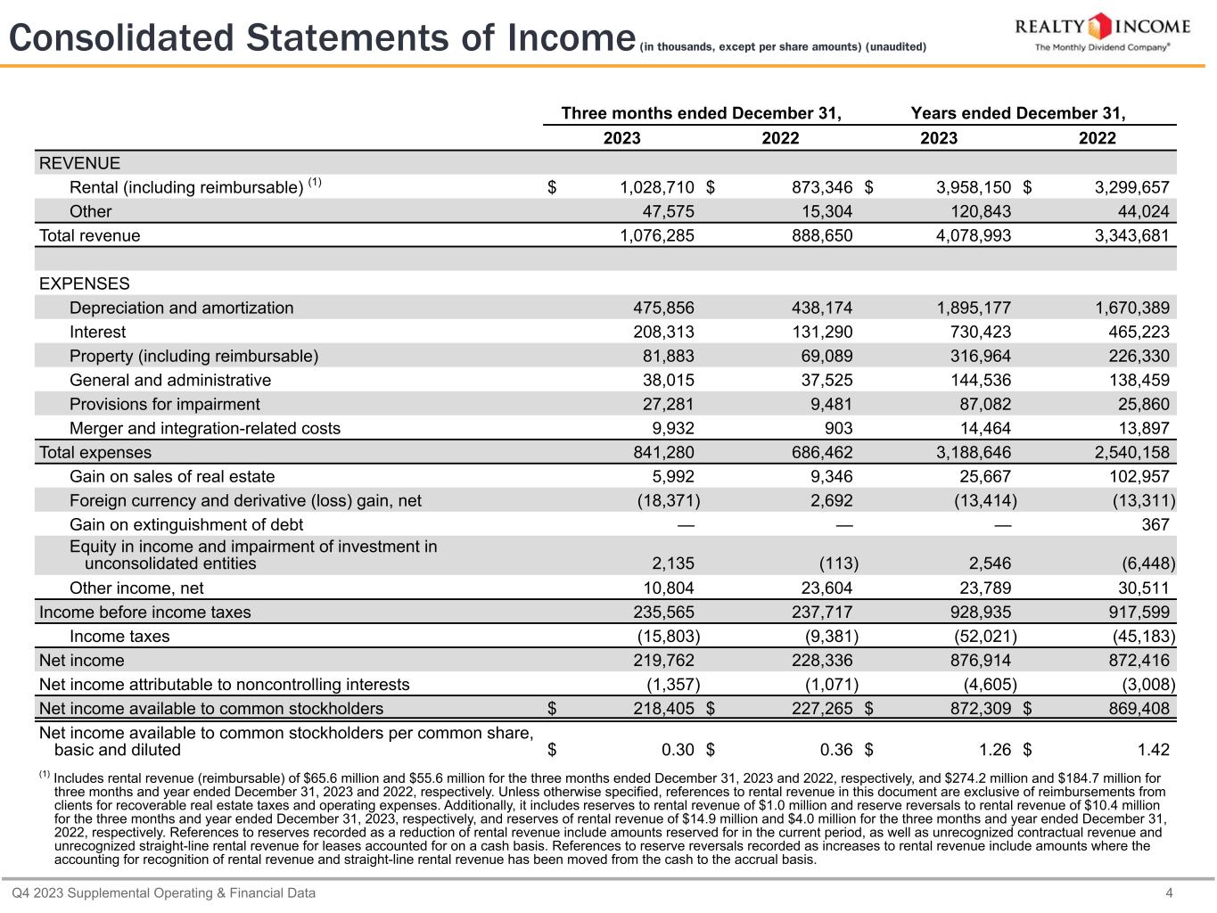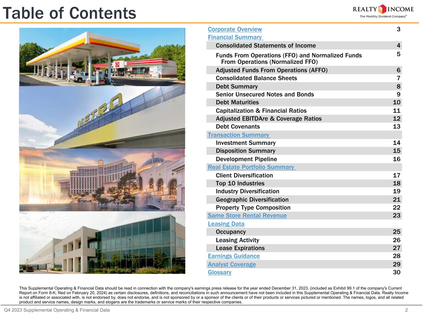 Q4 2023 Supplemental Operating & Financial Data 2 Table of Contents Corporate Overview 3 Financial Summary Consolidated Statements of Income 4 Funds From Operations (FFO) and Normalized Funds From Operations (Normalized FFO) 5 Adjusted Funds From Operations (AFFO) 6 Consolidated Balance Sheets 7 Debt Summary 8 Senior Unsecured Notes and Bonds 9 Debt Maturities 10 Capitalization & Financial Ratios 11 Adjusted EBITDAre & Coverage Ratios 12 Debt Covenants 13 Transaction Summary Investment Summary 14 Disposition Summary 15 Development Pipeline 16 Real Estate Portfolio Summary Client Diversification 17 Top 10 Industries 18 Industry Diversification 19 Geographic Diversification 21 Property Type Composition 22 Same Store Rental Revenue 23 Leasing Data Occupancy 25 Leasing Activity 26 Lease Expirations 27 Earnings Guidance 28 Analyst Coverage 29 Glossary 30 This Supplemental Operating & Financial Data should be read in connection with the company's earnings press release for the year ended December 31, 2023, (included as Exhibit 99.1 of the company's Current Report on Form 8-K, filed on February 20, 2024) as certain disclosures, definitions, and reconciliations in such announcement have not been included in this Supplemental Operating & Financial Data. Realty Income is not affiliated or associated with, is not endorsed by, does not endorse, and is not sponsored by or a sponsor of the clients or of their products or services pictured or mentioned. The names, logos, and all related product and service names, design marks, and slogans are the trademarks or service marks of their respective companies.