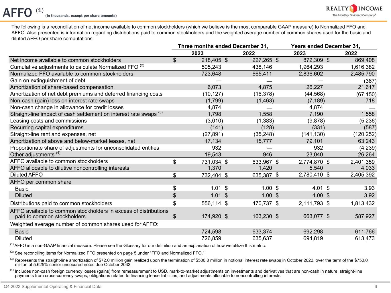 Q4 2023 Supplemental Operating & Financial Data 6 The following is a reconciliation of net income available to common stockholders (which we believe is the most comparable GAAP measure) to Normalized FFO and AFFO. Also presented is information regarding distributions paid to common stockholders and the weighted average number of common shares used for the basic and diluted AFFO per share computations. Three months ended December 31, Years ended December 31, 2023 2022 2023 2022 Net income available to common stockholders $ 218,405 $ 227,265 $ 872,309 $ 869,408 Cumulative adjustments to calculate Normalized FFO (2) 505,243 438,146 1,964,293 1,616,382 Normalized FFO available to common stockholders 723,648 665,411 2,836,602 2,485,790 Gain on extinguishment of debt — — — (367) Amortization of share-based compensation 6,073 4,875 26,227 21,617 Amortization of net debt premiums and deferred financing costs (10,127) (16,378) (44,568) (67,150) Non-cash (gain) loss on interest rate swaps (1,799) (1,463) (7,189) 718 Non-cash change in allowance for credit losses 4,874 — 4,874 — Straight-line impact of cash settlement on interest rate swaps (3) 1,798 1,558 7,190 1,558 Leasing costs and commissions (3,010) (1,383) (9,878) (5,236) Recurring capital expenditures (141) (128) (331) (587) Straight-line rent and expenses, net (27,891) (35,248) (141,130) (120,252) Amortization of above and below-market leases, net 17,134 15,777 79,101 63,243 Proportionate share of adjustments for unconsolidated entities 932 — 932 (4,239) Other adjustments (4) 19,543 946 23,040 26,264 AFFO available to common stockholders $ 731,034 $ 633,967 $ 2,774,870 $ 2,401,359 AFFO allocable to dilutive noncontrolling interests 1,370 1,420 5,540 4,033 Diluted AFFO $ 732,404 $ 635,387 $ 2,780,410 $ 2,405,392 AFFO per common share Basic $ 1.01 $ 1.00 $ 4.01 $ 3.93 Diluted $ 1.01 $ 1.00 $ 4.00 $ 3.92 Distributions paid to common stockholders $ 556,114 $ 470,737 $ 2,111,793 $ 1,813,432 AFFO available to common stockholders in excess of distributions paid to common stockholders $ 174,920 $ 163,230 $ 663,077 $ 587,927 Weighted average number of common shares used for AFFO: Basic 724,598 633,374 692,298 611,766 Diluted 726,859 635,637 694,819 613,473 (1) AFFO is a non-GAAP financial measure. Please see the Glossary for our definition and an explanation of how we utilize this metric. (2) See reconciling items for Normalized FFO presented on page 5 under "FFO and Normalized FFO." (3) Represents the straight-line amortization of $72.0 million gain realized upon the termination of $500.0 million in notional interest rate swaps in October 2022, over the term of the $750.0 million of 5.625% senior unsecured notes due October 2032. (4) Includes non-cash foreign currency losses (gains) from remeasurement to USD, mark-to-market adjustments on investments and derivatives that are non-cash in nature, straight-line payments from cross-currency swaps, obligations related to financing lease liabilities, and adjustments allocable to noncontrolling interests. AFFO (1) (in thousands, except per share amounts)