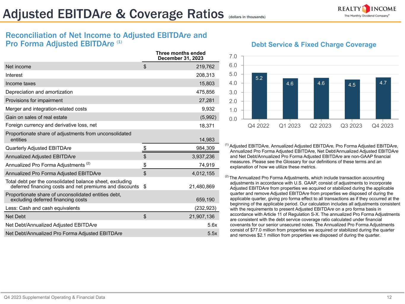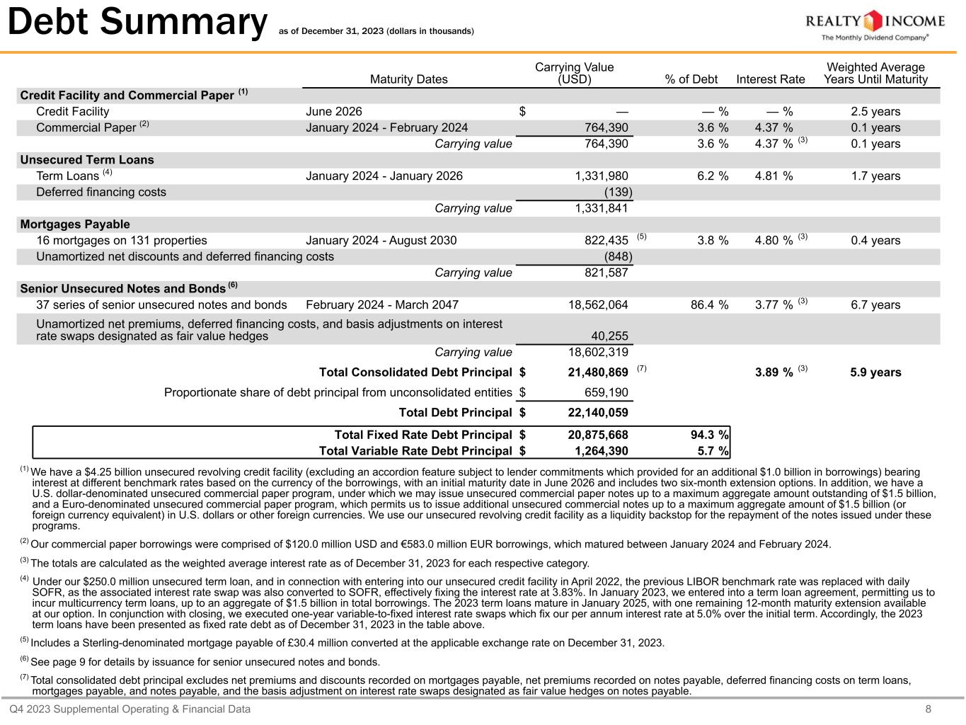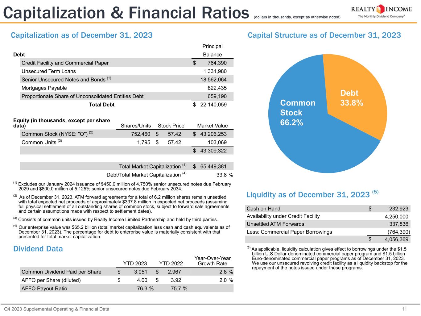 Q4 2023 Supplemental Operating & Financial Data 11 Capitalization & Financial Ratios (dollars in thousands, except as otherwise noted) Cash on Hand $ 232,923 Availability under Credit Facility 4,250,000 Unsettled ATM Forwards 337,836 Less: Commercial Paper Borrowings (764,390) $ 4,056,369 (5) As applicable, liquidity calculation gives effect to borrowings under the $1.5 billion U.S Dollar-denominated commercial paper program and $1.5 billion Euro-denominated commercial paper programs as of December 31, 2023. We use our unsecured revolving credit facility as a liquidity backstop for the repayment of the notes issued under these programs. Principal Debt Balance Credit Facility and Commercial Paper $ 764,390 Unsecured Term Loans 1,331,980 Senior Unsecured Notes and Bonds (1) 18,562,064 Mortgages Payable 822,435 Proportionate Share of Unconsolidated Entities Debt 659,190 Total Debt $ 22,140,059 Equity (in thousands, except per share data) Shares/Units Stock Price Market Value Common Stock (NYSE: "O") (2) 752,460 $ 57.42 $ 43,206,253 Common Units (3) 1,795 $ 57.42 103,069 $ 43,309,322 Total Market Capitalization (4) $ 65,449,381 Debt/Total Market Capitalization (4) 33.8 % (1) Excludes our January 2024 issuance of $450.0 million of 4.750% senior unsecured notes due February 2029 and $800.0 million of 5.125% senior unsecured notes due February 2034. (2) As of December 31, 2023, ATM forward agreements for a total of 6.2 million shares remain unsettled with total expected net proceeds of approximately $337.8 million in expected net proceeds (assuming full physical settlement of all outstanding shares of common stock, subject to forward sale agreements and certain assumptions made with respect to settlement dates). (3) Consists of common units issued by Realty Income Limited Partnership and held by third parties. (4) Our enterprise value was $65.2 billion (total market capitalization less cash and cash equivalents as of December 31, 2023). The percentage for debt to enterprise value is materially consistent with that presented for total market capitalization. Dividend Data YTD 2023 YTD 2022 Year-Over-Year Growth Rate Common Dividend Paid per Share $ 3.051 $ 2.967 2.8 % AFFO per Share (diluted) $ 4.00 $ 3.92 2.0 % AFFO Payout Ratio 76.3 % 75.7 % Liquidity as of December 31, 2023 (5) Capitalization as of December 31, 2023 Capital Structure as of December 31, 2023 Common Stock 66.2% Debt 33.8%
