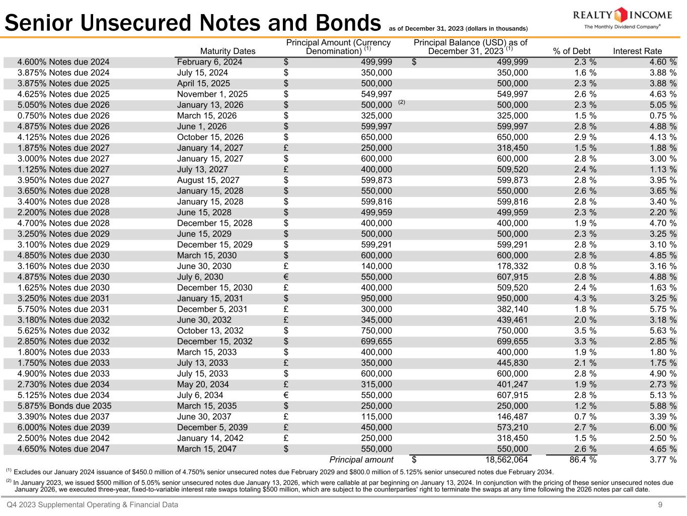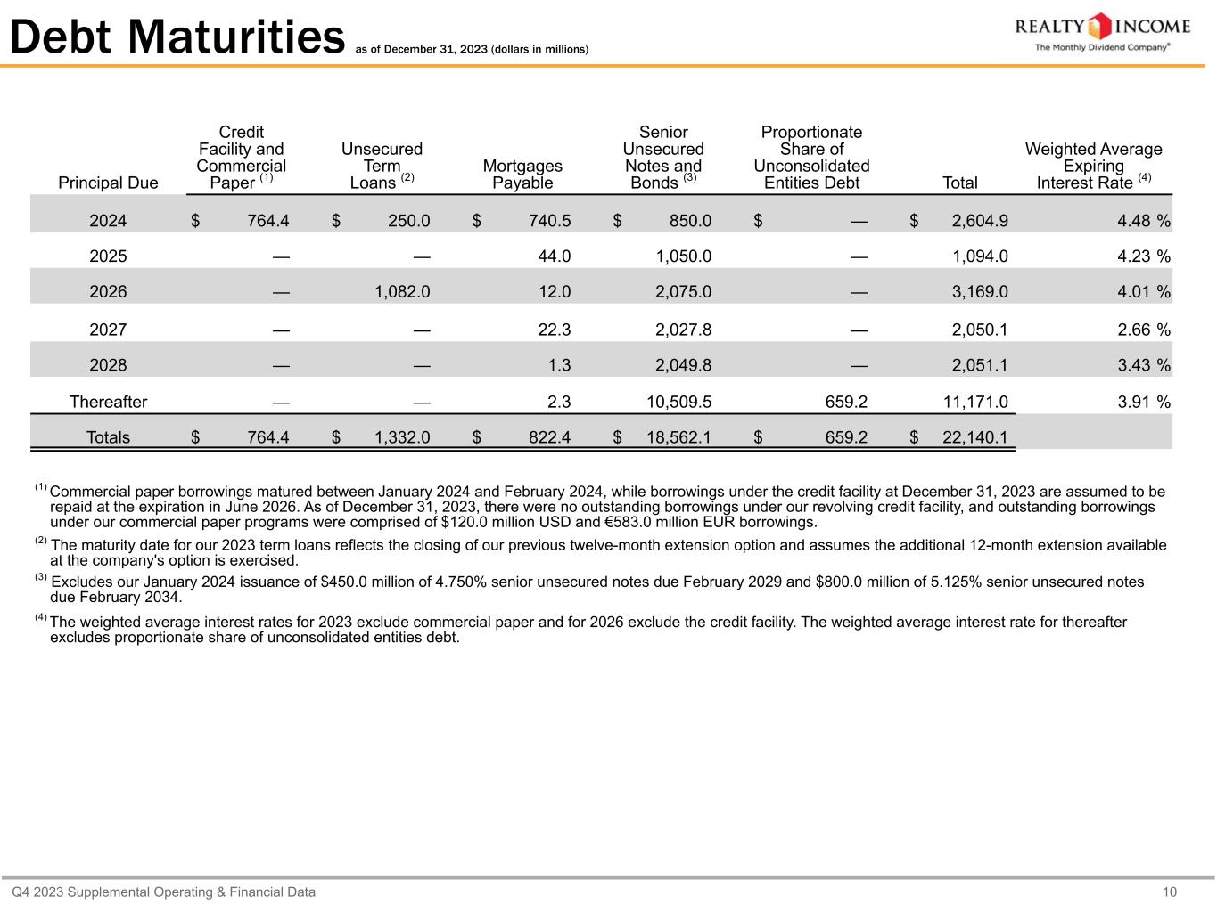 Q4 2023 Supplemental Operating & Financial Data 9 Senior Unsecured Notes and Bonds as of December 31, 2023 (dollars in thousands) Maturity Dates Principal Amount (Currency Denomination) (1) Principal Balance (USD) as of December 31, 2023 (1) % of Debt Interest Rate 4.600% Notes due 2024 February 6, 2024 $ 499,999 $ 499,999 2.3 % 4.60 % 3.875% Notes due 2024 July 15, 2024 $ 350,000 350,000 1.6 % 3.88 % 3.875% Notes due 2025 April 15, 2025 $ 500,000 500,000 2.3 % 3.88 % 4.625% Notes due 2025 November 1, 2025 $ 549,997 549,997 2.6 % 4.63 % 5.050% Notes due 2026 January 13, 2026 $ 500,000 (2) 500,000 2.3 % 5.05 % 0.750% Notes due 2026 March 15, 2026 $ 325,000 325,000 1.5 % 0.75 % 4.875% Notes due 2026 June 1, 2026 $ 599,997 599,997 2.8 % 4.88 % 4.125% Notes due 2026 October 15, 2026 $ 650,000 650,000 2.9 % 4.13 % 1.875% Notes due 2027 January 14, 2027 £ 250,000 318,450 1.5 % 1.88 % 3.000% Notes due 2027 January 15, 2027 $ 600,000 600,000 2.8 % 3.00 % 1.125% Notes due 2027 July 13, 2027 £ 400,000 509,520 2.4 % 1.13 % 3.950% Notes due 2027 August 15, 2027 $ 599,873 599,873 2.8 % 3.95 % 3.650% Notes due 2028 January 15, 2028 $ 550,000 550,000 2.6 % 3.65 % 3.400% Notes due 2028 January 15, 2028 $ 599,816 599,816 2.8 % 3.40 % 2.200% Notes due 2028 June 15, 2028 $ 499,959 499,959 2.3 % 2.20 % 4.700% Notes due 2028 December 15, 2028 $ 400,000 400,000 1.9 % 4.70 % 3.250% Notes due 2029 June 15, 2029 $ 500,000 500,000 2.3 % 3.25 % 3.100% Notes due 2029 December 15, 2029 $ 599,291 599,291 2.8 % 3.10 % 4.850% Notes due 2030 March 15, 2030 $ 600,000 600,000 2.8 % 4.85 % 3.160% Notes due 2030 June 30, 2030 £ 140,000 178,332 0.8 % 3.16 % 4.875% Notes due 2030 July 6, 2030 € 550,000 607,915 2.8 % 4.88 % 1.625% Notes due 2030 December 15, 2030 £ 400,000 509,520 2.4 % 1.63 % 3.250% Notes due 2031 January 15, 2031 $ 950,000 950,000 4.3 % 3.25 % 5.750% Notes due 2031 December 5, 2031 £ 300,000 382,140 1.8 % 5.75 % 3.180% Notes due 2032 June 30, 2032 £ 345,000 439,461 2.0 % 3.18 % 5.625% Notes due 2032 October 13, 2032 $ 750,000 750,000 3.5 % 5.63 % 2.850% Notes due 2032 December 15, 2032 $ 699,655 699,655 3.3 % 2.85 % 1.800% Notes due 2033 March 15, 2033 $ 400,000 400,000 1.9 % 1.80 % 1.750% Notes due 2033 July 13, 2033 £ 350,000 445,830 2.1 % 1.75 % 4.900% Notes due 2033 July 15, 2033 $ 600,000 600,000 2.8 % 4.90 % 2.730% Notes due 2034 May 20, 2034 £ 315,000 401,247 1.9 % 2.73 % 5.125% Notes due 2034 July 6, 2034 € 550,000 607,915 2.8 % 5.13 % 5.875% Bonds due 2035 March 15, 2035 $ 250,000 250,000 1.2 % 5.88 % 3.390% Notes due 2037 June 30, 2037 £ 115,000 146,487 0.7 % 3.39 % 6.000% Notes due 2039 December 5, 2039 £ 450,000 573,210 2.7 % 6.00 % 2.500% Notes due 2042 January 14, 2042 £ 250,000 318,450 1.5 % 2.50 % 4.650% Notes due 2047 March 15, 2047 $ 550,000 550,000 2.6 % 4.65 % Principal amount $ 18,562,064 86.4 % 3.77 % (1) Excludes our January 2024 issuance of $450.0 million of 4.750% senior unsecured notes due February 2029 and $800.0 million of 5.125% senior unsecured notes due February 2034. (2) In January 2023, we issued $500 million of 5.05% senior unsecured notes due January 13, 2026, which were callable at par beginning on January 13, 2024. In conjunction with the pricing of these senior unsecured notes due January 2026, we executed three-year, fixed-to-variable interest rate swaps totaling $500 million, which are subject to the counterparties' right to terminate the swaps at any time following the 2026 notes par call date.