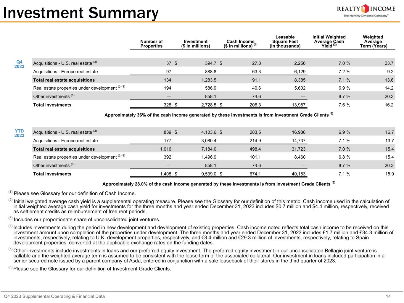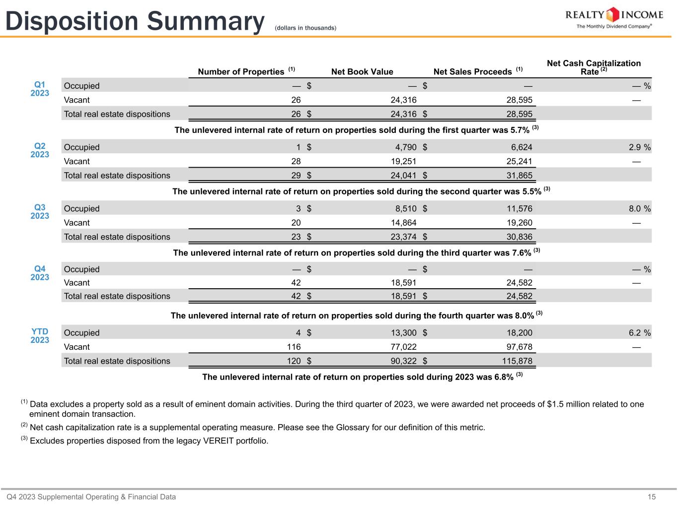 Q4 2023 Supplemental Operating & Financial Data 14 Investment Summary Number of Properties Investment ($ in millions) Cash Income ($ in millions) (1) Leasable Square Feet (in thousands) Initial Weighted Average Cash Yield (2) Weighted Average Term (Years) Q4 2023 Acquisitions - U.S. real estate (3) 37 $ 394.7 $ 27.8 2,256 7.0 % 23.7 Acquisitions - Europe real estate 97 888.8 63.3 6,129 7.2 % 9.2 Total real estate acquisitions 134 1,283.5 91.1 8,385 7.1 % 13.6 Real estate properties under development (3)(4) 194 586.9 40.6 5,602 6.9 % 14.2 Other investments (5) — 858.1 74.6 — 8.7 % 20.3 Total investments 328 $ 2,728.5 $ 206.3 13,987 7.6 % 16.2 Approximately 36% of the cash income generated by these investments is from Investment Grade Clients (6) YTD 2023 Acquisitions - U.S. real estate (3) 839 $ 4,103.6 $ 283.5 16,986 6.9 % 16.7 Acquisitions - Europe real estate 177 3,080.4 214.9 14,737 7.1 % 13.7 Total real estate acquisitions 1,016 7,184.0 498.4 31,723 7.0 % 15.4 Real estate properties under development (3)(4) 392 1,496.9 101.1 8,460 6.8 % 15.4 Other investments (5) — 858.1 74.6 — 8.7 % 20.3 Total investments 1,408 $ 9,539.0 $ 674.1 40,183 7.1 % 15.9 Approximately 28.0% of the cash income generated by these investments is from Investment Grade Clients (6) (1) Please see Glossary for our definition of Cash Income. (2) Initial weighted average cash yield is a supplemental operating measure. Please see the Glossary for our definition of this metric. Cash income used in the calculation of initial weighted average cash yield for investments for the three months and year ended December 31, 2023 includes $0.7 million and $4.4 million, respectively, received as settlement credits as reimbursement of free rent periods. (3) Includes our proportionate share of unconsolidated joint ventures. (4) Includes investments during the period in new development and development of existing properties. Cash income noted reflects total cash income to be received on this investment amount upon completion of the properties under development. The three months and year ended December 31, 2023 includes £1.7 million and £34.3 million of investments, respectively, relating to U.K. development properties, respectively, and €3.4 million and €29.3 million of investments, respectively, relating to Spain development properties, converted at the applicable exchange rates on the funding dates. (5) Other investments include investments in loans and our preferred equity investment. The preferred equity investment in our unconsolidated Bellagio joint venture is callable and the weighted average term is assumed to be consistent with the lease term of the associated collateral. Our investment in loans included participation in a senior secured note issued by a parent company of Asda, entered in conjunction with a sale leaseback of their stores in the third quarter of 2023. (6) Please see the Glossary for our definition of Investment Grade Clients.