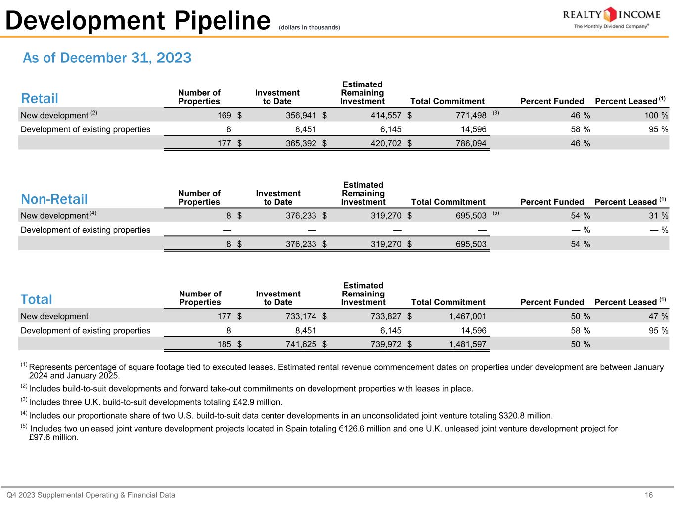 Q4 2023 Supplemental Operating & Financial Data 16 Development Pipeline (dollars in thousands) Retail Number of Properties Investment to Date Estimated Remaining Investment Total Commitment Percent Funded Percent Leased (1) New development (2) 169 $ 356,941 $ 414,557 $ 771,498 (3) 46 % 100 % Development of existing properties 8 8,451 6,145 14,596 58 % 95 % 177 $ 365,392 $ 420,702 $ 786,094 46 % Non-Retail Number of Properties Investment to Date Estimated Remaining Investment Total Commitment Percent Funded Percent Leased (1) New development (4) 8 $ 376,233 $ 319,270 $ 695,503 (5) 54 % 31 % Development of existing properties — — — — — % — % 8 $ 376,233 $ 319,270 $ 695,503 54 % Total Number of Properties Investment to Date Estimated Remaining Investment Total Commitment Percent Funded Percent Leased (1) New development 177 $ 733,174 $ 733,827 $ 1,467,001 50 % 47 % Development of existing properties 8 8,451 6,145 14,596 58 % 95 % 185 $ 741,625 $ 739,972 $ 1,481,597 50 % (1) Represents percentage of square footage tied to executed leases. Estimated rental revenue commencement dates on properties under development are between January 2024 and January 2025. (2) Includes build-to-suit developments and forward take-out commitments on development properties with leases in place. (3) Includes three U.K. build-to-suit developments totaling £42.9 million. (4) Includes our proportionate share of two U.S. build-to-suit data center developments in an unconsolidated joint venture totaling $320.8 million. (5) Includes two unleased joint venture development projects located in Spain totaling €126.6 million and one U.K. unleased joint venture development project for £97.6 million. As of December 31, 2023