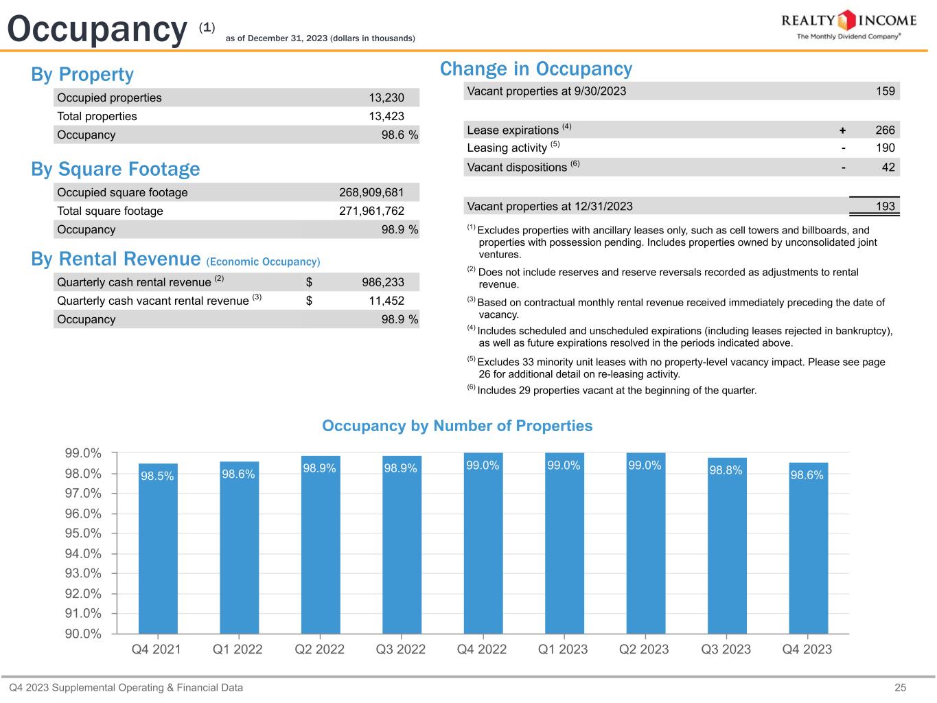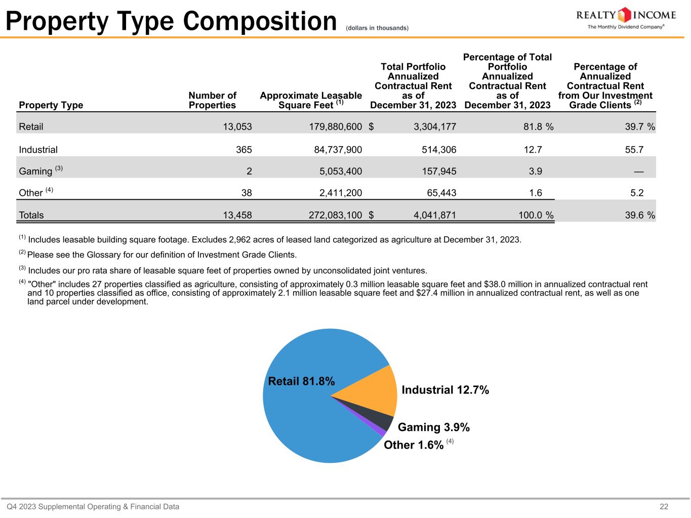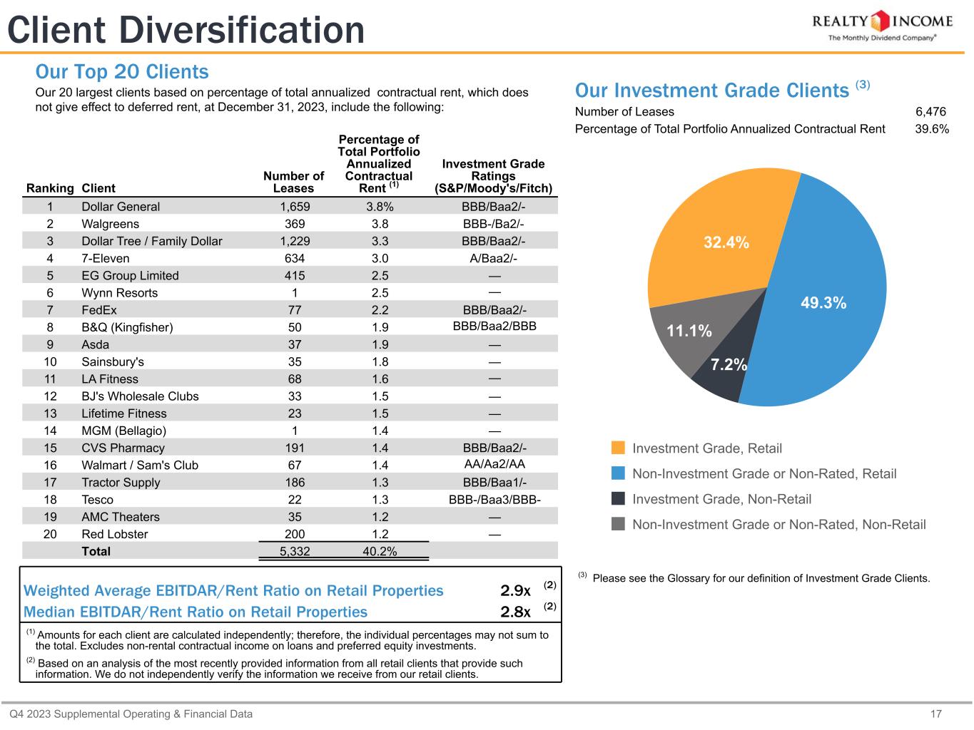 Q4 2023 Supplemental Operating & Financial Data 3 One Team Senior Management Neil M. Abraham, EVP, Chief Strategy Officer, Realty Income International - President Michelle Bushore, EVP, Chief Legal Officer, General Counsel and Secretary Mark E. Hagan, EVP, Chief Investment Officer Shannon Kehle, EVP, Chief People Officer Jonathan Pong, EVP, Chief Financial Officer and Treasurer Sumit Roy, President, Chief Executive Officer Gregory J. Whyte, EVP, Chief Operating Officer Credit Ratings Senior Unsecured Outlook Commercial Paper Moody’s A3 Stable P-2 Standard & Poor’s A- Stable A-2 Dividend Information as of February 2024 ▪ Current annualized dividend of $3.078 per share ▪ Compound average annual dividend growth rate of approximately 4.3% ▪ 644 consecutive monthly dividends declared ▪ 105 consecutive quarterly dividend increases Corporate Headquarters Phoenix Office 11995 El Camino Real 2325 E. Camelback Rd, 9th Floor San Diego, CA 92130 Phoenix, AZ 85016 Phone: +1 (858) 284-5000 Phone: +1 (602) 778-6000 Website: www.realtyincome.com London Office Amsterdam Office 19 Wells Street Strawinskylaan 3051 London, United Kingdom W1T 3PQ Atrium Building 4th Floor Phone: +44 (20) 3931 6858 Amsterdam, Netherlands 1077 ZX Corporate Overview Transfer Agent Computershare Phone: (877) 218-2434 Website: www.computershare.com (1) Total annualized contractual rent is a supplemental operating measure. Please see the Glossary for our definition, reconciliation, and an explanation of how we utilize this metric. (2) Total annualized contractual rent includes 0.6% of rent from clients accounted for on a cash basis. December 31, 2023 Closing price $ 57.42 Shares and units outstanding 754,255 Market value of common equity $ 43,309,322 Total market capitalization $ 65,449,381 Corporate Profile Realty Income, The Monthly Dividend Company®, is an S&P 500 company and member of the S&P 500 Dividend Aristocrats® index. We invest in people and places to deliver dependable monthly dividends that increase over time. For over 55 years, we have been acquiring and managing freestanding commercial real estate that generates rental revenue under long-term net lease agreements and supports our monthly dividend. Portfolio Overview As of December 31, 2023, we owned or held interests in 13,458 properties, with approximately 272.1 million square feet of leasable space. Our properties are leased to 1,326 different clients doing business in 86 industries. Also as of December 31, 2023, approximately 81.8% of our total annualized contractual rent(1) was generated from retail properties, 12.7% from industrial properties, 3.9% from gaming properties, and the remaining 1.6% from other property types. Our physical occupancy as of December 31, 2023 was 98.6%, with a weighted average remaining lease term of approximately 9.8 years. Total annualized contractual rent on our leases as of December 31, 2023 was $4.04 billion(2). Common Stock Our common stock is traded on the New York Stock Exchange under the symbol "O“ (in thousands, except per share amount).