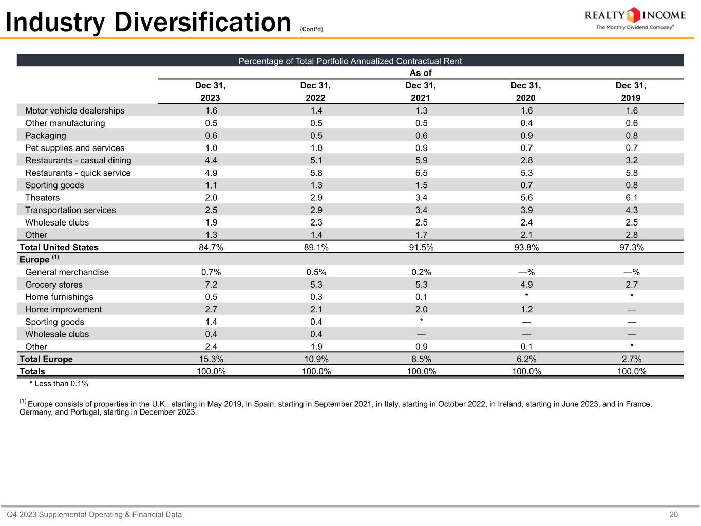 Q4 2023 Supplemental Operating & Financial Data 18 (1)Top 10 Industries Percentage of Total Portfolio Annualized Contractual Rent As of Dec 31, Dec 31, Dec 31, Dec 31, Dec 31, 2023 2022 2021 2020 2019 Grocery 11.4% 10.0% 10.2% 9.8% 7.9% Convenience Stores 10.2 8.6 9.1 11.9 12.3 Dollar Stores 7.1 7.4 7.5 7.6 7.9 Home Improvement 5.9 5.6 5.1 4.3 2.9 Drug Stores 5.5 5.7 6.6 8.2 8.8 Restaurants-Quick Service 5.2 6.0 6.6 5.3 5.8 Restaurants-Casual Dining 4.4 5.1 5.9 2.8 3.2 Automotive Service 4.3 4.0 3.2 2.7 2.6 Health and Fitness 3.9 4.4 4.7 6.7 7.0 Gaming 3.9 2.9 — — — (1) The presentation of Top 10 Industries combines total portfolio contractual rent from the U.S. and Europe. Europe consists of properties in the U.K., starting in May 2019, in Spain, starting in September 2021, in Italy, starting in October 2022, in Ireland, starting in June 2023, and in France, Germany, and Portugal, starting in December 2023. Certain of the Top 10 Industries include both U.S. and Europe percentages for which the Europe percentages are included in the 'Europe-other' classification in the Industry Diversification table beginning on page 19.