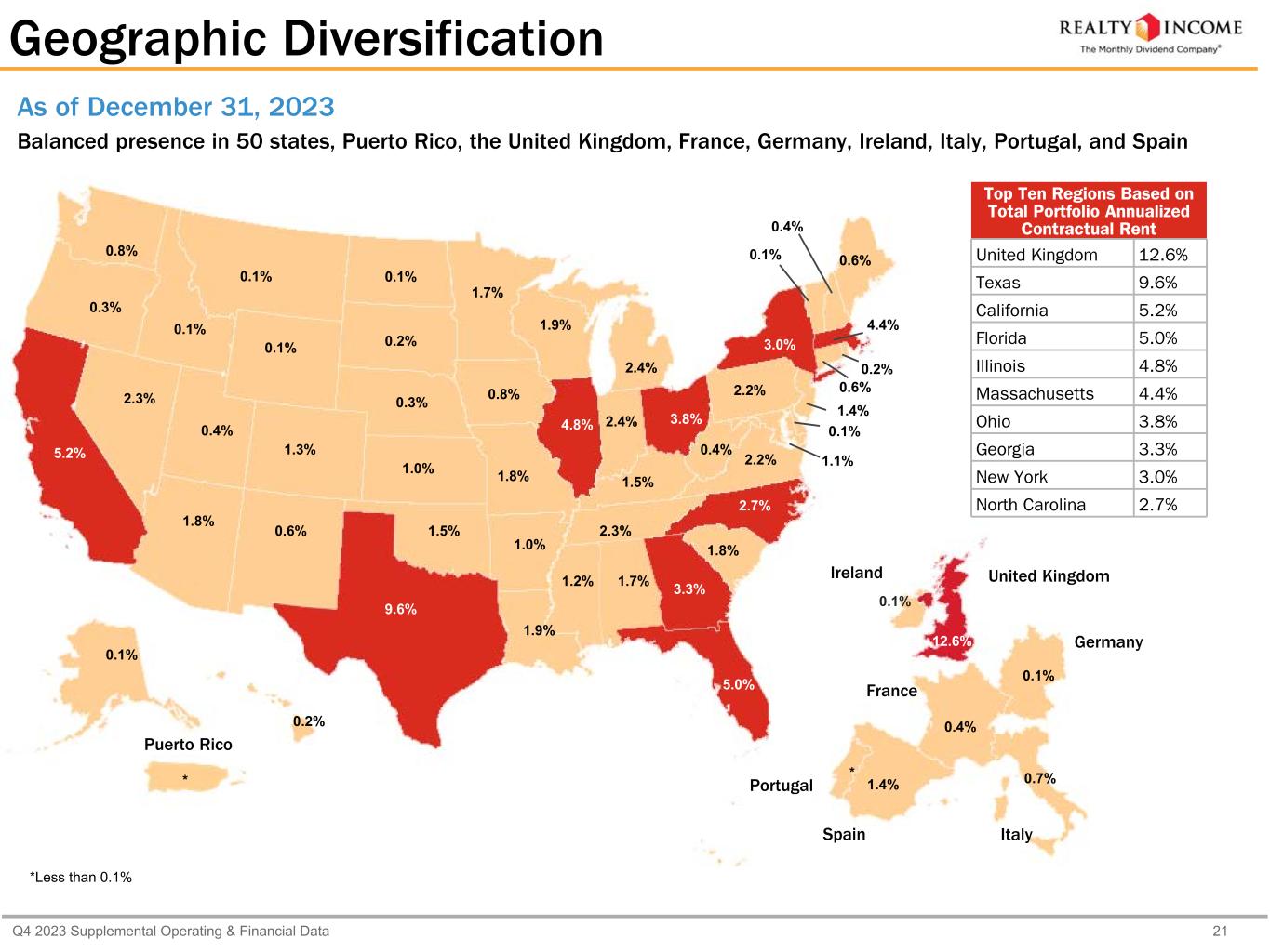 Q4 2023 Supplemental Operating & Financial Data 20 Percentage of Total Portfolio Annualized Contractual Rent As of Dec 31, Dec 31, Dec 31, Dec 31, Dec 31, 2023 2022 2021 2020 2019 Motor vehicle dealerships 1.6 1.4 1.3 1.6 1.6 Other manufacturing 0.5 0.5 0.5 0.4 0.6 Packaging 0.6 0.5 0.6 0.9 0.8 Pet supplies and services 1.0 1.0 0.9 0.7 0.7 Restaurants - casual dining 4.4 5.1 5.9 2.8 3.2 Restaurants - quick service 4.9 5.8 6.5 5.3 5.8 Sporting goods 1.1 1.3 1.5 0.7 0.8 Theaters 2.0 2.9 3.4 5.6 6.1 Transportation services 2.5 2.9 3.4 3.9 4.3 Wholesale clubs 1.9 2.3 2.5 2.4 2.5 Other 1.3 1.4 1.7 2.1 2.8 Total United States 84.7% 89.1% 91.5% 93.8% 97.3% Europe (1) General merchandise 0.7% 0.5% 0.2% —% —% Grocery stores 7.2 5.3 5.3 4.9 2.7 Home furnishings 0.5 0.3 0.1 * * Home improvement 2.7 2.1 2.0 1.2 — Sporting goods 1.4 0.4 * — — Wholesale clubs 0.4 0.4 — — — Other 2.4 1.9 0.9 0.1 * Total Europe 15.3% 10.9% 8.5% 6.2% 2.7% Totals 100.0% 100.0% 100.0% 100.0% 100.0% * Less than 0.1% (1) Europe consists of properties in the U.K., starting in May 2019, in Spain, starting in September 2021, in Italy, starting in October 2022, in Ireland, starting in June 2023, and in France, Germany, and Portugal, starting in December 2023. Industry Diversification (Cont'd)