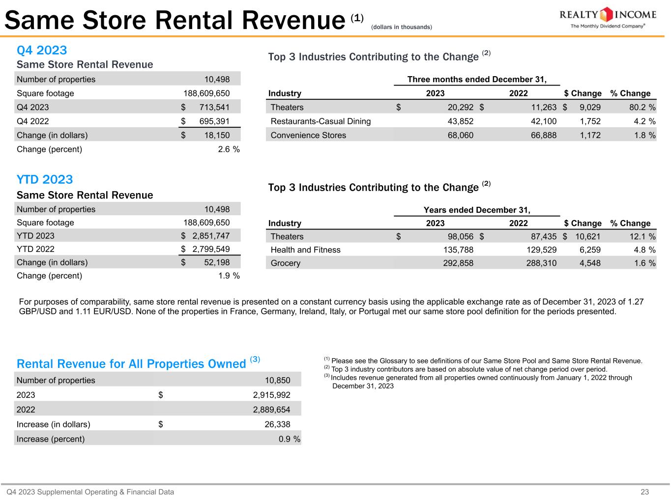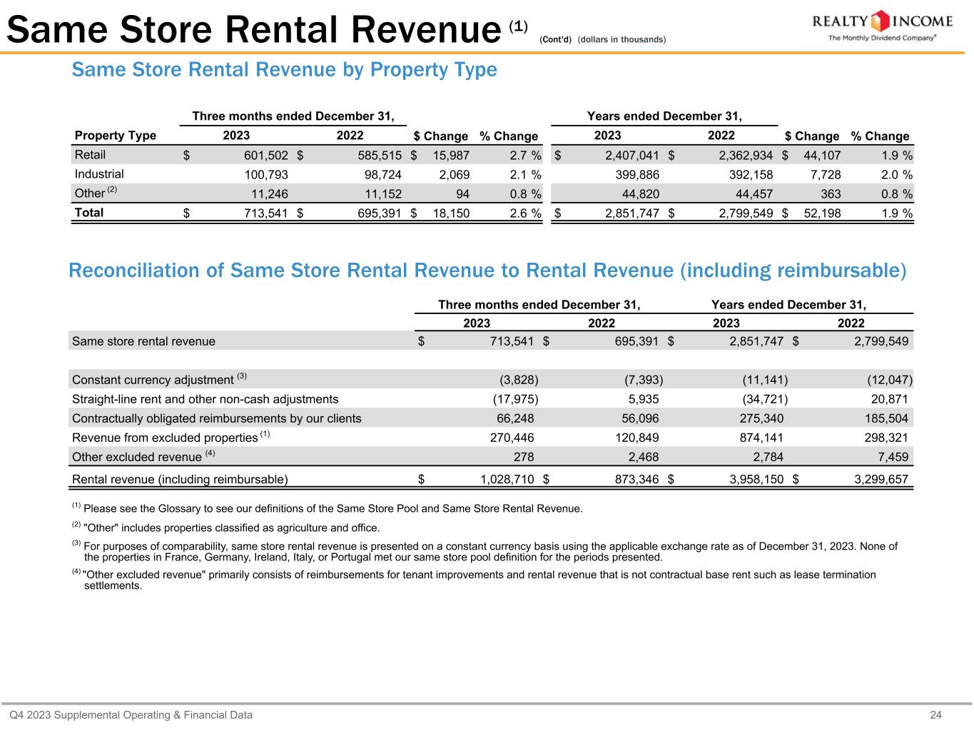 Q4 2023 Supplemental Operating & Financial Data 23 Q4 2023 Same Store Rental Revenue Number of properties 10,498 Square footage 188,609,650 Q4 2023 $ 713,541 Q4 2022 $ 695,391 Change (in dollars) $ 18,150 Change (percent) 2.6 % YTD 2023 Same Store Rental Revenue Number of properties 10,498 Square footage 188,609,650 YTD 2023 $ 2,851,747 YTD 2022 $ 2,799,549 Change (in dollars) $ 52,198 Change (percent) 1.9 % Same Store Rental Revenue (1) (dollars in thousands) Top 3 Industries Contributing to the Change (2) Three months ended December 31, Industry 2023 2022 $ Change % Change Theaters $ 20,292 $ 11,263 $ 9,029 80.2 % Restaurants-Casual Dining 43,852 42,100 1,752 4.2 % Convenience Stores 68,060 66,888 1,172 1.8 % Top 3 Industries Contributing to the Change (2) Years ended December 31, Industry 2023 2022 $ Change % Change Theaters $ 98,056 $ 87,435 $ 10,621 12.1 % Health and Fitness 135,788 129,529 6,259 4.8 % Grocery 292,858 288,310 4,548 1.6 % For purposes of comparability, same store rental revenue is presented on a constant currency basis using the applicable exchange rate as of December 31, 2023 of 1.27 GBP/USD and 1.11 EUR/USD. None of the properties in France, Germany, Ireland, Italy, or Portugal met our same store pool definition for the periods presented. Rental Revenue for All Properties Owned (3) Number of properties 10,850 2023 $ 2,915,992 2022 2,889,654 Increase (in dollars) $ 26,338 Increase (percent) 0.9 % (1) Please see the Glossary to see definitions of our Same Store Pool and Same Store Rental Revenue. (2) Top 3 industry contributors are based on absolute value of net change period over period. (3) Includes revenue generated from all properties owned continuously from January 1, 2022 through December 31, 2023