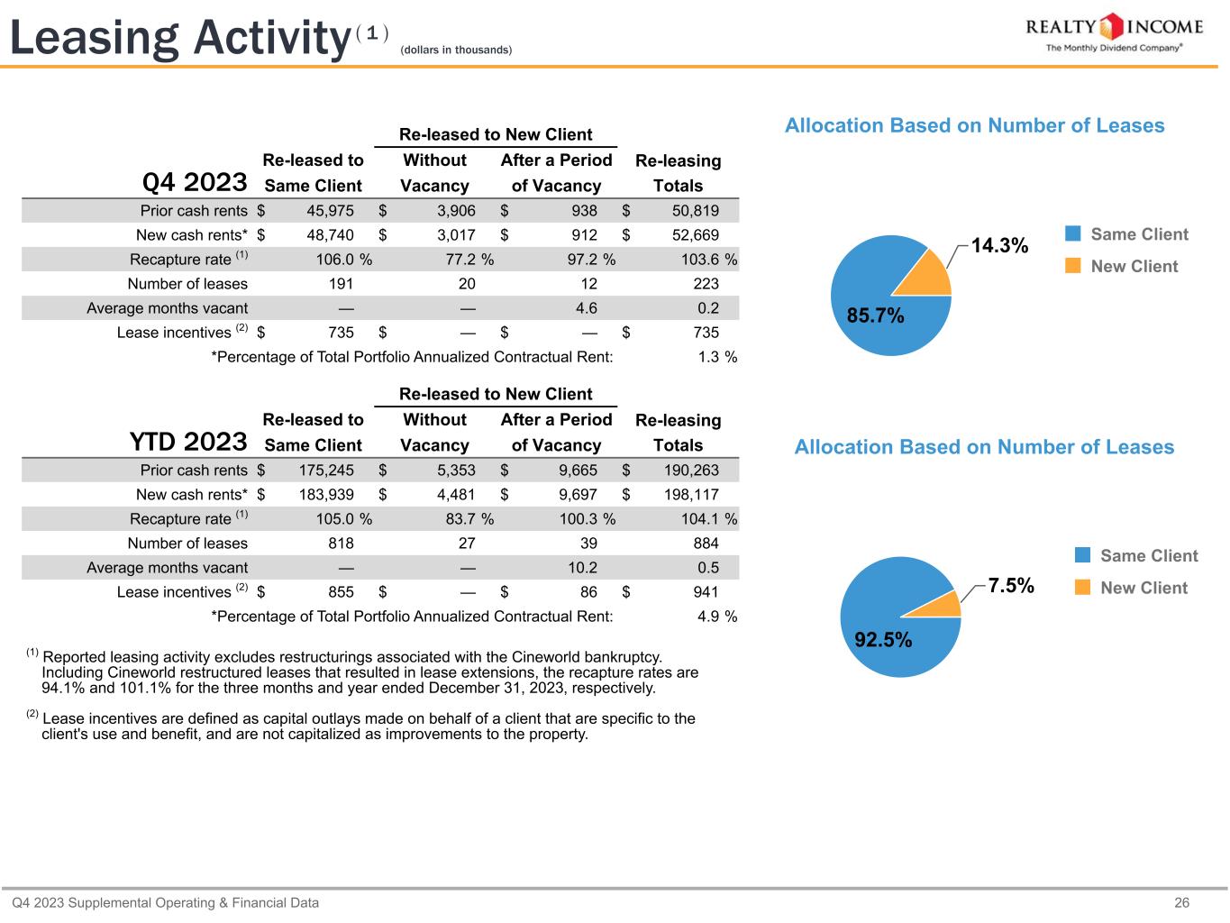 Q4 2023 Supplemental Operating & Financial Data 25 By Property Occupied properties 13,230 Total properties 13,423 Occupancy 98.6 % By Square Footage Occupied square footage 268,909,681 Total square footage 271,961,762 Occupancy 98.9 % By Rental Revenue (Economic Occupancy) Quarterly cash rental revenue (2) $ 986,233 Quarterly cash vacant rental revenue (3) $ 11,452 Occupancy 98.9 % Change in Occupancy Vacant properties at 9/30/2023   159 Lease expirations (4) + 266 Leasing activity (5) - 190 Vacant dispositions (6) - 42 Vacant properties at 12/31/2023   193 (1) Excludes properties with ancillary leases only, such as cell towers and billboards, and properties with possession pending. Includes properties owned by unconsolidated joint ventures. (2) Does not include reserves and reserve reversals recorded as adjustments to rental revenue. (3) Based on contractual monthly rental revenue received immediately preceding the date of vacancy. (4) Includes scheduled and unscheduled expirations (including leases rejected in bankruptcy), as well as future expirations resolved in the periods indicated above. (5) Excludes 33 minority unit leases with no property-level vacancy impact. Please see page 26 for additional detail on re-leasing activity. (6) Includes 29 properties vacant at the beginning of the quarter. Occupancy (1) as of December 31, 2023 (dollars in thousands) Occupancy by Number of Properties 98.5% 98.6% 98.9% 98.9% 99.0% 99.0% 99.0% 98.8% 98.6% Q4 2021 Q1 2022 Q2 2022 Q3 2022 Q4 2022 Q1 2023 Q2 2023 Q3 2023 Q4 2023 90.0% 91.0% 92.0% 93.0% 94.0% 95.0% 96.0% 97.0% 98.0% 99.0%