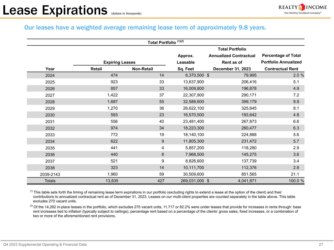 Q4 2023 Supplemental Operating & Financial Data 27 (1) This table sets forth the timing of remaining lease term expirations in our portfolio (excluding rights to extend a lease at the option of the client) and their contributions to annualized contractual rent as of December 31, 2023. Leases on our multi-client properties are counted separately in the table above. This table excludes 270 vacant units. (2) Of the 14,262 in-place leases in the portfolio, which excludes 270 vacant units, 11,717 or 82.2% were under leases that provide for increases in rents through: base rent increases tied to inflation (typically subject to ceilings), percentage rent based on a percentage of the clients’ gross sales, fixed increases, or a combination of two or more of the aforementioned rent provisions. Our leases have a weighted average remaining lease term of approximately 9.8 years. Lease Expirations (dollars in thousands) Total Portfolio (1)(2) Total Portfolio Approx. Annualized Contractual Percentage of Total Expiring Leases Leasable Rent as of Portfolio Annualized Year Retail Non-Retail Sq. Feet December 31, 2023 Contractual Rent 2024 474 14 6,370,500 $ 79,995 2.0 % 2025 923 33 13,637,900 206,416 5.1 2026 857 33 16,009,800 196,878 4.9 2027 1,422 37 22,307,900 290,171 7.2 2028 1,687 55 32,588,600 399,179 9.9 2029 1,270 36 26,622,100 325,645 8.1 2030 593 23 16,570,500 193,642 4.8 2031 556 40 23,481,400 267,873 6.6 2032 974 34 18,223,300 260,477 6.3 2033 772 19 18,140,100 224,888 5.6 2034 622 9 11,805,300 231,472 5.7 2035 441 4 5,857,200 118,280 2.9 2036 440 8 7,968,500 145,275 3.6 2037 521 9 8,826,600 137,739 3.4 2038 323 14 10,111,700 112,376 2.8 2039-2143 1,960 59 30,509,600 851,565 21.1 Totals 13,835 427 269,031,000 $ 4,041,871 100.0 %