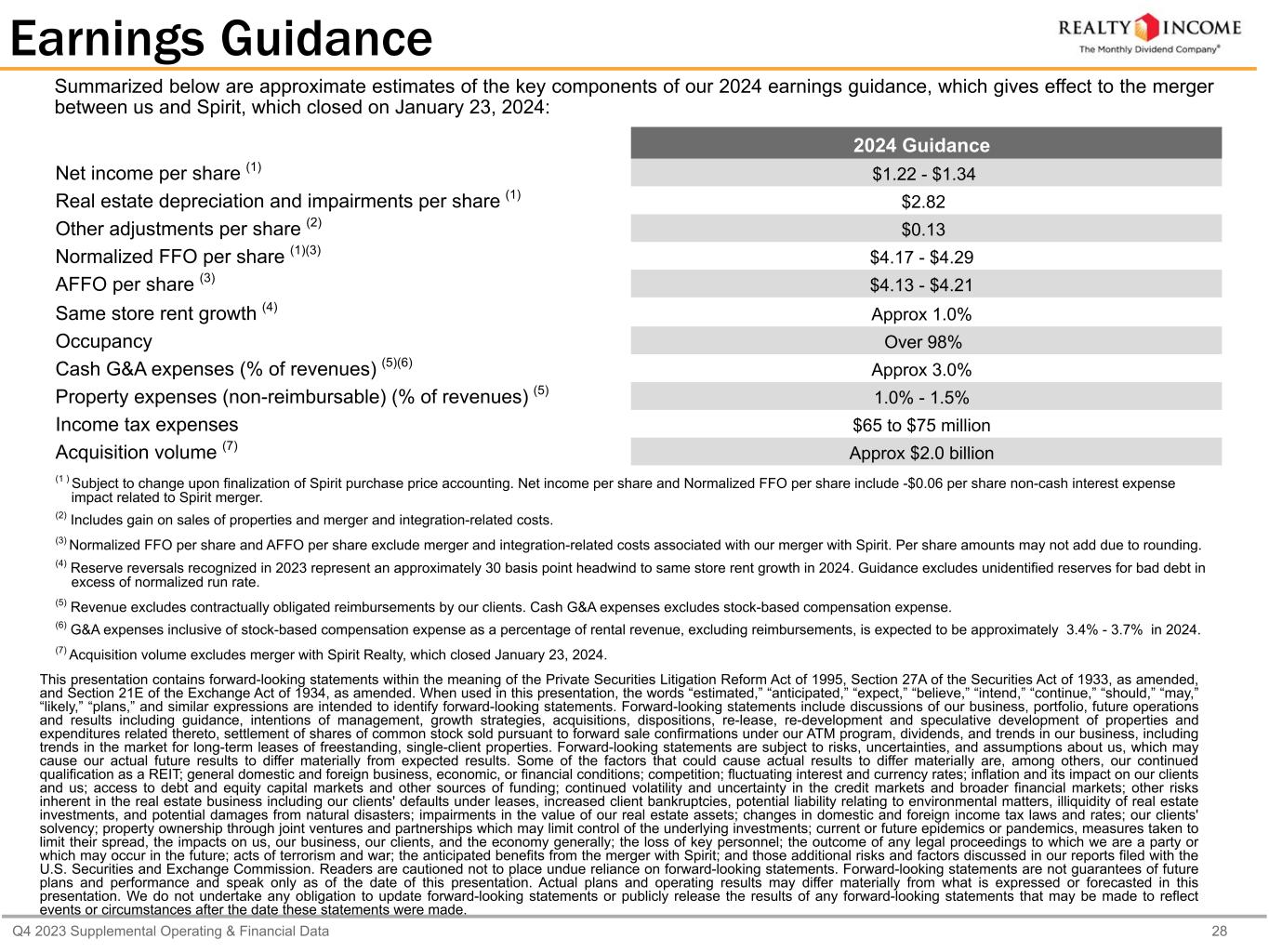 Q4 2023 Supplemental Operating & Financial Data 28 Earnings Guidance Summarized below are approximate estimates of the key components of our 2024 earnings guidance, which gives effect to the merger between us and Spirit, which closed on January 23, 2024: 2024 Guidance Net income per share (1) $1.22 - $1.34 Real estate depreciation and impairments per share (1) $2.82 Other adjustments per share (2) $0.13 Normalized FFO per share (1)(3) $4.17 - $4.29 AFFO per share (3) $4.13 - $4.21 Same store rent growth (4) Approx 1.0% Occupancy Over 98% Cash G&A expenses (% of revenues) (5)(6) Approx 3.0% Property expenses (non-reimbursable) (% of revenues) (5) 1.0% - 1.5% Income tax expenses $65 to $75 million Acquisition volume (7) Approx $2.0 billion (1 ) Subject to change upon finalization of Spirit purchase price accounting. Net income per share and Normalized FFO per share include -$0.06 per share non-cash interest expense impact related to Spirit merger. (2) Includes gain on sales of properties and merger and integration-related costs. (3) Normalized FFO per share and AFFO per share exclude merger and integration-related costs associated with our merger with Spirit. Per share amounts may not add due to rounding. (4) Reserve reversals recognized in 2023 represent an approximately 30 basis point headwind to same store rent growth in 2024. Guidance excludes unidentified reserves for bad debt in excess of normalized run rate. (5) Revenue excludes contractually obligated reimbursements by our clients. Cash G&A expenses excludes stock-based compensation expense. (6) G&A expenses inclusive of stock-based compensation expense as a percentage of rental revenue, excluding reimbursements, is expected to be approximately 3.4% - 3.7% in 2024. (7) Acquisition volume excludes merger with Spirit Realty, which closed January 23, 2024. This presentation contains forward-looking statements within the meaning of the Private Securities Litigation Reform Act of 1995, Section 27A of the Securities Act of 1933, as amended, and Section 21E of the Exchange Act of 1934, as amended. When used in this presentation, the words “estimated,” “anticipated,” “expect,” “believe,” “intend,” “continue,” “should,” “may,” “likely,” “plans,” and similar expressions are intended to identify forward-looking statements. Forward-looking statements include discussions of our business, portfolio, future operations and results including guidance, intentions of management, growth strategies, acquisitions, dispositions, re-lease, re-development and speculative development of properties and expenditures related thereto, settlement of shares of common stock sold pursuant to forward sale confirmations under our ATM program, dividends, and trends in our business, including trends in the market for long-term leases of freestanding, single-client properties. Forward-looking statements are subject to risks, uncertainties, and assumptions about us, which may cause our actual future results to differ materially from expected results. Some of the factors that could cause actual results to differ materially are, among others, our continued qualification as a REIT; general domestic and foreign business, economic, or financial conditions; competition; fluctuating interest and currency rates; inflation and its impact on our clients and us; access to debt and equity capital markets and other sources of funding; continued volatility and uncertainty in the credit markets and broader financial markets; other risks inherent in the real estate business including our clients' defaults under leases, increased client bankruptcies, potential liability relating to environmental matters, illiquidity of real estate investments, and potential damages from natural disasters; impairments in the value of our real estate assets; changes in domestic and foreign income tax laws and rates; our clients' solvency; property ownership through joint ventures and partnerships which may limit control of the underlying investments; current or future epidemics or pandemics, measures taken to limit their spread, the impacts on us, our business, our clients, and the economy generally; the loss of key personnel; the outcome of any legal proceedings to which we are a party or which may occur in the future; acts of terrorism and war; the anticipated benefits from the merger with Spirit; and those additional risks and factors discussed in our reports filed with the U.S. Securities and Exchange Commission. Readers are cautioned not to place undue reliance on forward-looking statements. Forward-looking statements are not guarantees of future plans and performance and speak only as of the date of this presentation. Actual plans and operating results may differ materially from what is expressed or forecasted in this presentation. We do not undertake any obligation to update forward-looking statements or publicly release the results of any forward-looking statements that may be made to reflect events or circumstances after the date these statements were made.
