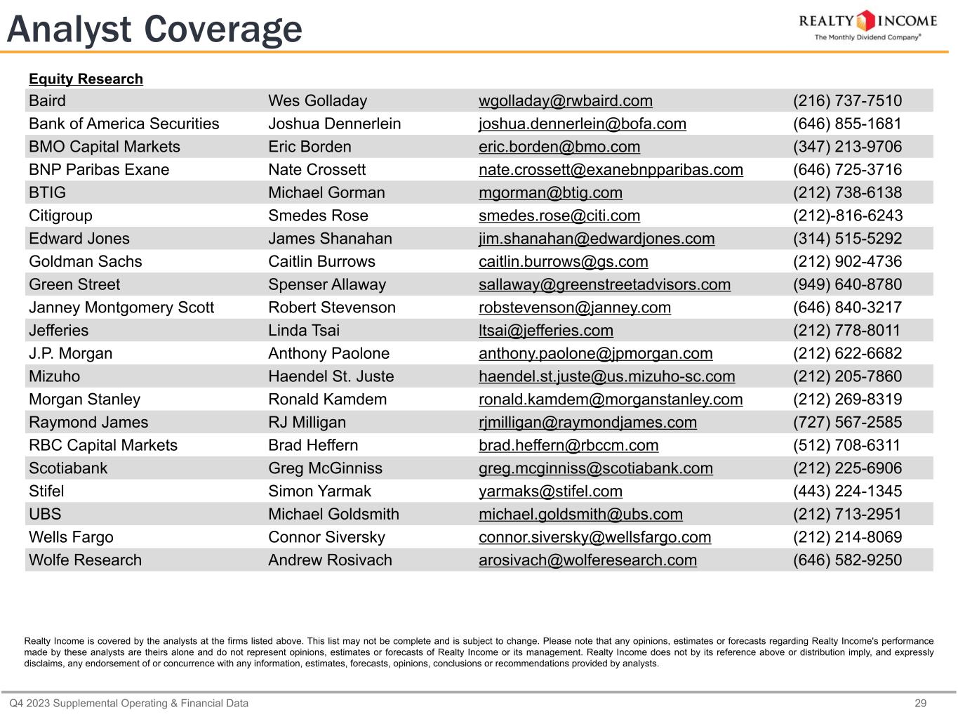 Q4 2023 Supplemental Operating & Financial Data 29 Analyst Coverage Equity Research Baird Wes Golladay wgolladay@rwbaird.com (216) 737-7510 Bank of America Securities Joshua Dennerlein joshua.dennerlein@bofa.com (646) 855-1681 BMO Capital Markets Eric Borden eric.borden@bmo.com (347) 213-9706 BNP Paribas Exane Nate Crossett nate.crossett@exanebnpparibas.com (646) 725-3716 BTIG Michael Gorman mgorman@btig.com (212) 738-6138 Citigroup Smedes Rose smedes.rose@citi.com (212)-816-6243 Edward Jones James Shanahan jim.shanahan@edwardjones.com (314) 515-5292 Goldman Sachs Caitlin Burrows caitlin.burrows@gs.com (212) 902-4736 Green Street Spenser Allaway sallaway@greenstreetadvisors.com (949) 640-8780 Janney Montgomery Scott Robert Stevenson robstevenson@janney.com (646) 840-3217 Jefferies Linda Tsai ltsai@jefferies.com (212) 778-8011 J.P. Morgan Anthony Paolone anthony.paolone@jpmorgan.com (212) 622-6682 Mizuho Haendel St. Juste haendel.st.juste@us.mizuho-sc.com (212) 205-7860 Morgan Stanley Ronald Kamdem ronald.kamdem@morganstanley.com (212) 269-8319 Raymond James RJ Milligan rjmilligan@raymondjames.com (727) 567-2585 RBC Capital Markets Brad Heffern brad.heffern@rbccm.com (512) 708-6311 Scotiabank Greg McGinniss greg.mcginniss@scotiabank.com (212) 225-6906 Stifel Simon Yarmak yarmaks@stifel.com (443) 224-1345 UBS Michael Goldsmith michael.goldsmith@ubs.com (212) 713-2951 Wells Fargo Connor Siversky connor.siversky@wellsfargo.com (212) 214-8069 Wolfe Research Andrew Rosivach arosivach@wolferesearch.com (646) 582-9250 Realty Income is covered by the analysts at the firms listed above. This list may not be complete and is subject to change. Please note that any opinions, estimates or forecasts regarding Realty Income's performance made by these analysts are theirs alone and do not represent opinions, estimates or forecasts of Realty Income or its management. Realty Income does not by its reference above or distribution imply, and expressly disclaims, any endorsement of or concurrence with any information, estimates, forecasts, opinions, conclusions or recommendations provided by analysts.