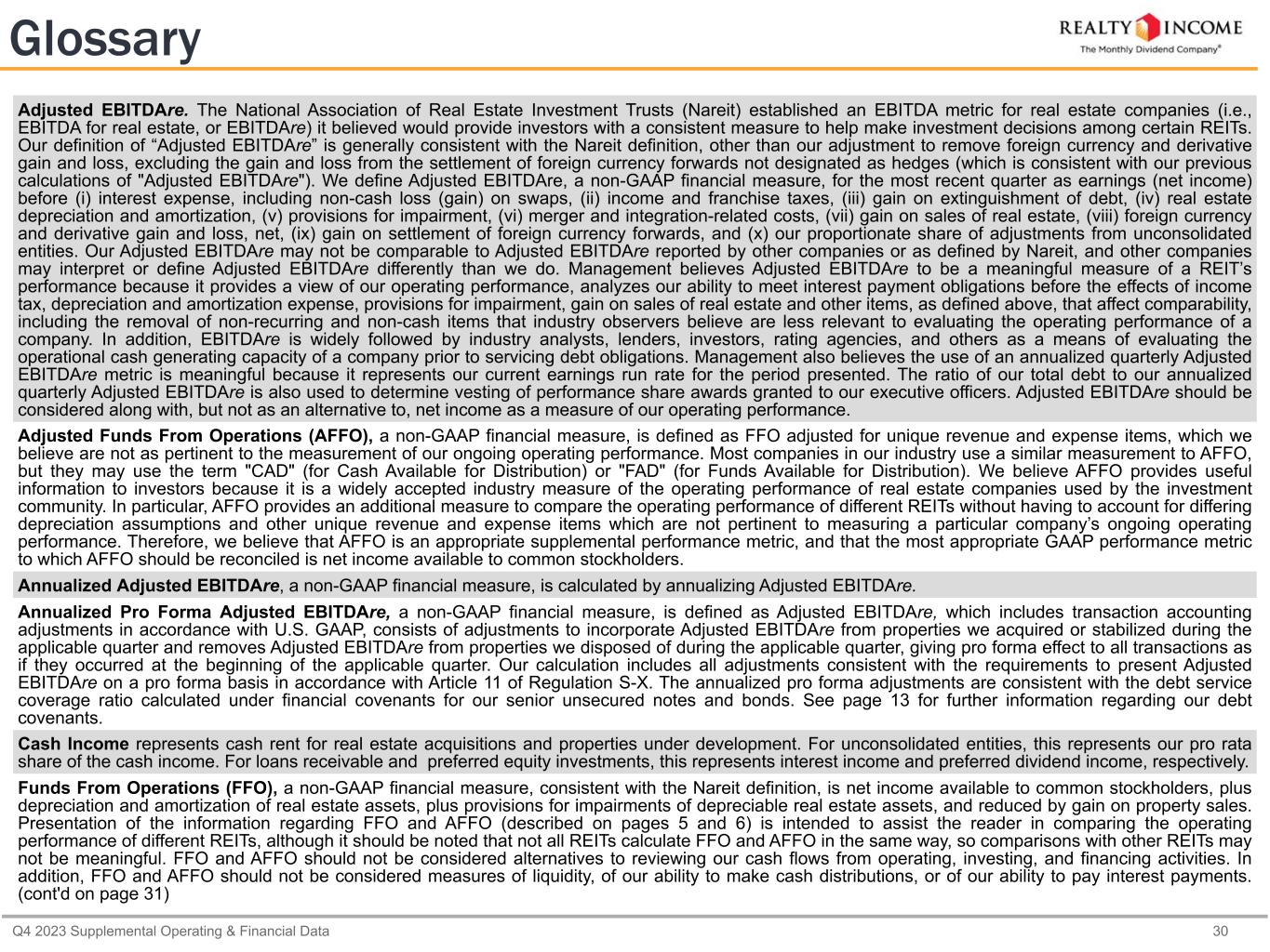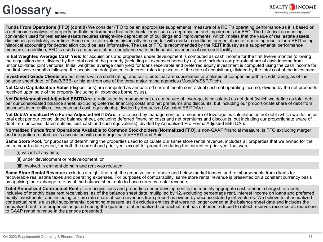 Q4 2023 Supplemental Operating & Financial Data 30 Glossary Adjusted EBITDAre. The National Association of Real Estate Investment Trusts (Nareit) established an EBITDA metric for real estate companies (i.e., EBITDA for real estate, or EBITDAre) it believed would provide investors with a consistent measure to help make investment decisions among certain REITs. Our definition of “Adjusted EBITDAre” is generally consistent with the Nareit definition, other than our adjustment to remove foreign currency and derivative gain and loss, excluding the gain and loss from the settlement of foreign currency forwards not designated as hedges (which is consistent with our previous calculations of "Adjusted EBITDAre"). We define Adjusted EBITDAre, a non-GAAP financial measure, for the most recent quarter as earnings (net income) before (i) interest expense, including non-cash loss (gain) on swaps, (ii) income and franchise taxes, (iii) gain on extinguishment of debt, (iv) real estate depreciation and amortization, (v) provisions for impairment, (vi) merger and integration-related costs, (vii) gain on sales of real estate, (viii) foreign currency and derivative gain and loss, net, (ix) gain on settlement of foreign currency forwards, and (x) our proportionate share of adjustments from unconsolidated entities. Our Adjusted EBITDAre may not be comparable to Adjusted EBITDAre reported by other companies or as defined by Nareit, and other companies may interpret or define Adjusted EBITDAre differently than we do. Management believes Adjusted EBITDAre to be a meaningful measure of a REIT’s performance because it provides a view of our operating performance, analyzes our ability to meet interest payment obligations before the effects of income tax, depreciation and amortization expense, provisions for impairment, gain on sales of real estate and other items, as defined above, that affect comparability, including the removal of non-recurring and non-cash items that industry observers believe are less relevant to evaluating the operating performance of a company. In addition, EBITDAre is widely followed by industry analysts, lenders, investors, rating agencies, and others as a means of evaluating the operational cash generating capacity of a company prior to servicing debt obligations. Management also believes the use of an annualized quarterly Adjusted EBITDAre metric is meaningful because it represents our current earnings run rate for the period presented. The ratio of our total debt to our annualized quarterly Adjusted EBITDAre is also used to determine vesting of performance share awards granted to our executive officers. Adjusted EBITDAre should be considered along with, but not as an alternative to, net income as a measure of our operating performance. Adjusted Funds From Operations (AFFO), a non-GAAP financial measure, is defined as FFO adjusted for unique revenue and expense items, which we believe are not as pertinent to the measurement of our ongoing operating performance. Most companies in our industry use a similar measurement to AFFO, but they may use the term "CAD" (for Cash Available for Distribution) or "FAD" (for Funds Available for Distribution). We believe AFFO provides useful information to investors because it is a widely accepted industry measure of the operating performance of real estate companies used by the investment community. In particular, AFFO provides an additional measure to compare the operating performance of different REITs without having to account for differing depreciation assumptions and other unique revenue and expense items which are not pertinent to measuring a particular company’s ongoing operating performance. Therefore, we believe that AFFO is an appropriate supplemental performance metric, and that the most appropriate GAAP performance metric to which AFFO should be reconciled is net income available to common stockholders. Annualized Adjusted EBITDAre, a non-GAAP financial measure, is calculated by annualizing Adjusted EBITDAre. Annualized Pro Forma Adjusted EBITDAre, a non-GAAP financial measure, is defined as Adjusted EBITDAre, which includes transaction accounting adjustments in accordance with U.S. GAAP, consists of adjustments to incorporate Adjusted EBITDAre from properties we acquired or stabilized during the applicable quarter and removes Adjusted EBITDAre from properties we disposed of during the applicable quarter, giving pro forma effect to all transactions as if they occurred at the beginning of the applicable quarter. Our calculation includes all adjustments consistent with the requirements to present Adjusted EBITDAre on a pro forma basis in accordance with Article 11 of Regulation S-X. The annualized pro forma adjustments are consistent with the debt service coverage ratio calculated under financial covenants for our senior unsecured notes and bonds. See page 13 for further information regarding our debt covenants. Cash Income represents cash rent for real estate acquisitions and properties under development. For unconsolidated entities, this represents our pro rata share of the cash income. For loans receivable and preferred equity investments, this represents interest income and preferred dividend income, respectively. Funds From Operations (FFO), a non-GAAP financial measure, consistent with the Nareit definition, is net income available to common stockholders, plus depreciation and amortization of real estate assets, plus provisions for impairments of depreciable real estate assets, and reduced by gain on property sales. Presentation of the information regarding FFO and AFFO (described on pages 5 and 6) is intended to assist the reader in comparing the operating performance of different REITs, although it should be noted that not all REITs calculate FFO and AFFO in the same way, so comparisons with other REITs may not be meaningful. FFO and AFFO should not be considered alternatives to reviewing our cash flows from operating, investing,