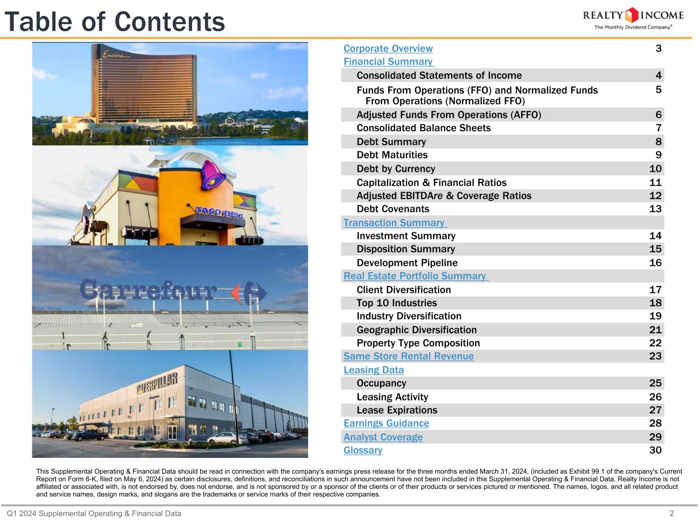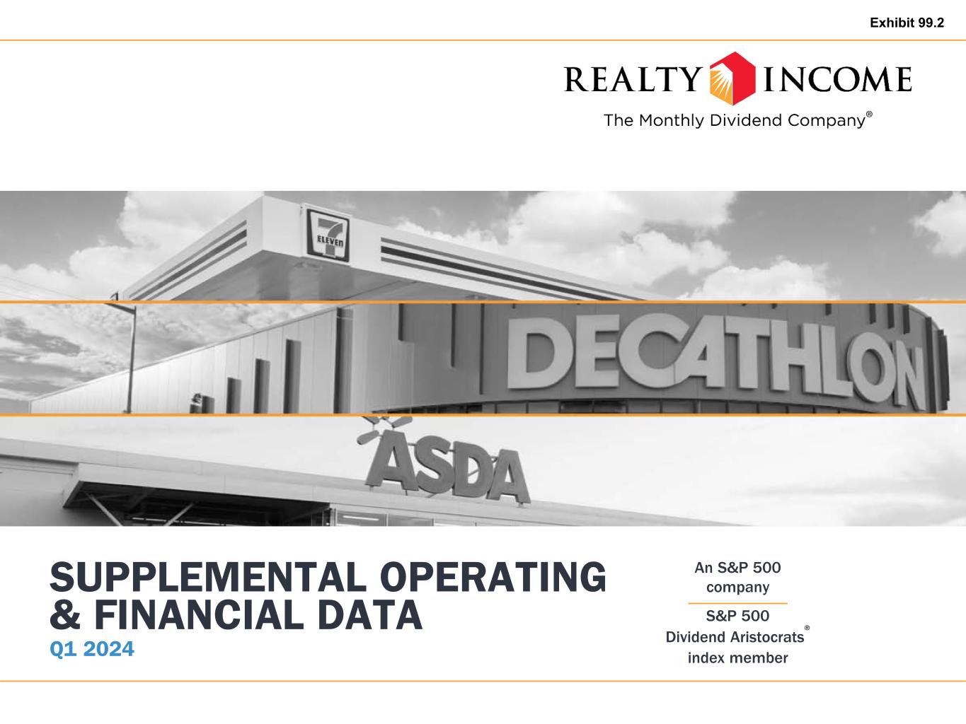 Q1 2024 Supplemental Operating & Financial Data 2 Table of Contents Corporate Overview 3 Financial Summary Consolidated Statements of Income 4 Funds From Operations (FFO) and Normalized Funds From Operations (Normalized FFO) 5 Adjusted Funds From Operations (AFFO) 6 Consolidated Balance Sheets 7 Debt Summary 8 Debt Maturities 9 Debt by Currency 10 Capitalization & Financial Ratios 11 Adjusted EBITDAre & Coverage Ratios 12 Debt Covenants 13 Transaction Summary Investment Summary 14 Disposition Summary 15 Development Pipeline 16 Real Estate Portfolio Summary Client Diversification 17 Top 10 Industries 18 Industry Diversification 19 Geographic Diversification 21 Property Type Composition 22 Same Store Rental Revenue 23 Leasing Data Occupancy 25 Leasing Activity 26 Lease Expirations 27 Earnings Guidance 28 Analyst Coverage 29 Glossary 30 This Supplemental Operating & Financial Data should be read in connection with the company's earnings press release for the three months ended March 31, 2024, (included as Exhibit 99.1 of the company's Current Report on Form 8-K, filed on May 6, 2024) as certain disclosures, definitions, and reconciliations in such announcement have not been included in this Supplemental Operating & Financial Data. Realty Income is not affiliated or associated with, is not endorsed by, does not endorse, and is not sponsored by or a sponsor of the clients or of their products or services pictured or mentioned. The names, logos, and all related product and service names, design marks, and slogans are the trademarks or service marks of their respective companies.