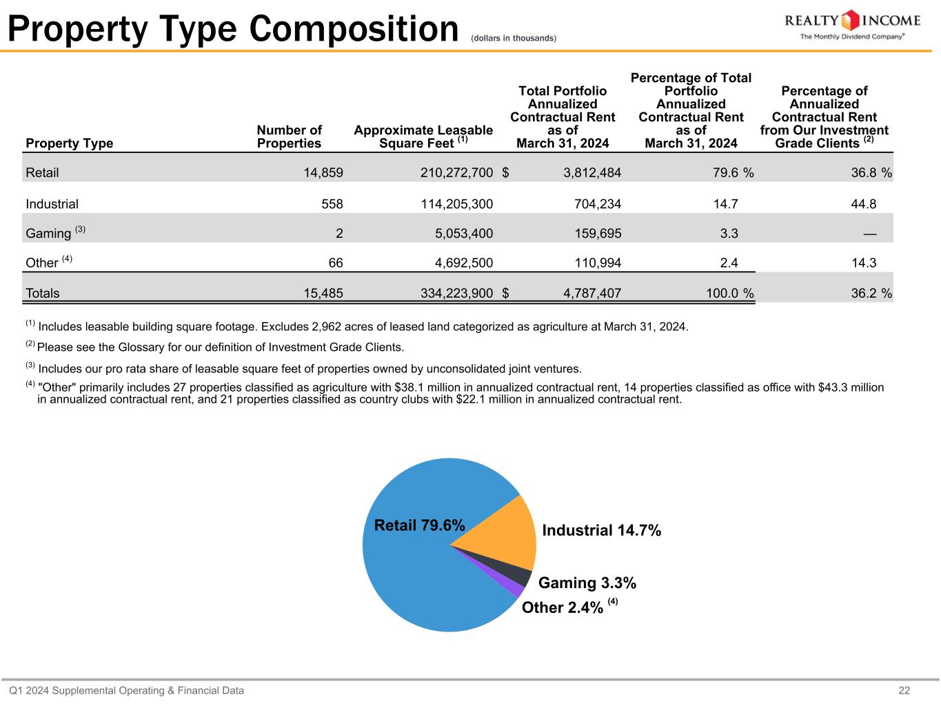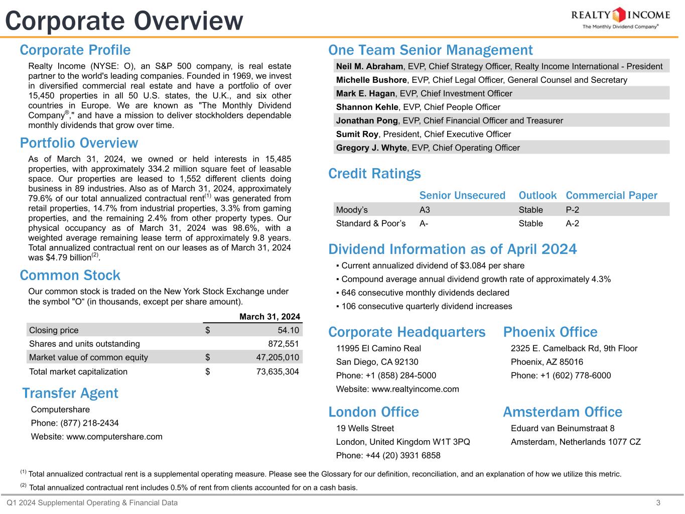 Q1 2024 Supplemental Operating & Financial Data 3 One Team Senior Management Neil M. Abraham, EVP, Chief Strategy Officer, Realty Income International - President Michelle Bushore, EVP, Chief Legal Officer, General Counsel and Secretary Mark E. Hagan, EVP, Chief Investment Officer Shannon Kehle, EVP, Chief People Officer Jonathan Pong, EVP, Chief Financial Officer and Treasurer Sumit Roy, President, Chief Executive Officer Gregory J. Whyte, EVP, Chief Operating Officer Credit Ratings Senior Unsecured Outlook Commercial Paper Moody’s A3 Stable P-2 Standard & Poor’s A- Stable A-2 Dividend Information as of April 2024 ▪ Current annualized dividend of $3.084 per share ▪ Compound average annual dividend growth rate of approximately 4.3% ▪ 646 consecutive monthly dividends declared ▪ 106 consecutive quarterly dividend increases Corporate Headquarters Phoenix Office 11995 El Camino Real 2325 E. Camelback Rd, 9th Floor San Diego, CA 92130 Phoenix, AZ 85016 Phone: +1 (858) 284-5000 Phone: +1 (602) 778-6000 Website: www.realtyincome.com London Office Amsterdam Office 19 Wells Street Eduard van Beinumstraat 8 London, United Kingdom W1T 3PQ Amsterdam, Netherlands 1077 CZ Phone: +44 (20) 3931 6858 Corporate Overview Transfer Agent Computershare Phone: (877) 218-2434 Website: www.computershare.com (1) Total annualized contractual rent is a supplemental operating measure. Please see the Glossary for our definition, reconciliation, and an explanation of how we utilize this metric. (2) Total annualized contractual rent includes 0.5% of rent from clients accounted for on a cash basis. March 31, 2024 Closing price $ 54.10 Shares and units outstanding 872,551 Market value of common equity $ 47,205,010 Total market capitalization $ 73,635,304 Corporate Profile Realty Income (NYSE: O), an S&P 500 company, is real estate partner to the world's leading companies. Founded in 1969, we invest in diversified commercial real estate and have a portfolio of over 15,450 properties in all 50 U.S. states, the U.K., and six other countries in Europe. We are known as "The Monthly Dividend Company®," and have a mission to deliver stockholders dependable monthly dividends that grow over time. Portfolio Overview As of March 31, 2024, we owned or held interests in 15,485 properties, with approximately 334.2 million square feet of leasable space. Our properties are leased to 1,552 different clients doing business in 89 industries. Also as of March 31, 2024, approximately 79.6% of our total annualized contractual rent(1) was generated from retail properties, 14.7% from industrial properties, 3.3% from gaming properties, and the remaining 2.4% from other property types. Our physical occupancy as of March 31, 2024 was 98.6%, with a weighted average remaining lease term of approximately 9.8 years. Total annualized contractual rent on our leases as of March 31, 2024 was $4.79 billion(2). Common Stock Our common stock is traded on the New York Stock Exchange under the symbol "O“ (in thousands, except per share amount).
