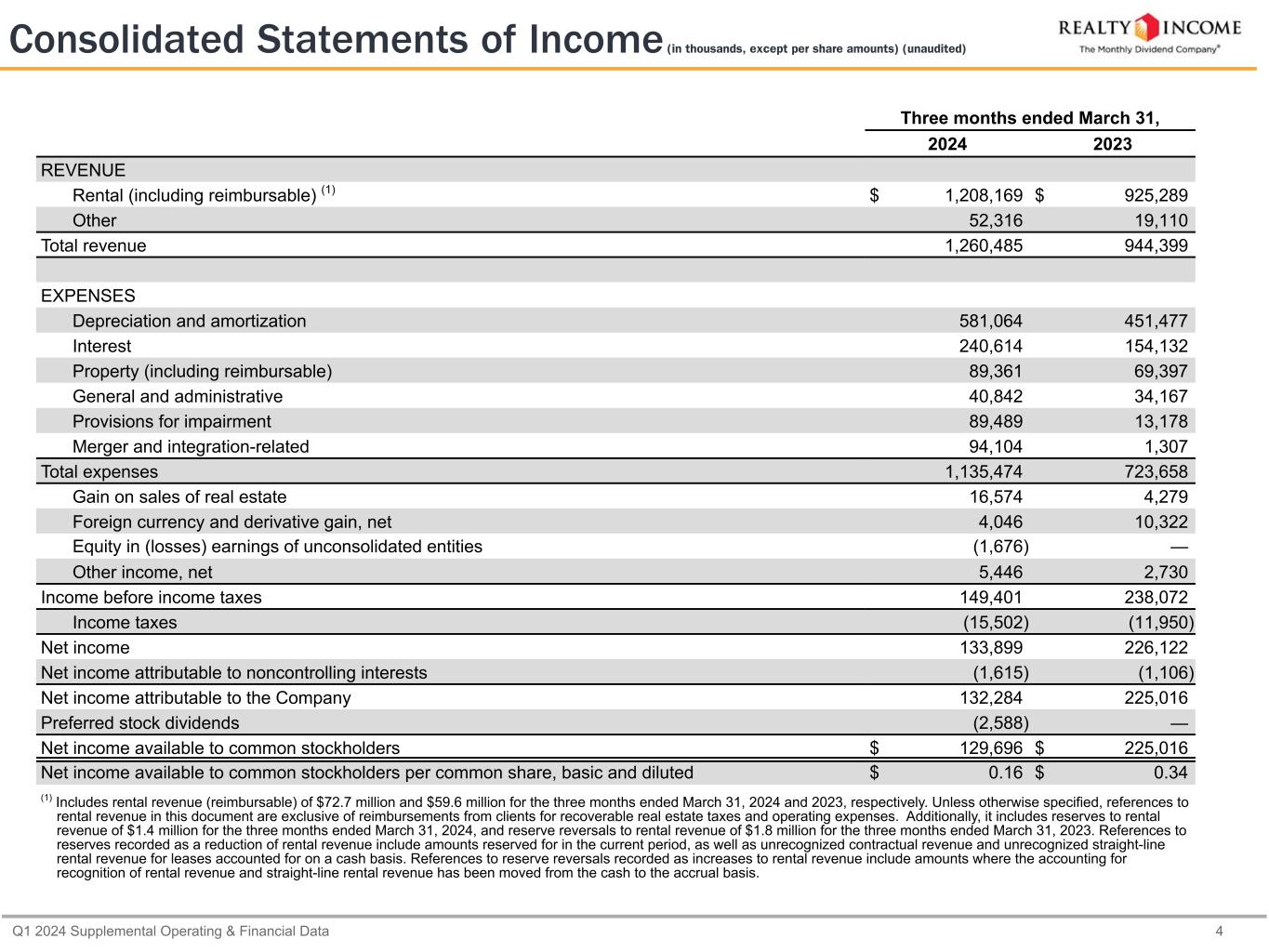 Q1 2024 Supplemental Operating & Financial Data 4 Three months ended March 31, 2024 2023 REVENUE Rental (including reimbursable) (1) $ 1,208,169 $ 925,289 Other 52,316 19,110 Total revenue 1,260,485 944,399 EXPENSES Depreciation and amortization 581,064 451,477 Interest 240,614 154,132 Property (including reimbursable) 89,361 69,397 General and administrative 40,842 34,167 Provisions for impairment 89,489 13,178 Merger and integration-related 94,104 1,307 Total expenses 1,135,474 723,658 Gain on sales of real estate 16,574 4,279 Foreign currency and derivative gain, net 4,046 10,322 Equity in (losses) earnings of unconsolidated entities (1,676) — Other income, net 5,446 2,730 Income before income taxes 149,401 238,072 Income taxes (15,502) (11,950) Net income 133,899 226,122 Net income attributable to noncontrolling interests (1,615) (1,106) Net income attributable to the Company 132,284 225,016 Preferred stock dividends (2,588) — Net income available to common stockholders $ 129,696 $ 225,016 Net income available to common stockholders per common share, basic and diluted $ 0.16 $ 0.34 (1) Includes rental revenue (reimbursable) of $72.7 million and $59.6 million for the three months ended March 31, 2024 and 2023, respectively. Unless otherwise specified, references to rental revenue in this document are exclusive of reimbursements from clients for recoverable real estate taxes and operating expenses. Additionally, it includes reserves to rental revenue of $1.4 million for the three months ended March 31, 2024, and reserve reversals to rental revenue of $1.8 million for the three months ended March 31, 2023. References to reserves recorded as a reduction of rental revenue include amounts reserved for in the current period, as well as unrecognized contractual revenue and unrecognized straight-line rental revenue for leases accounted for on a cash basis. References to reserve reversals recorded as increases to rental revenue include amounts where the accounting for recognition of rental revenue and straight-line rental revenue has been moved from the cash to the accrual basis. Consolidated Statements of Income (in thousands, except per share amounts) (unaudited)