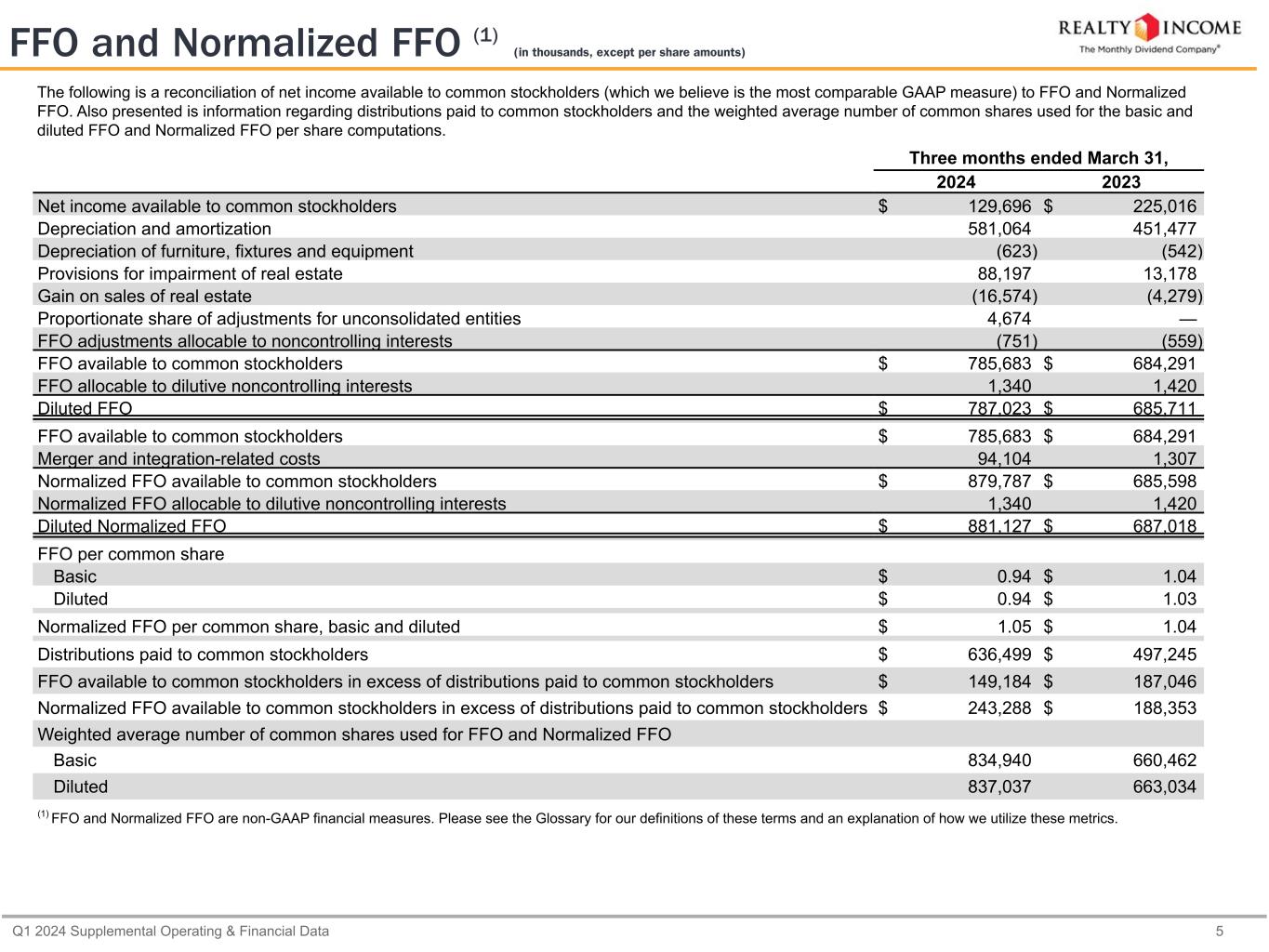Q1 2024 Supplemental Operating & Financial Data 5 FFO and Normalized FFO (1) (in thousands, except per share amounts) The following is a reconciliation of net income available to common stockholders (which we believe is the most comparable GAAP measure) to FFO and Normalized FFO. Also presented is information regarding distributions paid to common stockholders and the weighted average number of common shares used for the basic and diluted FFO and Normalized FFO per share computations. Three months ended March 31, 2024 2023 Net income available to common stockholders $ 129,696 $ 225,016 Depreciation and amortization 581,064 451,477 Depreciation of furniture, fixtures and equipment (623) (542) Provisions for impairment of real estate 88,197 13,178 Gain on sales of real estate (16,574) (4,279) Proportionate share of adjustments for unconsolidated entities 4,674 — FFO adjustments allocable to noncontrolling interests (751) (559) FFO available to common stockholders $ 785,683 $ 684,291 FFO allocable to dilutive noncontrolling interests 1,340 1,420 Diluted FFO $ 787,023 $ 685,711 FFO available to common stockholders $ 785,683 $ 684,291 Merger and integration-related costs 94,104 1,307 Normalized FFO available to common stockholders $ 879,787 $ 685,598 Normalized FFO allocable to dilutive noncontrolling interests 1,340 1,420 Diluted Normalized FFO $ 881,127 $ 687,018 FFO per common share Basic $ 0.94 $ 1.04 Diluted $ 0.94 $ 1.03 Normalized FFO per common share, basic and diluted $ 1.05 $ 1.04 Distributions paid to common stockholders $ 636,499 $ 497,245 FFO available to common stockholders in excess of distributions paid to common stockholders $ 149,184 $ 187,046 Normalized FFO available to common stockholders in excess of distributions paid to common stockholders $ 243,288 $ 188,353 Weighted average number of common shares used for FFO and Normalized FFO Basic 834,940 660,462 Diluted 837,037 663,034 (1) FFO and Normalized FFO are non-GAAP financial measures. Please see the Glossary for our definitions of these terms and an explanation of how we utilize these metrics.