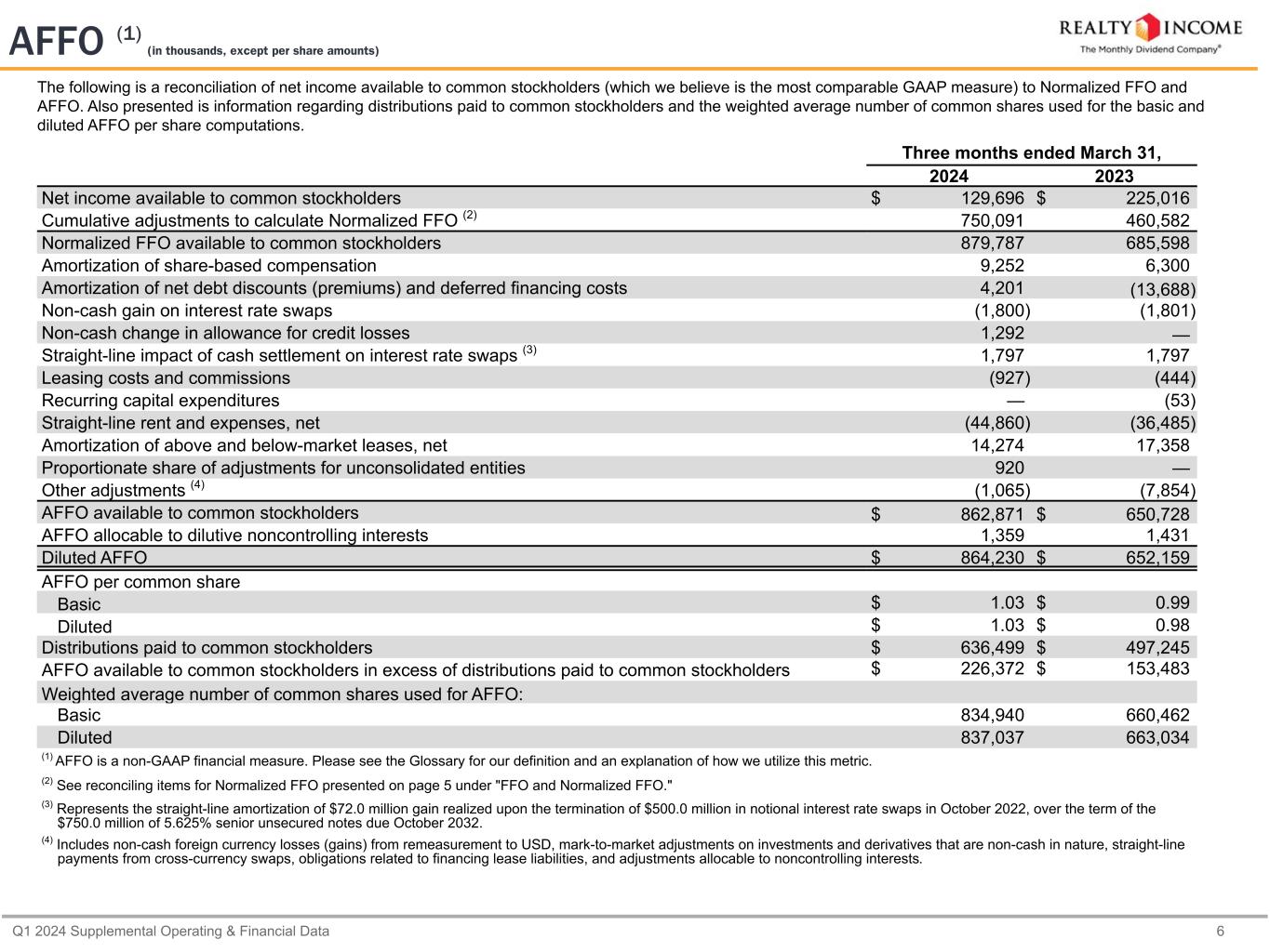 Q1 2024 Supplemental Operating & Financial Data 6 The following is a reconciliation of net income available to common stockholders (which we believe is the most comparable GAAP measure) to Normalized FFO and AFFO. Also presented is information regarding distributions paid to common stockholders and the weighted average number of common shares used for the basic and diluted AFFO per share computations. Three months ended March 31, 2024 2023 Net income available to common stockholders $ 129,696 $ 225,016 Cumulative adjustments to calculate Normalized FFO (2) 750,091 460,582 Normalized FFO available to common stockholders 879,787 685,598 Amortization of share-based compensation 9,252 6,300 Amortization of net debt discounts (premiums) and deferred financing costs 4,201 (13,688) Non-cash gain on interest rate swaps (1,800) (1,801) Non-cash change in allowance for credit losses 1,292 — Straight-line impact of cash settlement on interest rate swaps (3) 1,797 1,797 Leasing costs and commissions (927) (444) Recurring capital expenditures — (53) Straight-line rent and expenses, net (44,860) (36,485) Amortization of above and below-market leases, net 14,274 17,358 Proportionate share of adjustments for unconsolidated entities 920 — Other adjustments (4) (1,065) (7,854) AFFO available to common stockholders $ 862,871 $ 650,728 AFFO allocable to dilutive noncontrolling interests 1,359 1,431 Diluted AFFO $ 864,230 $ 652,159 AFFO per common share Basic $ 1.03 $ 0.99 Diluted $ 1.03 $ 0.98 Distributions paid to common stockholders $ 636,499 $ 497,245 AFFO available to common stockholders in excess of distributions paid to common stockholders $ 226,372 $ 153,483 Weighted average number of common shares used for AFFO: Basic 834,940 660,462 Diluted 837,037 663,034 (1) AFFO is a non-GAAP financial measure. Please see the Glossary for our definition and an explanation of how we utilize this metric. (2) See reconciling items for Normalized FFO presented on page 5 under "FFO and Normalized FFO." (3) Represents the straight-line amortization of $72.0 million gain realized upon the termination of $500.0 million in notional interest rate swaps in October 2022, over the term of the $750.0 million of 5.625% senior unsecured notes due October 2032. (4) Includes non-cash foreign currency losses (gains) from remeasurement to USD, mark-to-market adjustments on investments and derivatives that are non-cash in nature, straight-line payments from cross-currency swaps, obligations related to financing lease liabilities, and adjustments allocable to noncontrolling interests. AFFO (1) (in thousands, except per share amounts)