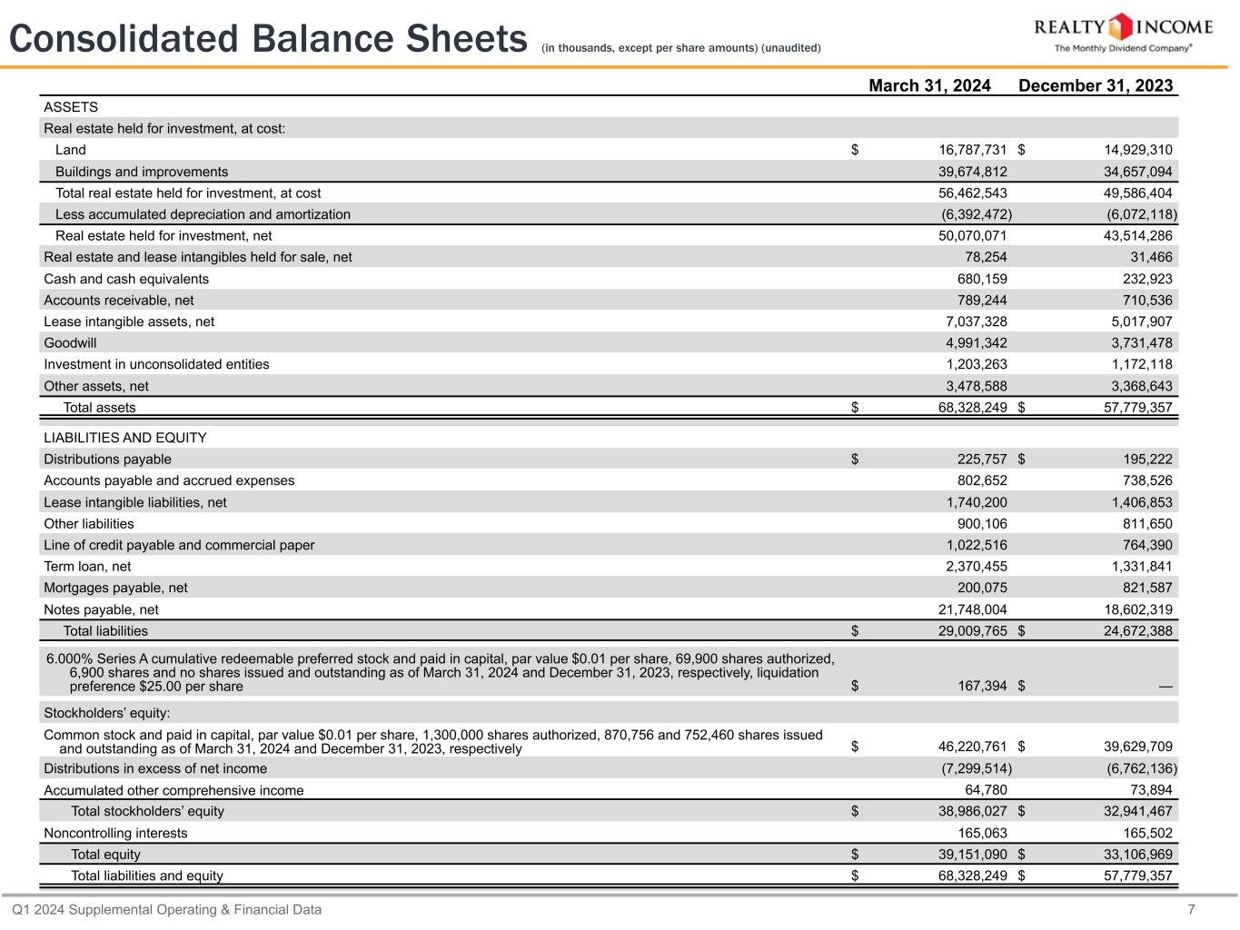 Q1 2024 Supplemental Operating & Financial Data 7 Consolidated Balance Sheets (in thousands, except per share amounts) (unaudited) March 31, 2024 December 31, 2023 ASSETS Real estate held for investment, at cost: Land $ 16,787,731 $ 14,929,310 Buildings and improvements 39,674,812 34,657,094 Total real estate held for investment, at cost 56,462,543 49,586,404 Less accumulated depreciation and amortization (6,392,472) (6,072,118) Real estate held for investment, net 50,070,071 43,514,286 Real estate and lease intangibles held for sale, net 78,254 31,466 Cash and cash equivalents 680,159 232,923 Accounts receivable, net 789,244 710,536 Lease intangible assets, net 7,037,328 5,017,907 Goodwill 4,991,342 3,731,478 Investment in unconsolidated entities 1,203,263 1,172,118 Other assets, net 3,478,588 3,368,643 Total assets $ 68,328,249 $ 57,779,357 LIABILITIES AND EQUITY Distributions payable $ 225,757 $ 195,222 Accounts payable and accrued expenses 802,652 738,526 Lease intangible liabilities, net 1,740,200 1,406,853 Other liabilities 900,106 811,650 Line of credit payable and commercial paper 1,022,516 764,390 Term loan, net 2,370,455 1,331,841 Mortgages payable, net 200,075 821,587 Notes payable, net 21,748,004 18,602,319 Total liabilities $ 29,009,765 $ 24,672,388 6.000% Series A cumulative redeemable preferred stock and paid in capital, par value $0.01 per share, 69,900 shares authorized, 6,900 shares and no shares issued and outstanding as of March 31, 2024 and December 31, 2023, respectively, liquidation preference $25.00 per share $ 167,394 $ — Stockholders’ equity: Common stock and paid in capital, par value $0.01 per share, 1,300,000 shares authorized, 870,756 and 752,460 shares issued and outstanding as of March 31, 2024 and December 31, 2023, respectively $ 46,220,761 $ 39,629,709 Distributions in excess of net income (7,299,514) (6,762,136) Accumulated other comprehensive income 64,780 73,894 Total stockholders’ equity $ 38,986,027 $ 32,941,467 Noncontrolling interests 165,063 165,502 Total equity $ 39,151,090 $ 33,106,969 Total liabilities and equity $ 68,328,249 $ 57,779,357