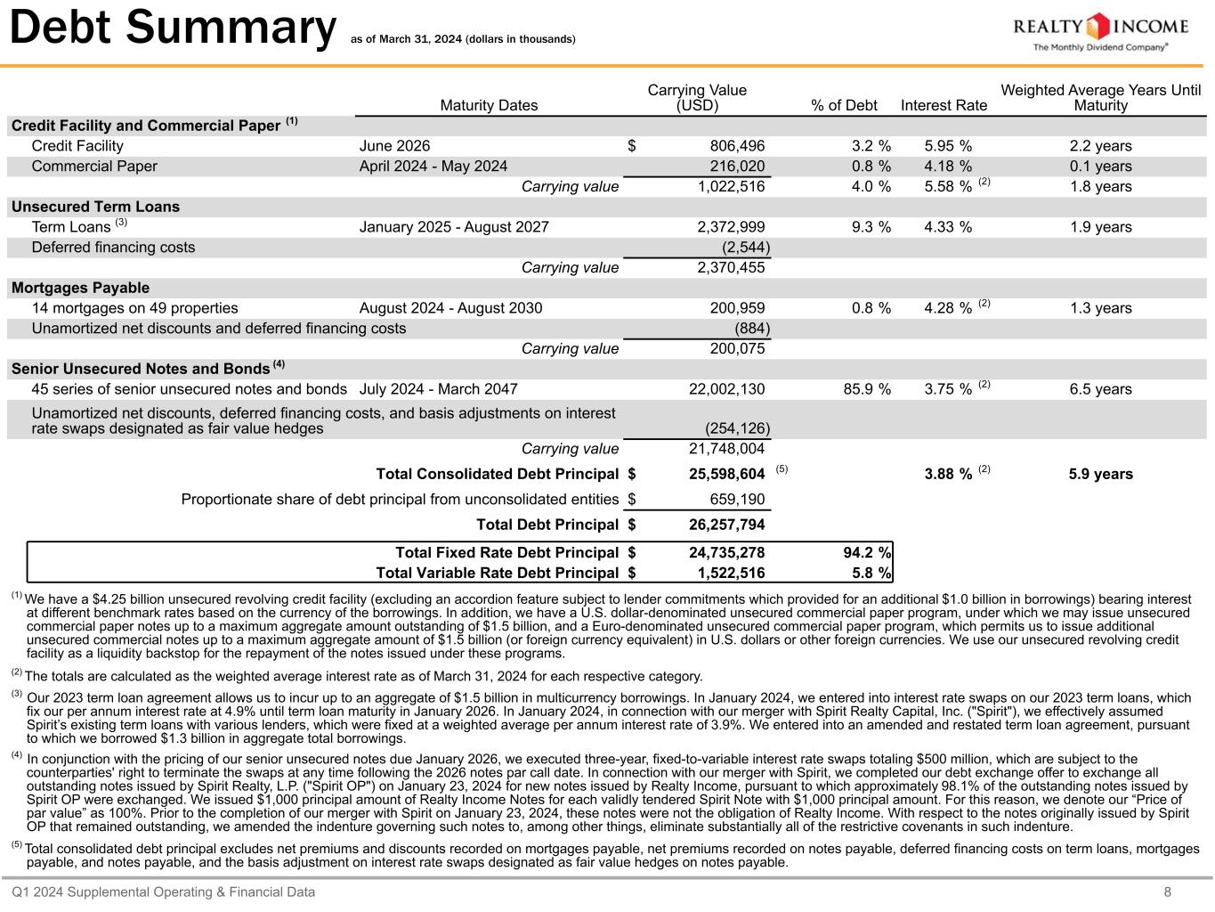 Q1 2024 Supplemental Operating & Financial Data 8 Debt Summary as of March 31, 2024 (dollars in thousands) Maturity Dates Carrying Value (USD) % of Debt Interest Rate Weighted Average Years Until Maturity Credit Facility and Commercial Paper (1) Credit Facility June 2026 $ 806,496 3.2 % 5.95 % 2.2 years Commercial Paper April 2024 - May 2024 216,020 0.8 % 4.18 % 0.1 years Carrying value 1,022,516 4.0 % 5.58 % (2) 1.8 years Unsecured Term Loans Term Loans (3) January 2025 - August 2027 2,372,999 9.3 % 4.33 % 1.9 years Deferred financing costs (2,544) Carrying value 2,370,455 Mortgages Payable 14 mortgages on 49 properties August 2024 - August 2030 200,959 0.8 % 4.28 % (2) 1.3 years Unamortized net discounts and deferred financing costs (884) Carrying value 200,075 Senior Unsecured Notes and Bonds (4) 45 series of senior unsecured notes and bonds July 2024 - March 2047 22,002,130 85.9 % 3.75 % (2) 6.5 years Unamortized net discounts, deferred financing costs, and basis adjustments on interest rate swaps designated as fair value hedges (254,126) Carrying value 21,748,004 Total Consolidated Debt Principal $ 25,598,604 (5) 3.88 % (2) 5.9 years Proportionate share of debt principal from unconsolidated entities $ 659,190 Total Debt Principal $ 26,257,794 Total Fixed Rate Debt Principal $ 24,735,278 94.2 % Total Variable Rate Debt Principal $ 1,522,516 5.8 % (1) We have a $4.25 billion unsecured revolving credit facility (excluding an accordion feature subject to lender commitments which provided for an additional $1.0 billion in borrowings) bearing interest at different benchmark rates based on the currency of the borrowings. In addition, we have a U.S. dollar-denominated unsecured commercial paper program, under which we may issue unsecured commercial paper notes up to a maximum aggregate amount outstanding of $1.5 billion, and a Euro-denominated unsecured commercial paper program, which permits us to issue additional unsecured commercial notes up to a maximum aggregate amount of $1.5 billion (or foreign currency equivalent) in U.S. dollars or other foreign currencies. We use our unsecured revolving credit facility as a liquidity backstop for the repayment of the notes issued under these programs. (2) The totals are calculated as the weighted average interest rate as of March 31, 2024 for each respective category. (3) Our 2023 term loan agreement allows us to incur up to an aggregate of $1.5 billion in multicurrency borrowings. In January 2024, we entered into interest rate swaps on our 2023 term loans, which fix our per annum interest rate at 4.9% until term loan maturity in January 2026. In January 2024, in connection with our merger with Spirit Realty Capital, Inc. ("Spirit"), we effectively assumed Spirit’s existing term loans with various lenders, which were fixed at a weighted average per annum interest rate of 3.9%. We entered into an amended and restated term loan agreement, pursuant to which we borrowed $1.3 billion in aggregate total borrowings. (4) In conjunction with the pricing of our senior unsecured notes due January 2026, we executed three-year, fixed-to-variable interest rate swaps totaling $500 million, which are subject to the counterparties' right to terminate the swaps at any time following the 2026 notes par call date. In connection with our merger with Spirit, we completed our debt exchange offer to exchange all outstanding notes issued by Spirit Realty, L.P. ("Spirit OP") on January 23, 2024 for new notes issued by Realty Income, pursuant to which approximately 98.1% of the outstanding notes issued by Spirit OP were exchanged. We issued $1,000 principal amount of Realty Income Notes for each validly tendered Spirit Note with $1,000 principal amount. For this reason, we denote our “Price of par value” as 100%. Prior to the completion of our merger with Spirit on January 23, 2024, these notes were not the obligation of Realty Income. With respect to the notes originally issued by Spirit OP that remained outstanding, we amended the indenture governing such notes to, among other things, eliminate substantially all of the restrictive covenants in such indenture. (5) Total consolidated debt principal excludes net premiums and discounts recorded on mortgages payable, net premiums recorded on notes payable, deferred financing costs on term loans, mortgages payable, and notes payable, and the basis adjustment on interest rate swaps designated as fair value hedges on notes payable.