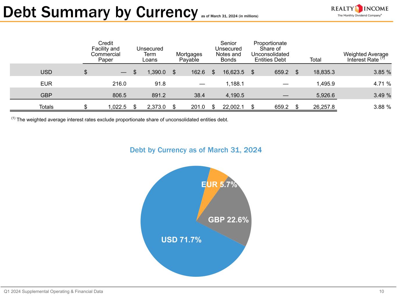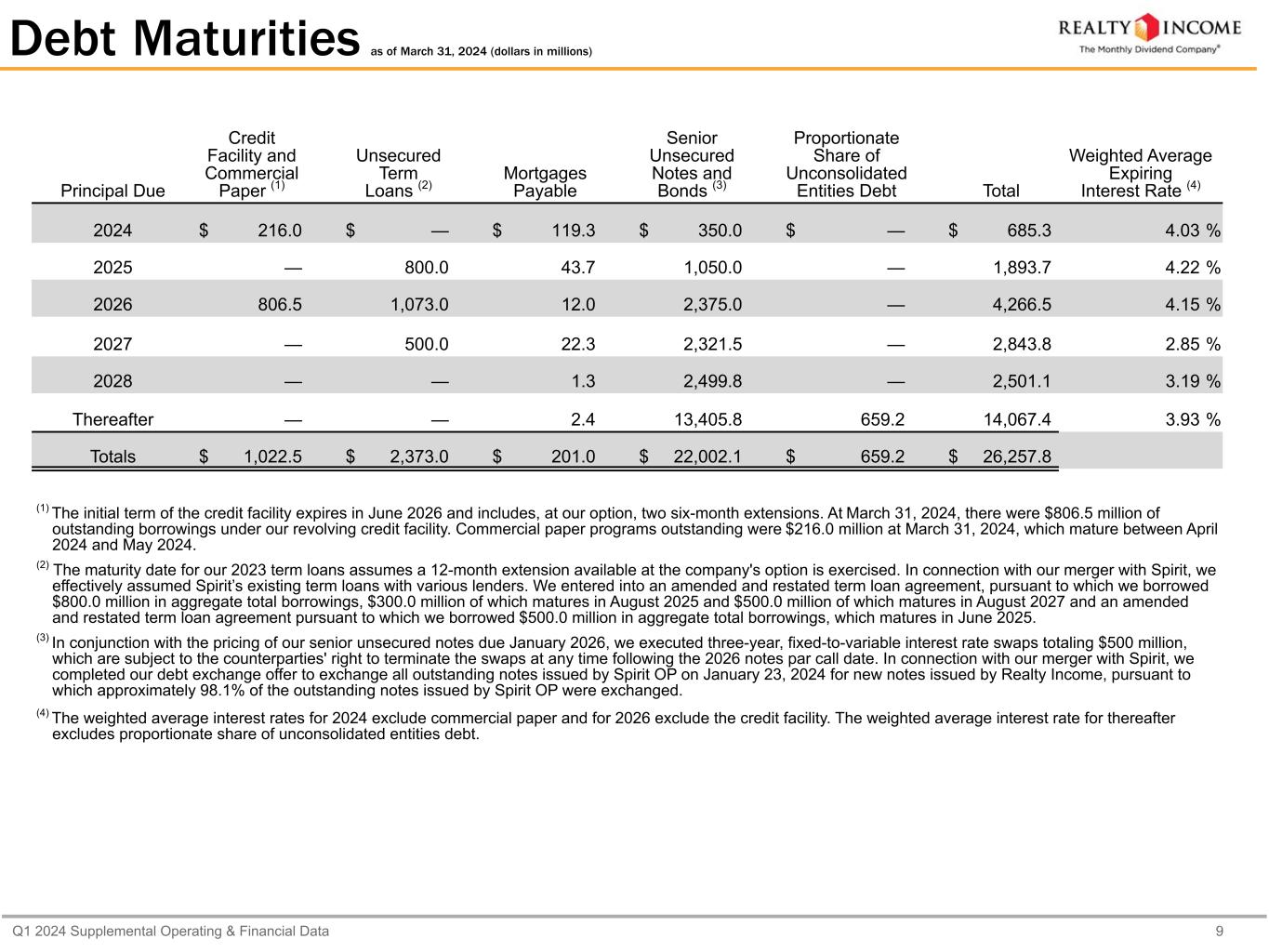 Q1 2024 Supplemental Operating & Financial Data 9 Debt Maturities as of March 31, 2024 (dollars in millions) Principal Due Credit Facility and Commercial Paper (1) Unsecured Term Loans (2) Mortgages Payable Senior Unsecured Notes and Bonds (3) Proportionate Share of Unconsolidated Entities Debt Total Weighted Average Expiring Interest Rate (4) 2024 $ 216.0 $ — $ 119.3 $ 350.0 $ — $ 685.3 4.03 % 2025 — 800.0 43.7 1,050.0 — 1,893.7 4.22 % 2026 806.5 1,073.0 12.0 2,375.0 — 4,266.5 4.15 % 2027 — 500.0 22.3 2,321.5 — 2,843.8 2.85 % 2028 — — 1.3 2,499.8 — 2,501.1 3.19 % Thereafter — — 2.4 13,405.8 659.2 14,067.4 3.93 % Totals $ 1,022.5 $ 2,373.0 $ 201.0 $ 22,002.1 $ 659.2 $ 26,257.8 (1) The initial term of the credit facility expires in June 2026 and includes, at our option, two six-month extensions. At March 31, 2024, there were $806.5 million of outstanding borrowings under our revolving credit facility. Commercial paper programs outstanding were $216.0 million at March 31, 2024, which mature between April 2024 and May 2024. (2) The maturity date for our 2023 term loans assumes a 12-month extension available at the company's option is exercised. In connection with our merger with Spirit, we effectively assumed Spirit’s existing term loans with various lenders. We entered into an amended and restated term loan agreement, pursuant to which we borrowed $800.0 million in aggregate total borrowings, $300.0 million of which matures in August 2025 and $500.0 million of which matures in August 2027 and an amended and restated term loan agreement pursuant to which we borrowed $500.0 million in aggregate total borrowings, which matures in June 2025. (3) In conjunction with the pricing of our senior unsecured notes due January 2026, we executed three-year, fixed-to-variable interest rate swaps totaling $500 million, which are subject to the counterparties' right to terminate the swaps at any time following the 2026 notes par call date. In connection with our merger with Spirit, we completed our debt exchange offer to exchange all outstanding notes issued by Spirit OP on January 23, 2024 for new notes issued by Realty Income, pursuant to which approximately 98.1% of the outstanding notes issued by Spirit OP were exchanged. (4) The weighted average interest rates for 2024 exclude commercial paper and for 2026 exclude the credit facility. The weighted average interest rate for thereafter excludes proportionate share of unconsolidated entities debt.