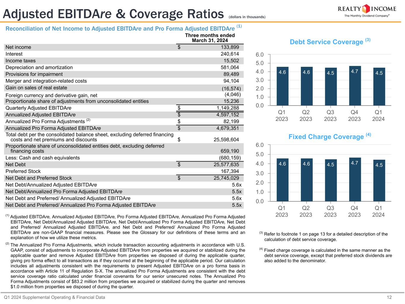 Q1 2024 Supplemental Operating & Financial Data 11 Capitalization & Financial Ratios (dollars in thousands, except as otherwise noted) Cash on Hand $ 680,159 Availability under Credit Facility 3,443,504 Unsettled ATM Forwards 62,942 Less: Commercial Paper Borrowings (216,020) $ 3,970,585 (4) As applicable, liquidity calculation gives effect to borrowings under the $1.5 billion U.S Dollar-denominated commercial paper program and $1.5 billion Euro-denominated commercial paper programs as of March 31, 2024. We use our unsecured revolving credit facility as a liquidity backstop for the repayment of the notes issued under these programs. Principal Debt Balance Credit Facility and Commercial Paper $ 1,022,516 Unsecured Term Loans 2,372,999 Senior Unsecured Notes and Bonds 22,002,130 Mortgages Payable 200,959 Proportionate Share of Unconsolidated Entities Debt 659,190 Total Debt $ 26,257,794 Equity (in thousands, except per share data) Shares/ Units Stock Price Redemption Price Market Value Common Stock (1) 870,756 $ 54.10 $ 47,107,900 Common Units (2) 1,795 $ 54.10 97,110 Common Equity $ 47,205,010 6.000% Series A Cumulative Preferred Stock 6,900 $ 25.00 172,500 Total Equity $ 47,377,510 Total Market Capitalization (3) $ 73,635,304 Debt/Total Market Capitalization (3) 35.7 % Debt and Preferred Stock/ Total Market Capitalization (3) 35.9 % (1) As of March 31, 2024, ATM forward agreements for a total of 1.2 million shares remain unsettled with total expected net proceeds of approximately $62.9 million in expected net proceeds (assuming full physical settlement of all outstanding shares of common stock, subject to forward sale agreements and certain assumptions made with respect to settlement dates). (2) Consists of common units issued by Realty Income Limited Partnership and held by third parties. (3) Our enterprise value was $73.0 billion (total market capitalization less cash and cash equivalents as of March 31, 2024). The percentages for debt to enterprise value as well as debt and preferred stock to enterprise value are materially consistent with that presented for total market capitalization. Dividend Data Q1 2024 Q1 2023 Year-Over-Year Growth Rate Common Dividend Paid per Share $ 0.770 $ 0.752 2.4 % AFFO per Share (diluted) $ 1.03 $ 0.98 5.1 % AFFO Payout Ratio 74.8 % 76.7 % Liquidity as of March 31, 2024 (4) Capitalization as of March 31, 2024 Capital Structure as of March 31, 2024 Common Stock 64.3% Debt 35.7%