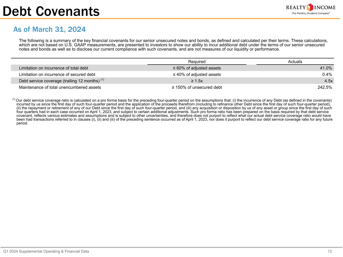 Q1 2024 Supplemental Operating & Financial Data 13 Debt Covenants The following is a summary of the key financial covenants for our senior unsecured notes and bonds, as defined and calculated per their terms. These calculations, which are not based on U.S. GAAP measurements, are presented to investors to show our ability to incur additional debt under the terms of our senior unsecured notes and bonds as well as to disclose our current compliance with such covenants, and are not measures of our liquidity or performance. Required Actuals Limitation on incurrence of total debt ≤ 60% of adjusted assets 41.0% Limitation on incurrence of secured debt ≤ 40% of adjusted assets 0.4% Debt service coverage (trailing 12 months) (1) ≥ 1.5x 4.5x Maintenance of total unencumbered assets ≥ 150% of unsecured debt 242.5% (1) Our debt service coverage ratio is calculated on a pro forma basis for the preceding four-quarter period on the assumptions that: (i) the incurrence of any Debt (as defined in the covenants) incurred by us since the first day of such four-quarter period and the application of the proceeds therefrom (including to refinance other Debt since the first day of such four-quarter period), (ii) the repayment or retirement of any of our Debt since the first day of such four-quarter period, and (iii) any acquisition or disposition by us of any asset or group since the first day of such four quarters had in each case occurred on April 1, 2023, and subject to certain additional adjustments. Such pro forma ratio has been prepared on the basis required by that debt service covenant, reflects various estimates and assumptions and is subject to other uncertainties, and therefore does not purport to reflect what our actual debt service coverage ratio would have been had transactions referred to in clauses (i), (ii) and (iii) of the preceding sentence occurred as of April 1, 2023, nor does it purport to reflect our debt service coverage ratio for any future period. As of March 31, 2024