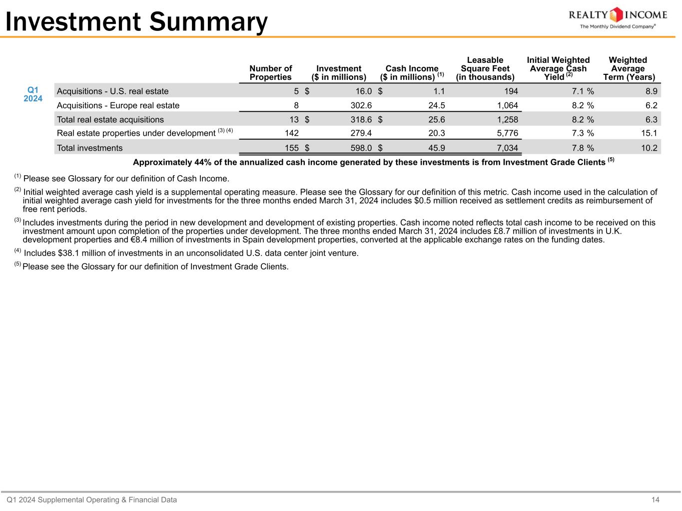 Q1 2024 Supplemental Operating & Financial Data 14 Investment Summary Number of Properties Investment ($ in millions) Cash Income ($ in millions) (1) Leasable Square Feet (in thousands) Initial Weighted Average Cash Yield (2) Weighted Average Term (Years) Q1 2024 Acquisitions - U.S. real estate 5 $ 16.0 $ 1.1 194 7.1 % 8.9 Acquisitions - Europe real estate 8 302.6 24.5 1,064 8.2 % 6.2 Total real estate acquisitions 13 $ 318.6 $ 25.6 1,258 8.2 % 6.3 Real estate properties under development (3) (4) 142 279.4 20.3 5,776 7.3 % 15.1 Total investments 155 $ 598.0 $ 45.9 7,034 7.8 % 10.2 Approximately 44% of the annualized cash income generated by these investments is from Investment Grade Clients (5) (1) Please see Glossary for our definition of Cash Income. (2) Initial weighted average cash yield is a supplemental operating measure. Please see the Glossary for our definition of this metric. Cash income used in the calculation of initial weighted average cash yield for investments for the three months ended March 31, 2024 includes $0.5 million received as settlement credits as reimbursement of free rent periods. (3) Includes investments during the period in new development and development of existing properties. Cash income noted reflects total cash income to be received on this investment amount upon completion of the properties under development. The three months ended March 31, 2024 includes £8.7 million of investments in U.K. development properties and €8.4 million of investments in Spain development properties, converted at the applicable exchange rates on the funding dates. (4) Includes $38.1 million of investments in an unconsolidated U.S. data center joint venture. (5) Please see the Glossary for our definition of Investment Grade Clients.