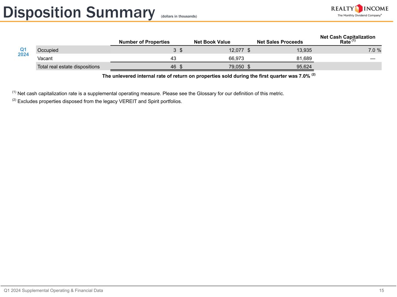 Q1 2024 Supplemental Operating & Financial Data 15 Disposition Summary (dollars in thousands) Number of Properties Net Book Value Net Sales Proceeds Net Cash Capitalization Rate (1) Q1 2024 Occupied 3 $ 12,077 $ 13,935 7.0 % Vacant 43 66,973 81,689 — Total real estate dispositions 46 $ 79,050 $ 95,624 The unlevered internal rate of return on properties sold during the first quarter was 7.0% (2) (1) Net cash capitalization rate is a supplemental operating measure. Please see the Glossary for our definition of this metric. (2) Excludes properties disposed from the legacy VEREIT and Spirit portfolios.