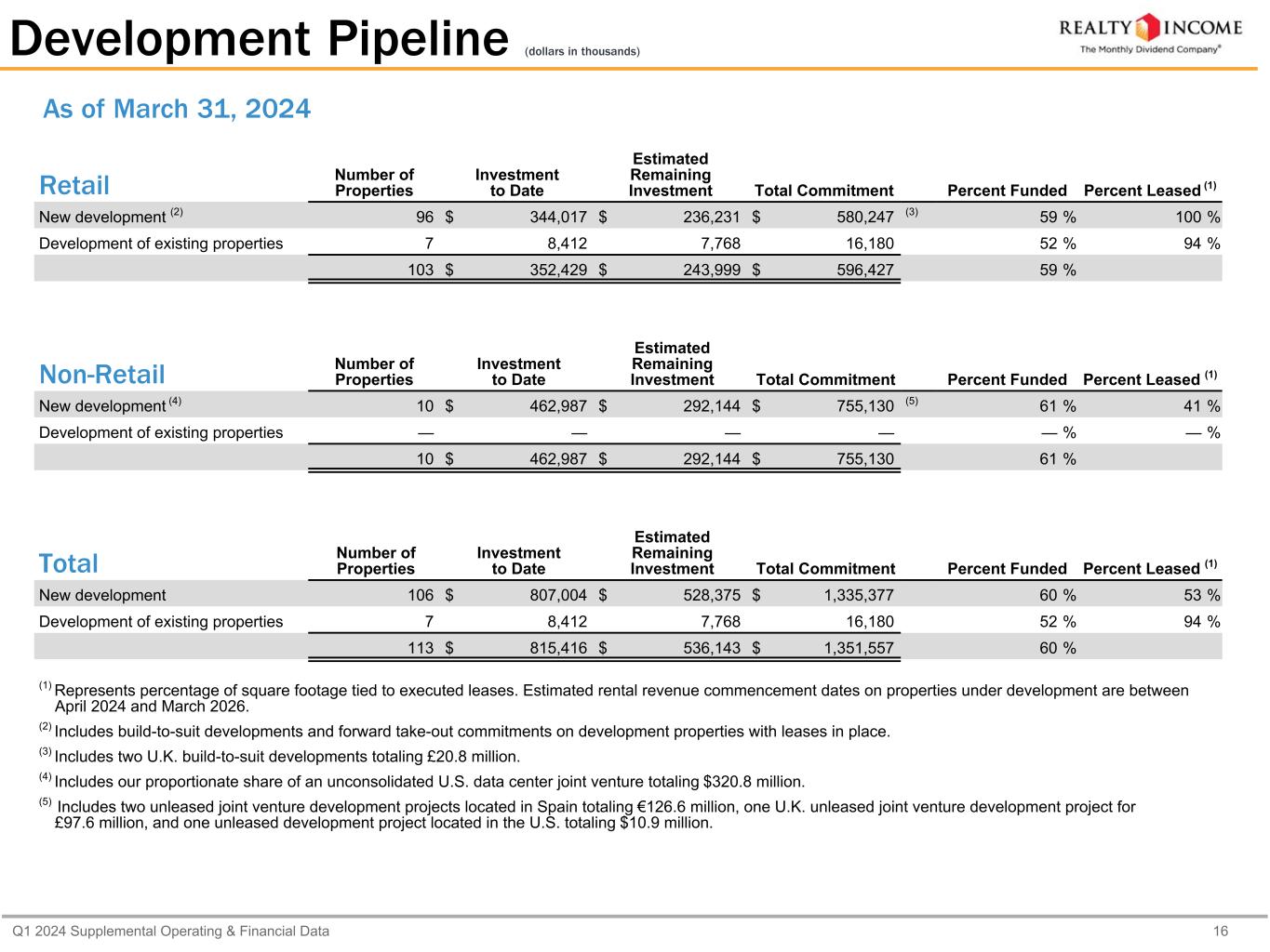 Q1 2024 Supplemental Operating & Financial Data 16 Development Pipeline (dollars in thousands) Retail Number of Properties Investment to Date Estimated Remaining Investment Total Commitment Percent Funded Percent Leased (1) New development (2) 96 $ 344,017 $ 236,231 $ 580,247 (3) 59 % 100 % Development of existing properties 7 8,412 7,768 16,180 52 % 94 % 103 $ 352,429 $ 243,999 $ 596,427 59 % Non-Retail Number of Properties Investment to Date Estimated Remaining Investment Total Commitment Percent Funded Percent Leased (1) New development (4) 10 $ 462,987 $ 292,144 $ 755,130 (5) 61 % 41 % Development of existing properties — — — — — % — % 10 $ 462,987 $ 292,144 $ 755,130 61 % Total Number of Properties Investment to Date Estimated Remaining Investment Total Commitment Percent Funded Percent Leased (1) New development 106 $ 807,004 $ 528,375 $ 1,335,377 60 % 53 % Development of existing properties 7 8,412 7,768 16,180 52 % 94 % 113 $ 815,416 $ 536,143 $ 1,351,557 60 % (1) Represents percentage of square footage tied to executed leases. Estimated rental revenue commencement dates on properties under development are between April 2024 and March 2026. (2) Includes build-to-suit developments and forward take-out commitments on development properties with leases in place. (3) Includes two U.K. build-to-suit developments totaling £20.8 million. (4) Includes our proportionate share of an unconsolidated U.S. data center joint venture totaling $320.8 million. (5) Includes two unleased joint venture development projects located in Spain totaling €126.6 million, one U.K. unleased joint venture development project for £97.6 million, and one unleased development project located in the U.S. totaling $10.9 million. As of March 31, 2024