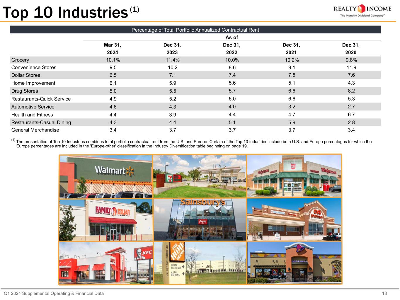 Q1 2024 Supplemental Operating & Financial Data 18 (1)Top 10 Industries Percentage of Total Portfolio Annualized Contractual Rent As of Mar 31, Dec 31, Dec 31, Dec 31, Dec 31, 2024 2023 2022 2021 2020 Grocery 10.1% 11.4% 10.0% 10.2% 9.8% Convenience Stores 9.5 10.2 8.6 9.1 11.9 Dollar Stores 6.5 7.1 7.4 7.5 7.6 Home Improvement 6.1 5.9 5.6 5.1 4.3 Drug Stores 5.0 5.5 5.7 6.6 8.2 Restaurants-Quick Service 4.9 5.2 6.0 6.6 5.3 Automotive Service 4.6 4.3 4.0 3.2 2.7 Health and Fitness 4.4 3.9 4.4 4.7 6.7 Restaurants-Casual Dining 4.3 4.4 5.1 5.9 2.8 General Merchandise 3.4 3.7 3.7 3.7 3.4 (1) The presentation of Top 10 Industries combines total portfolio contractual rent from the U.S. and Europe. Certain of the Top 10 Industries include both U.S. and Europe percentages for which the Europe percentages are included in the 'Europe-other' classification in the Industry Diversification table beginning on page 19.