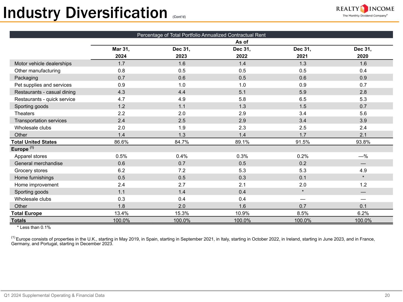 Q1 2024 Supplemental Operating & Financial Data 19 Percentage of Total Portfolio Annualized Contractual Rent As of Mar 31, Dec 31, Dec 31, Dec 31, Dec 31, 2024 2023 2022 2021 2020 United States Aerospace 0.3% 0.3% 0.4% 0.4% 0.6% Apparel stores 1.6 1.4 1.4 1.5 1.3 Automotive collision services 1.1 1.1 0.9 1.0 1.1 Automotive parts 1.4 1.1 1.3 1.5 1.6 Automotive service 4.6 4.3 4.0 3.2 2.7 Automotive tire services 1.2 1.3 1.5 1.8 2.0 Beverages 0.7 0.8 1.0 1.3 2.1 Child care 1.2 1.2 1.4 1.5 2.1 Consumer electronics 0.6 0.5 0.6 0.6 0.3 Consumer goods 0.5 0.5 0.6 0.7 0.6 Convenience stores 9.5 10.2 8.6 9.1 11.9 Crafts and novelties 1.0 0.9 0.9 1.0 0.9 Diversified industrial 1.3 0.9 0.8 1.0 0.8 Dollar stores 6.5 7.0 7.4 7.5 7.6 Drug stores 4.8 5.3 5.6 6.6 8.2 Education 0.2 0.2 0.2 0.1 0.2 Energy 0.6 0.2 0.3 0.4 — Entertainment 1.8 0.8 0.8 0.8 0.3 Equipment services 0.4 0.3 0.3 0.3 0.3 Financial services 1.4 1.5 1.8 2.0 1.8 Food processing 0.6 0.4 0.4 0.7 0.7 Gaming 3.3 3.9 2.9 — — General merchandise 2.8 3.0 3.2 3.5 3.4 Grocery stores 3.9 4.2 4.7 4.9 4.9 Health and fitness 4.3 3.8 4.4 4.7 6.7 Health care 2.7 2.8 3.0 1.9 1.5 Home furnishings 2.3 1.8 2.1 2.2 0.7 Home improvement 3.7 3.2 3.5 3.1 3.1 Industry Diversification
