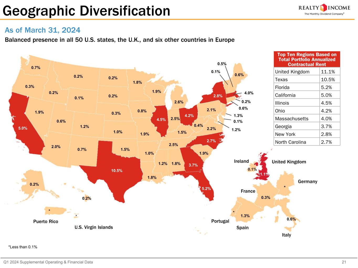Q1 2024 Supplemental Operating & Financial Data 20 Percentage of Total Portfolio Annualized Contractual Rent As of Mar 31, Dec 31, Dec 31, Dec 31, Dec 31, 2024 2023 2022 2021 2020 Motor vehicle dealerships 1.7 1.6 1.4 1.3 1.6 Other manufacturing 0.8 0.5 0.5 0.5 0.4 Packaging 0.7 0.6 0.5 0.6 0.9 Pet supplies and services 0.9 1.0 1.0 0.9 0.7 Restaurants - casual dining 4.3 4.4 5.1 5.9 2.8 Restaurants - quick service 4.7 4.9 5.8 6.5 5.3 Sporting goods 1.2 1.1 1.3 1.5 0.7 Theaters 2.2 2.0 2.9 3.4 5.6 Transportation services 2.4 2.5 2.9 3.4 3.9 Wholesale clubs 2.0 1.9 2.3 2.5 2.4 Other 1.4 1.3 1.4 1.7 2.1 Total United States 86.6% 84.7% 89.1% 91.5% 93.8% Europe (1) Apparel stores 0.5% 0.4% 0.3% 0.2% —% General merchandise 0.6 0.7 0.5 0.2 — Grocery stores 6.2 7.2 5.3 5.3 4.9 Home furnishings 0.5 0.5 0.3 0.1 * Home improvement 2.4 2.7 2.1 2.0 1.2 Sporting goods 1.1 1.4 0.4 * — Wholesale clubs 0.3 0.4 0.4 — — Other 1.8 2.0 1.6 0.7 0.1 Total Europe 13.4% 15.3% 10.9% 8.5% 6.2% Totals 100.0% 100.0% 100.0% 100.0% 100.0% * Less than 0.1% (1) Europe consists of properties in the U.K., starting in May 2019, in Spain, starting in September 2021, in Italy, starting in October 2022, in Ireland, starting in June 2023, and in France, Germany, and Portugal, starting in December 2023. Industry Diversification (Cont'd)