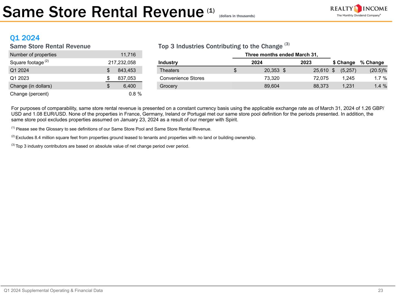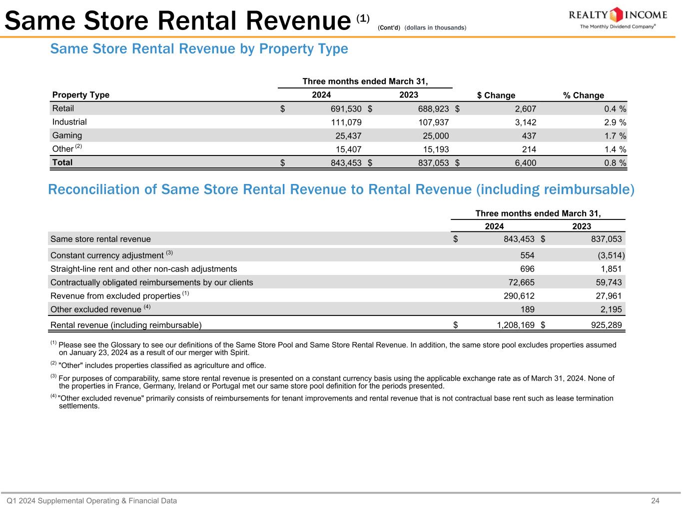 Q1 2024 Supplemental Operating & Financial Data 23 Q1 2024 Same Store Rental Revenue Number of properties 11,716 Square footage (2) 217,232,058 Q1 2024 $ 843,453 Q1 2023 $ 837,053 Change (in dollars) $ 6,400 Change (percent) 0.8 % Same Store Rental Revenue (1) (dollars in thousands) Top 3 Industries Contributing to the Change (3) Three months ended March 31, Industry 2024 2023 $ Change % Change Theaters $ 20,353 $ 25,610 $ (5,257) (20.5) % Convenience Stores 73,320 72,075 1,245 1.7 % Grocery 89,604 88,373 1,231 1.4 % For purposes of comparability, same store rental revenue is presented on a constant currency basis using the applicable exchange rate as of March 31, 2024 of 1.26 GBP/ USD and 1.08 EUR/USD. None of the properties in France, Germany, Ireland or Portugal met our same store pool definition for the periods presented. In addition, the same store pool excludes properties assumed on January 23, 2024 as a result of our merger with Spirit. (1) Please see the Glossary to see definitions of our Same Store Pool and Same Store Rental Revenue. (2) Excludes 8.4 million square feet from properties ground leased to tenants and properties with no land or building ownership. (3) Top 3 industry contributors are based on absolute value of net change period over period.