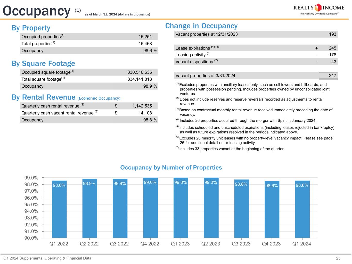Q1 2024 Supplemental Operating & Financial Data 25 By Property Occupied properties(1) 15,251 Total properties(1) 15,468 Occupancy 98.6 % By Square Footage Occupied square footage(1) 330,516,635 Total square footage(1) 334,141,813 Occupancy 98.9 % By Rental Revenue (Economic Occupancy) Quarterly cash rental revenue (2) $ 1,142,535 Quarterly cash vacant rental revenue (3) $ 14,108 Occupancy 98.8 % Change in Occupancy Vacant properties at 12/31/2023   193 Lease expirations (4) (5) + 245 Leasing activity (6) - 178 Vacant dispositions (7) - 43 Vacant properties at 3/31/2024   217 (1) Excludes properties with ancillary leases only, such as cell towers and billboards, and properties with possession pending. Includes properties owned by unconsolidated joint ventures. (2) Does not include reserves and reserve reversals recorded as adjustments to rental revenue. (3) Based on contractual monthly rental revenue received immediately preceding the date of vacancy. (4) Includes 26 properties acquired through the merger with Spirit in January 2024. (5) Includes scheduled and unscheduled expirations (including leases rejected in bankruptcy), as well as future expirations resolved in the periods indicated above. (6) Excludes 20 minority unit leases with no property-level vacancy impact. Please see page 26 for additional detail on re-leasing activity. (7) Includes 33 properties vacant at the beginning of the quarter. Occupancy (1) as of March 31, 2024 (dollars in thousands) Occupancy by Number of Properties 98.6% 98.9% 98.9% 99.0% 99.0% 99.0% 98.8% 98.6% 98.6% Q1 2022 Q2 2022 Q3 2022 Q4 2022 Q1 2023 Q2 2023 Q3 2023 Q4 2023 Q1 2024 90.0% 91.0% 92.0% 93.0% 94.0% 95.0% 96.0% 97.0% 98.0% 99.0%