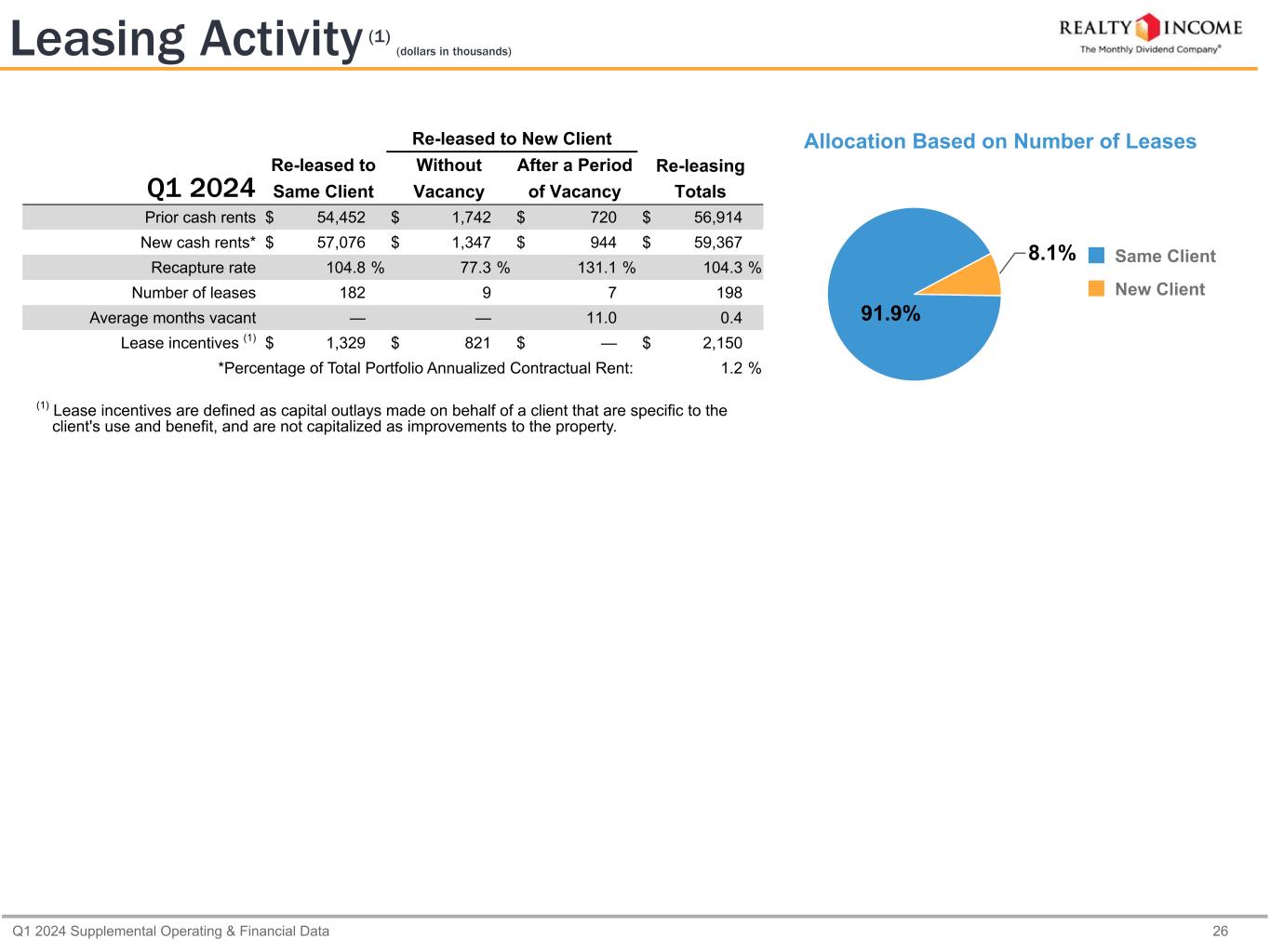 Q1 2024 Supplemental Operating & Financial Data 26 Leasing Activity (1) (dollars in thousands) Q1 2024 Re-leased to New Client Re-leased to Without After a Period Re-leasing Same Client Vacancy of Vacancy Totals Prior cash rents $ 54,452 $ 1,742 $ 720 $ 56,914 New cash rents* $ 57,076 $ 1,347 $ 944 $ 59,367 Recapture rate 104.8 % 77.3 % 131.1 % 104.3 % Number of leases 182 9 7 198 Average months vacant — — 11.0 0.4 Lease incentives (1) $ 1,329 $ 821 $ — $ 2,150 *Percentage of Total Portfolio Annualized Contractual Rent: 1.2 % (1) Lease incentives are defined as capital outlays made on behalf of a client that are specific to the client's use and benefit, and are not capitalized as improvements to the property. Allocation Based on Number of Leases 91.9% 8.1% Same Client New Client