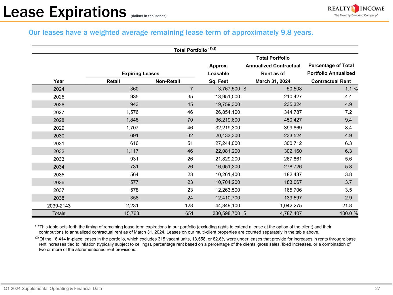 Q1 2024 Supplemental Operating & Financial Data 27 (1) This table sets forth the timing of remaining lease term expirations in our portfolio (excluding rights to extend a lease at the option of the client) and their contributions to annualized contractual rent as of March 31, 2024. Leases on our multi-client properties are counted separately in the table above. (2) Of the 16,414 in-place leases in the portfolio, which excludes 315 vacant units, 13,558, or 82.6% were under leases that provide for increases in rents through: base rent increases tied to inflation (typically subject to ceilings), percentage rent based on a percentage of the clients’ gross sales, fixed increases, or a combination of two or more of the aforementioned rent provisions. Our leases have a weighted average remaining lease term of approximately 9.8 years. Lease Expirations (dollars in thousands) Total Portfolio (1)(2) Total Portfolio Approx. Annualized Contractual Percentage of Total Expiring Leases Leasable Rent as of Portfolio Annualized Year Retail Non-Retail Sq. Feet March 31, 2024 Contractual Rent 2024 360 7 3,767,500 $ 50,508 1.1 % 2025 935 35 13,951,000 210,427 4.4 2026 943 45 19,759,300 235,324 4.9 2027 1,576 46 26,854,100 344,787 7.2 2028 1,848 70 36,219,600 450,427 9.4 2029 1,707 46 32,219,300 399,869 8.4 2030 691 32 20,133,300 233,524 4.9 2031 616 51 27,244,000 300,712 6.3 2032 1,117 46 22,081,200 302,160 6.3 2033 931 26 21,829,200 267,861 5.6 2034 731 26 16,051,300 278,726 5.8 2035 564 23 10,261,400 182,437 3.8 2036 577 23 10,704,200 183,067 3.7 2037 578 23 12,263,500 165,706 3.5 2038 358 24 12,410,700 139,597 2.9 2039-2143 2,231 128 44,849,100 1,042,275 21.8 Totals 15,763 651 330,598,700 $ 4,787,407 100.0 %