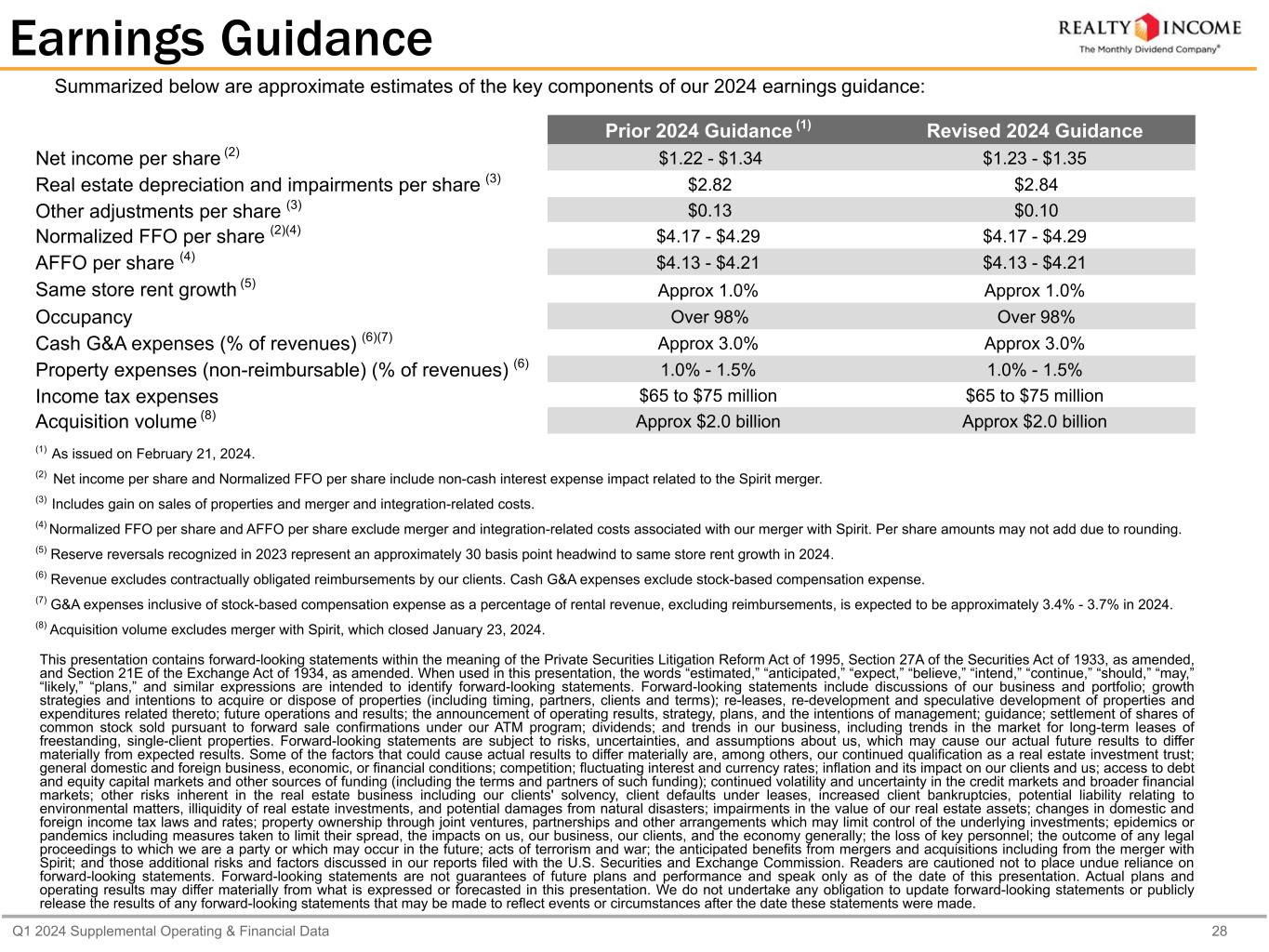 Q1 2024 Supplemental Operating & Financial Data 28 Earnings Guidance Summarized below are approximate estimates of the key components of our 2024 earnings guidance: Prior 2024 Guidance (1) Revised 2024 Guidance Net income per share (2) $1.22 - $1.34 $1.23 - $1.35 Real estate depreciation and impairments per share (3) $2.82 $2.84 Other adjustments per share (3) $0.13 $0.10 Normalized FFO per share (2)(4) $4.17 - $4.29 $4.17 - $4.29 AFFO per share (4) $4.13 - $4.21 $4.13 - $4.21 Same store rent growth (5) Approx 1.0% Approx 1.0% Occupancy Over 98% Over 98% Cash G&A expenses (% of revenues) (6)(7) Approx 3.0% Approx 3.0% Property expenses (non-reimbursable) (% of revenues) (6) 1.0% - 1.5% 1.0% - 1.5% Income tax expenses $65 to $75 million $65 to $75 million Acquisition volume (8) Approx $2.0 billion Approx $2.0 billion (1) As issued on February 21, 2024. (2) Net income per share and Normalized FFO per share include non-cash interest expense impact related to the Spirit merger. (3) Includes gain on sales of properties and merger and integration-related costs. (4) Normalized FFO per share and AFFO per share exclude merger and integration-related costs associated with our merger with Spirit. Per share amounts may not add due to rounding. (5) Reserve reversals recognized in 2023 represent an approximately 30 basis point headwind to same store rent growth in 2024. (6) Revenue excludes contractually obligated reimbursements by our clients. Cash G&A expenses exclude stock-based compensation expense. (7) G&A expenses inclusive of stock-based compensation expense as a percentage of rental revenue, excluding reimbursements, is expected to be approximately 3.4% - 3.7% in 2024. (8) Acquisition volume excludes merger with Spirit, which closed January 23, 2024. This presentation contains forward-looking statements within the meaning of the Private Securities Litigation Reform Act of 1995, Section 27A of the Securities Act of 1933, as amended, and Section 21E of the Exchange Act of 1934, as amended. When used in this presentation, the words “estimated,” “anticipated,” “expect,” “believe,” “intend,” “continue,” “should,” “may,” “likely,” “plans,” and similar expressions are intended to identify forward-looking statements. Forward-looking statements include discussions of our business and portfolio; growth strategies and intentions to acquire or dispose of properties (including timing, partners, clients and terms); re-leases, re-development and speculative development of properties and expenditures related thereto; future operations and results; the announcement of operating results, strategy, plans, and the intentions of management; guidance; settlement of shares of common stock sold pursuant to forward sale confirmations under our ATM program; dividends; and trends in our business, including trends in the market for long-term leases of freestanding, single-client properties. Forward-looking statements are subject to risks, uncertainties, and assumptions about us, which may cause our actual future results to differ materially from expected results. Some of the factors that could cause actual results to differ materially are, among others, our continued qualification as a real estate investment trust; general domestic and foreign business, economic, or financial conditions; competition; fluctuating interest and currency rates; inflation and its impact on our clients and us; access to debt and equity capital markets and other sources of funding (including the terms and partners of such funding); continued volatility and uncertainty in the credit markets and broader financial markets; other risks inherent in the real estate business including our clients' solvency, client defaults under leases, increased client bankruptcies, potential liability relating to environmental matters, illiquidity of real estate investments, and potential damages from natural disasters; impairments in the value of our real estate assets; changes in domestic and foreign income tax laws and rates; property ownership through joint ventures, partnerships and other arrangements which may limit control of the underlying investments; epidemics or pandemics including measures taken to limit their spread, the impacts on us, our business, our clients, and the economy generally; the loss of key personnel; the outcome of any legal proceedings to which we are a party or which may occur in the future; acts of terrorism and war; the anticipated benefits from mergers and acquisitions including from the merger with Spirit; and those additional risks and factors discussed in our reports filed with the U.S. Securities and Exchange Commission. Readers are cautioned not to place undue reliance on forward-looking statements. Forward-looking statements are not guarantees of future plans and performance and speak only as of the date of this presentation. Actual plans and operating results may differ materially from what is expressed or forecasted in this presentation. We do not undertake any obligation to update forward-looking statements or publicly release the results of any forward-looking statements that may be made to reflect events or circumstances after the date these statements were made.
