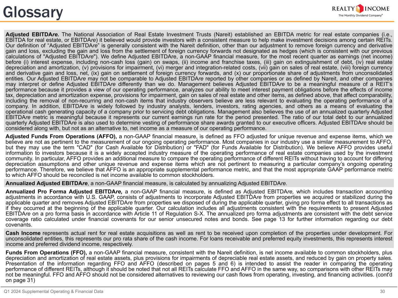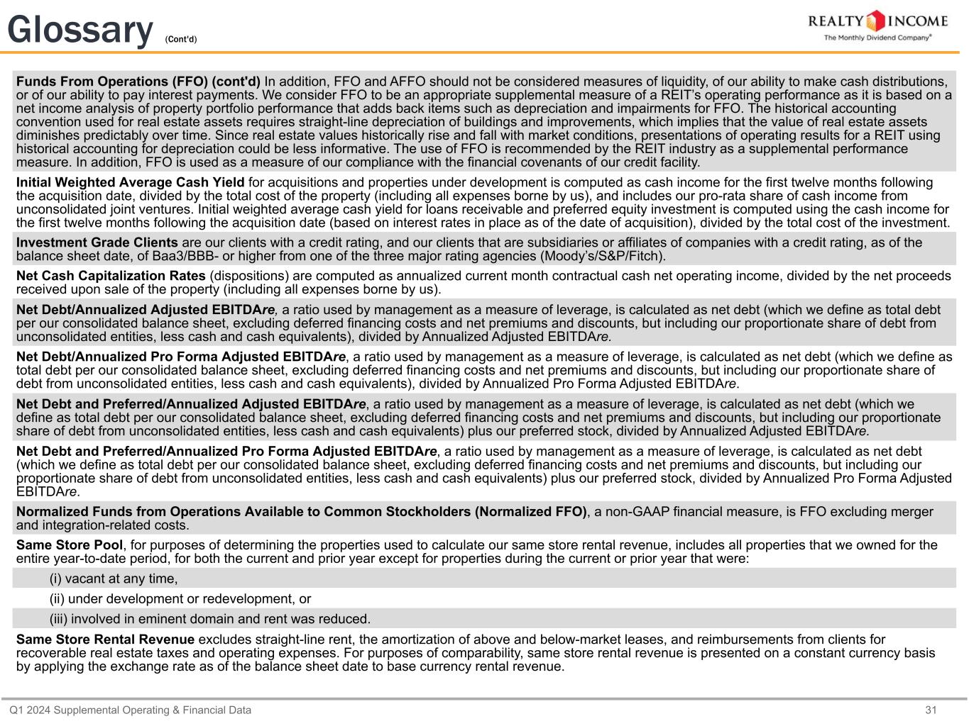 Q1 2024 Supplemental Operating & Financial Data 30 Glossary Adjusted EBITDAre. The National Association of Real Estate Investment Trusts (Nareit) established an EBITDA metric for real estate companies (i.e., EBITDA for real estate, or EBITDAre) it believed would provide investors with a consistent measure to help make investment decisions among certain REITs. Our definition of “Adjusted EBITDAre” is generally consistent with the Nareit definition, other than our adjustment to remove foreign currency and derivative gain and loss, excluding the gain and loss from the settlement of foreign currency forwards not designated as hedges (which is consistent with our previous calculations of "Adjusted EBITDAre"). We define Adjusted EBITDAre, a non-GAAP financial measure, for the most recent quarter as earnings (net income) before (i) interest expense, including non-cash loss (gain) on swaps, (ii) income and franchise taxes, (iii) gain on extinguishment of debt, (iv) real estate depreciation and amortization, (v) provisions for impairment, (vi) merger and integration-related costs, (vii) gain on sales of real estate, (viii) foreign currency and derivative gain and loss, net, (ix) gain on settlement of foreign currency forwards, and (x) our proportionate share of adjustments from unconsolidated entities. Our Adjusted EBITDAre may not be comparable to Adjusted EBITDAre reported by other companies or as defined by Nareit, and other companies may interpret or define Adjusted EBITDAre differently than we do. Management believes Adjusted EBITDAre to be a meaningful measure of a REIT’s performance because it provides a view of our operating performance, analyzes our ability to meet interest payment obligations before the effects of income tax, depreciation and amortization expense, provisions for impairment, gain on sales of real estate and other items, as defined above, that affect comparability, including the removal of non-recurring and non-cash items that industry observers believe are less relevant to evaluating the operating performance of a company. In addition, EBITDAre is widely followed by industry analysts, lenders, investors, rating agencies, and others as a means of evaluating the operational cash generating capacity of a company prior to servicing debt obligations. Management also believes the use of an annualized quarterly Adjusted EBITDAre metric is meaningful because it represents our current earnings run rate for the period presented. The ratio of our total debt to our annualized quarterly Adjusted EBITDAre is also used to determine vesting of performance share awards granted to our executive officers. Adjusted EBITDAre should be considered along with, but not as an alternative to, net income as a measure of our operating performance. Adjusted Funds From Operations (AFFO), a non-GAAP financial measure, is defined as FFO adjusted for unique revenue and expense items, which we believe are not as pertinent to the measurement of our ongoing operating performance. Most companies in our industry use a similar measurement to AFFO, but they may use the term "CAD" (for Cash Available for Distribution) or "FAD" (for Funds Available for Distribution). We believe AFFO provides useful information to investors because it is a widely accepted industry measure of the operating performance of real estate companies used by the investment community. In particular, AFFO provides an additional measure to compare the operating performance of different REITs without having to account for differing depreciation assumptions and other unique revenue and expense items which are not pertinent to measuring a particular company’s ongoing operating performance. Therefore, we believe that AFFO is an appropriate supplemental performance metric, and that the most appropriate GAAP performance metric to which AFFO should be reconciled is net income available to common stockholders. Annualized Adjusted EBITDAre, a non-GAAP financial measure, is calculated by annualizing Adjusted EBITDAre. Annualized Pro Forma Adjusted EBITDAre, a non-GAAP financial measure, is defined as Adjusted EBITDAre, which includes transaction accounting adjustments in accordance with U.S. GAAP, consists of adjustments to incorporate Adjusted EBITDAre from properties we acquired or stabilized during the applicable quarter and removes Adjusted EBITDAre from properties we disposed of during the applicable quarter, giving pro forma effect to all transactions as if they occurred at the beginning of the applicable quarter. Our calculation includes all adjustments consistent with the requirements to present Adjusted EBITDAre on a pro forma basis in accordance with Article 11 of Regulation S-X. The annualized pro forma adjustments are consistent with the debt service coverage ratio calculated under financial covenants for our senior unsecured notes and bonds. See page 13 for further information regarding our debt covenants. Cash Income represents actual rent for real estate acquisitions as well as rent to be received upon completion of the properties under development. For unconsolidated entities, this represents our pro rata share of the cash income. For loans receivable and preferred equity investments, this represents interest income and preferred dividend income, respectively. Funds From Operations (FFO), a non-GAAP financial measure, consistent with the Nareit definition, is net income available to common stockholders, plus depreciation and amortization of real estate assets, plus provisions for impairments of depreciable real estate assets, and reduced by gain on property sales. Presentation of the information regarding FFO and AFFO (described on pages 5 and 6) is intended to assist the reader in comparing the operating performance of different REITs, although it should be noted that not all REITs calculate FFO and AFFO in the same way, so comparisons with other REITs may not be meaningful. FFO and AFFO should not be considered alternatives to