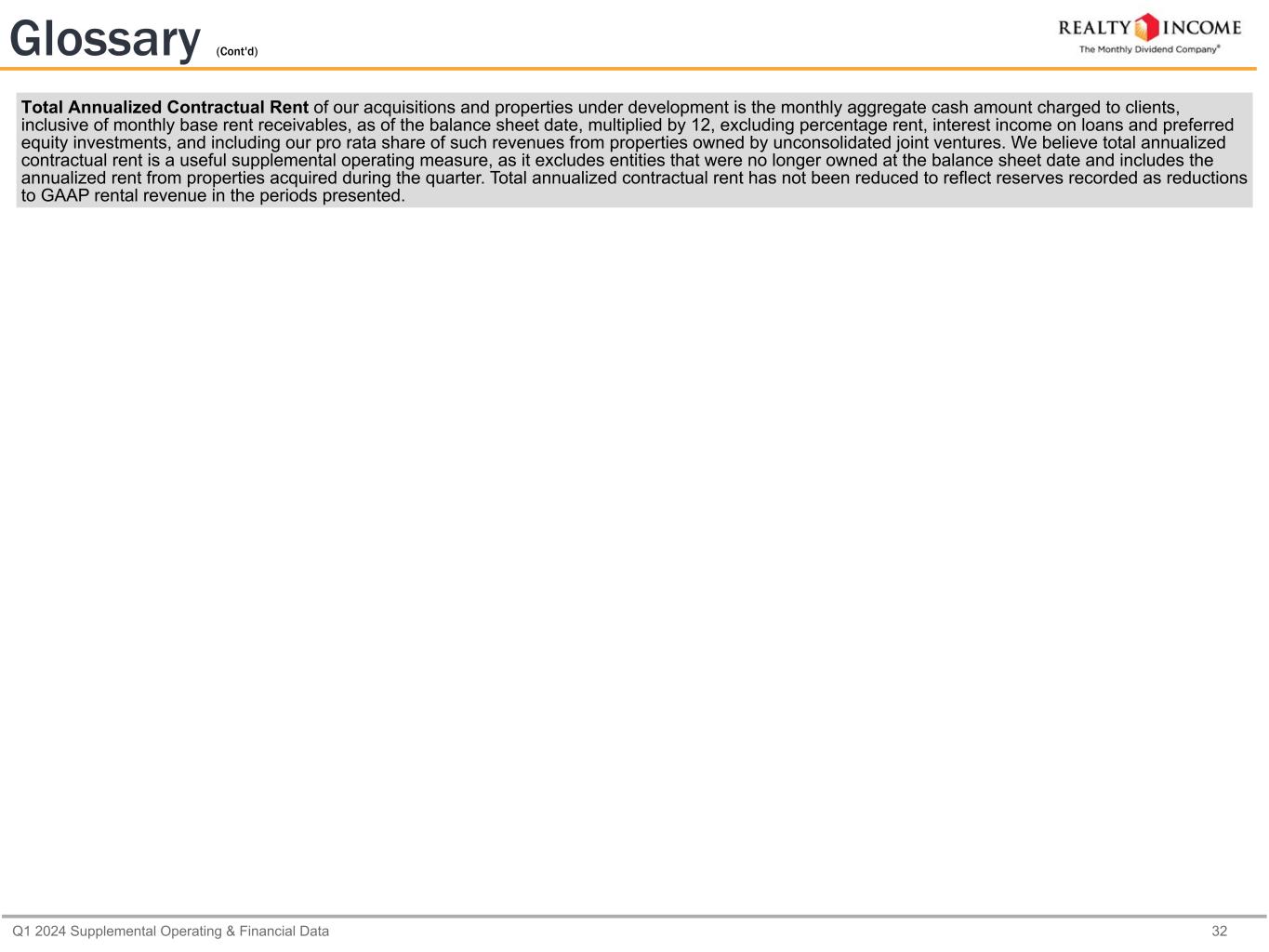 Q1 2024 Supplemental Operating & Financial Data 32 Glossary (Cont'd) Total Annualized Contractual Rent of our acquisitions and properties under development is the monthly aggregate cash amount charged to clients, inclusive of monthly base rent receivables, as of the balance sheet date, multiplied by 12, excluding percentage rent, interest income on loans and preferred equity investments, and including our pro rata share of such revenues from properties owned by unconsolidated joint ventures. We believe total annualized contractual rent is a useful supplemental operating measure, as it excludes entities that were no longer owned at the balance sheet date and includes the annualized rent from properties acquired during the quarter. Total annualized contractual rent has not been reduced to reflect reserves recorded as reductions to GAAP rental revenue in the periods presented.