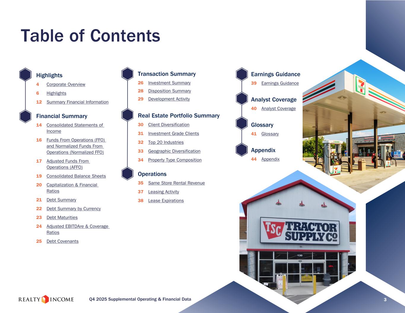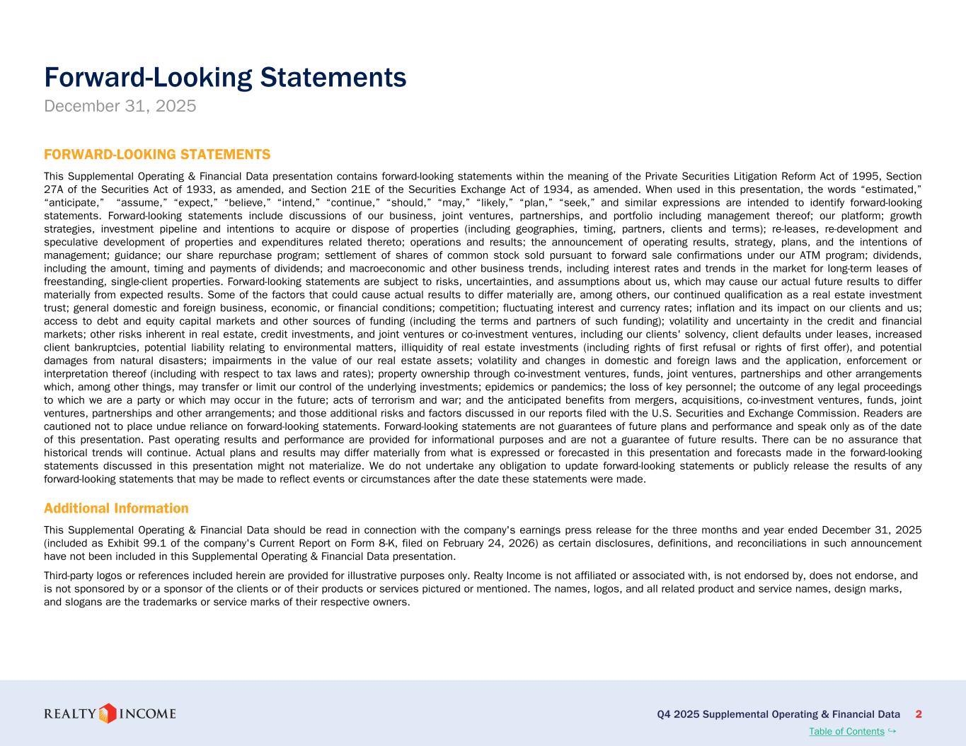 Q4 2025 Supplemental Operating & Financial Data 2 Forward-Looking Statements December 31, 2025 FORWARD-LOOKING STATEMENTS This Supplemental Operating & Financial Data presentation contains forward-looking statements within the meaning of the Private Securities Litigation Reform Act of 1995, Section 27A of the Securities Act of 1933, as amended, and Section 21E of the Securities Exchange Act of 1934, as amended. When used in this presentation, the words “estimated,” “anticipate,” “assume,” “expect,” “believe,” “intend,” “continue,” “should,” “may,” “likely,” “plan,” “seek,” and similar expressions are intended to identify forward-looking statements. Forward-looking statements include discussions of our business, joint ventures, partnerships, and portfolio including management thereof; our platform; growth strategies, investment pipeline and intentions to acquire or dispose of properties (including geographies, timing, partners, clients and terms); re-leases, re-development and speculative development of properties and expenditures related thereto; operations and results; the announcement of operating results, strategy, plans, and the intentions of management; guidance; our share repurchase program; settlement of shares of common stock sold pursuant to forward sale confirmations under our ATM program; dividends, including the amount, timing and payments of dividends; and macroeconomic and other business trends, including interest rates and trends in the market for long-term leases of freestanding, single-client properties. Forward-looking statements are subject to risks, uncertainties, and assumptions about us, which may cause our actual future results to differ materially from expected results. Some of the factors that could cause actual results to differ materially are, among others, our continued qualification as a real estate investment trust; general domestic and foreign business, economic, or financial conditions; competition; fluctuating interest and currency rates; inflation and its impact on our clients and us; access to debt and equity capital markets and other sources of funding (including the terms and partners of such funding); volatility and uncertainty in the credit and financial markets; other risks inherent in real estate, credit investments, and joint ventures or co-investment ventures, including our clients' solvency, client defaults under leases, increased client bankruptcies, potential liability relating to environmental matters, illiquidity of real estate investments (including rights of first refusal or rights of first offer), and potential damages from natural disasters; impairments in the value of our real estate assets; volatility and changes in domestic and foreign laws and the application, enforcement or interpretation thereof (including with respect to tax laws and rates); property ownership through co-investment ventures, funds, joint ventures, partnerships and other arrangements which, among other things, may transfer or limit our control of the underlying investments; epidemics or pandemics; the loss of key personnel; the outcome of any legal proceedings to which we are a party or which may occur in the future; acts of terrorism and war; and the anticipated benefits from mergers, acquisitions, co-investment ventures, funds, joint ventures, partnerships and other arrangements; and those additional risks and factors discussed in our reports filed with the U.S. Securities and Exchange Commission. Readers are cautioned not to place undue reliance on forward-looking statements. Forward-looking statements are not guarantees of future plans and performance and speak only as of the date of this presentation. Past operating results and performance are provided for informational purposes and are not a guarantee of future results. There can be no assurance that historical trends will continue. Actual plans and results may differ materially from what is expressed or forecasted in this presentation and forecasts made in the forward-looking statements discussed in this presentation might not materialize. We do not undertake any obligation to update forward-looking statements or publicly release the results of any forward-looking statements that may be made to reflect events or circumstances after the date these statements were made. Additional Information This Supplemental Operating & Financial Data should be read in connection with the company's earnings press release for the three months and year ended December 31, 2025 (included as Exhibit 99.1 of the company's Current Report on Form 8-K, filed on February 24, 2026) as certain disclosures, definitions, and reconciliations in such announcement have not been included in this Supplemental Operating & Financial Data presentation. Third-party logos or references included herein are provided for illustrative purposes only. Realty Income is not affiliated or associated with, is not endorsed by, does not endorse, and is not sponsored by or a sponsor of the clients or of their products or services pictured or mentioned. The names, logos, and all related product and service names, design marks, and slogans are the trademarks or service marks of their respective owners. Table of Contents ↪