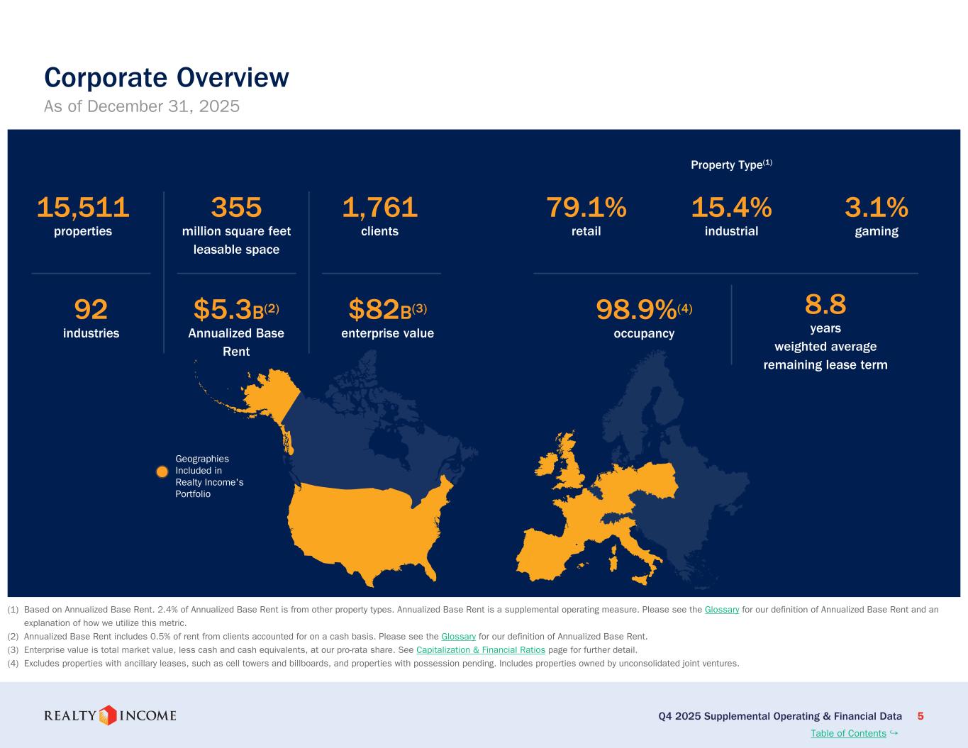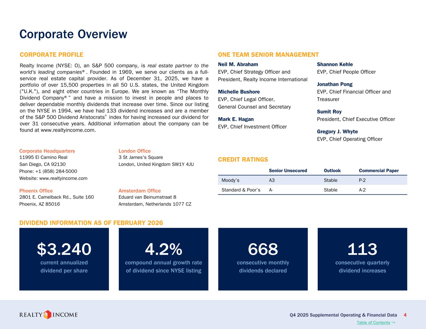 Q4 2025 Supplemental Operating & Financial Data 4 Corporate Overview CORPORATE PROFILE Realty Income (NYSE: O), an S&P 500 company, is real estate partner to the world's leading companies®. Founded in 1969, we serve our clients as a full- service real estate capital provider. As of December 31, 2025, we have a portfolio of over 15,500 properties in all 50 U.S. states, the United Kingdom ("U.K."), and eight other countries in Europe. We are known as “The Monthly Dividend Company®” and have a mission to invest in people and places to deliver dependable monthly dividends that increase over time. Since our listing on the NYSE in 1994, we have had 133 dividend increases and are a member of the S&P 500 Dividend Aristocrats® index for having increased our dividend for over 31 consecutive years. Additional information about the company can be found at www.realtyincome.com. Corporate Headquarters 11995 El Camino Real San Diego, CA 92130 Phone: +1 (858) 284-5000 Website: www.realtyincome.com Phoenix Office 2801 E. Camelback Rd., Suite 160 Phoenix, AZ 85016 London Office 3 St James's Square London, United Kingdom SW1Y 4JU Amsterdam Office Eduard van Beinumstraat 8 Amsterdam, Netherlands 1077 CZ ONE TEAM SENIOR MANAGEMENT Neil M. Abraham EVP, Chief Strategy Officer and President, Realty Income International Michelle Bushore EVP, Chief Legal Officer, General Counsel and Secretary Mark E. Hagan EVP, Chief Investment Officer Shannon Kehle EVP, Chief People Officer Jonathan Pong EVP, Chief Financial Officer and Treasurer Sumit Roy President, Chief Executive Officer Gregory J. Whyte EVP, Chief Operating Officer CREDIT RATINGS Senior Unsecured Outlook Commercial Paper Moody’s A3 Stable P-2 Standard & Poor’s A- Stable A-2 DIVIDEND INFORMATION AS OF FEBRUARY 2026 $3.240 current annualized dividend per share 668 consecutive monthly dividends declared 113 consecutive quarterly dividend increases 4.2% compound annual growth rate of dividend since NYSE listing Table of Contents ↪
