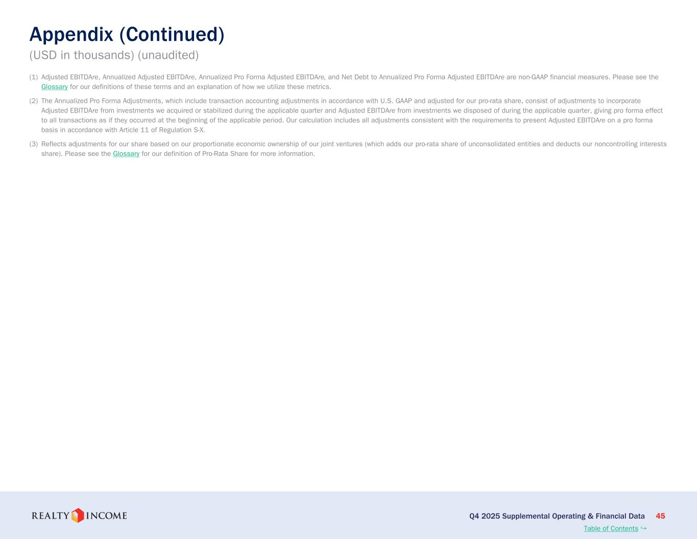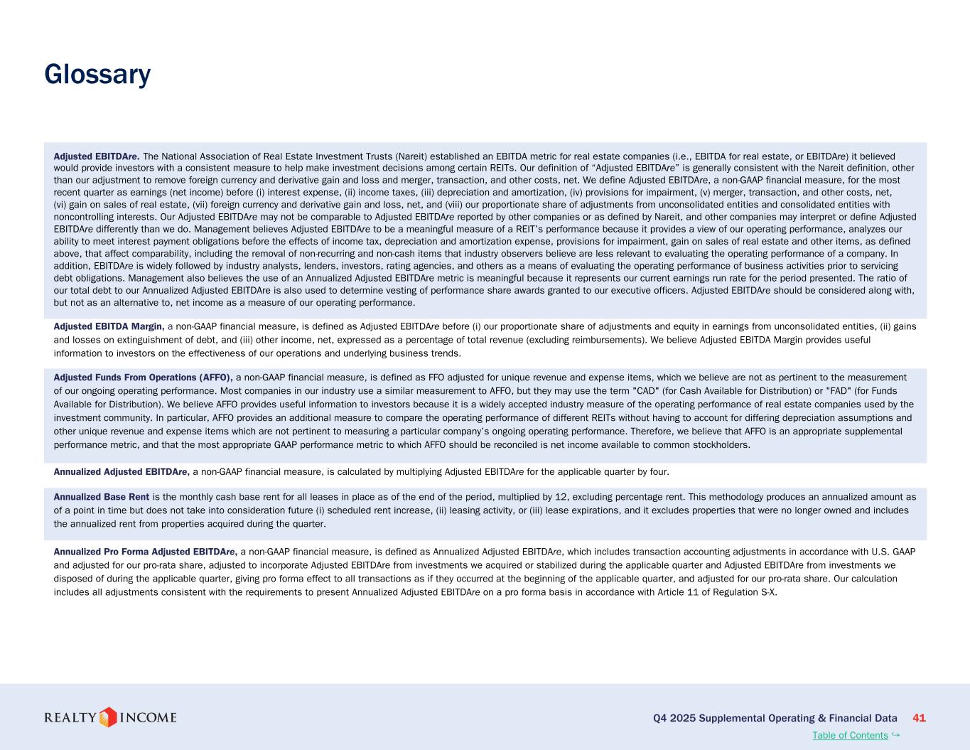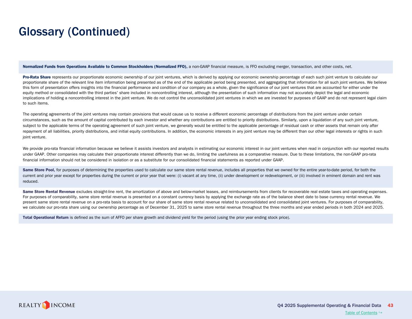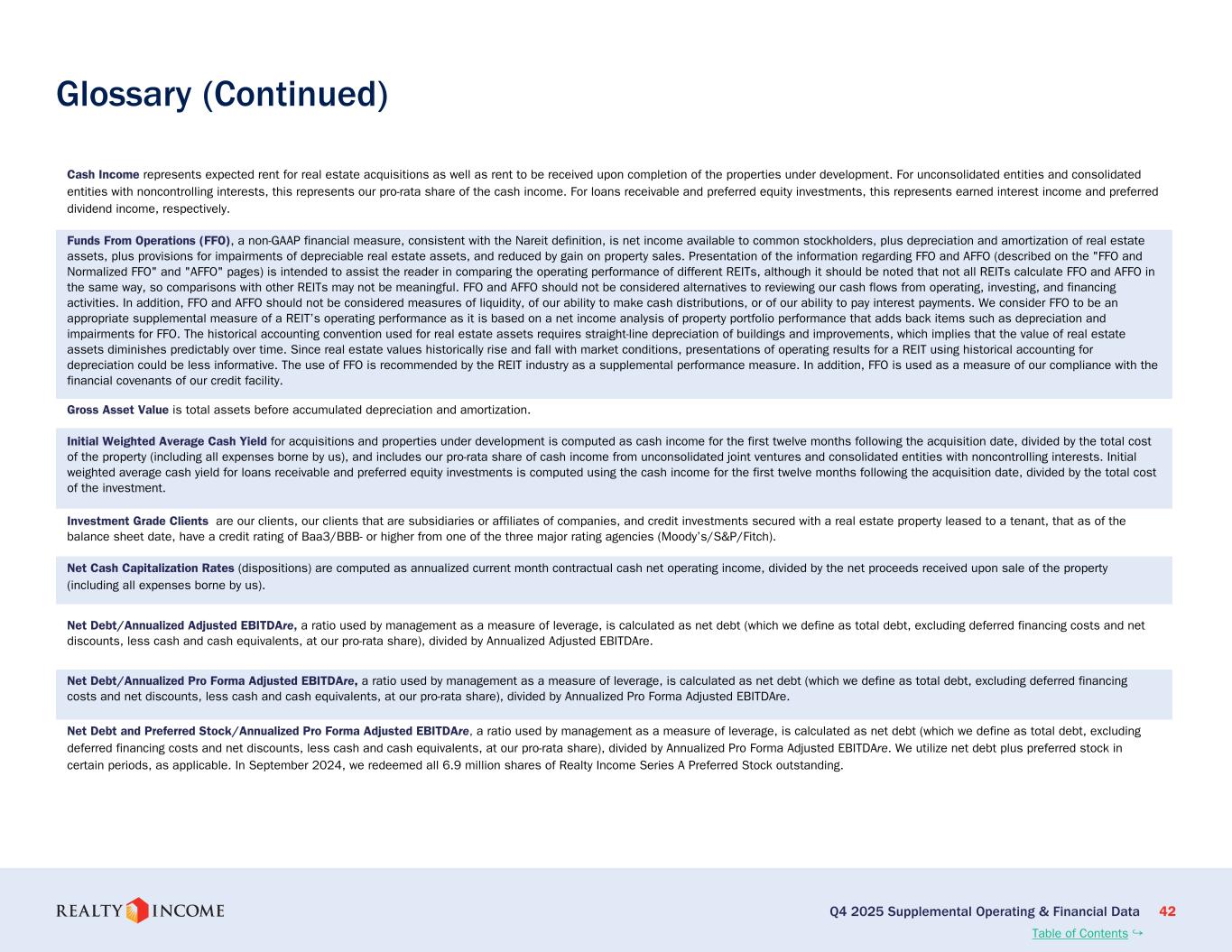 Q4 2025 Supplemental Operating & Financial Data 42 Cash Income represents expected rent for real estate acquisitions as well as rent to be received upon completion of the properties under development. For unconsolidated entities and consolidated entities with noncontrolling interests, this represents our pro-rata share of the cash income. For loans receivable and preferred equity investments, this represents earned interest income and preferred dividend income, respectively. Funds From Operations (FFO), a non-GAAP financial measure, consistent with the Nareit definition, is net income available to common stockholders, plus depreciation and amortization of real estate assets, plus provisions for impairments of depreciable real estate assets, and reduced by gain on property sales. Presentation of the information regarding FFO and AFFO (described on the "FFO and Normalized FFO" and "AFFO" pages) is intended to assist the reader in comparing the operating performance of different REITs, although it should be noted that not all REITs calculate FFO and AFFO in the same way, so comparisons with other REITs may not be meaningful. FFO and AFFO should not be considered alternatives to reviewing our cash flows from operating, investing, and financing activities. In addition, FFO and AFFO should not be considered measures of liquidity, of our ability to make cash distributions, or of our ability to pay interest payments. We consider FFO to be an appropriate supplemental measure of a REIT’s operating performance as it is based on a net income analysis of property portfolio performance that adds back items such as depreciation and impairments for FFO. The historical accounting convention used for real estate assets requires straight-line depreciation of buildings and improvements, which implies that the value of real estate assets diminishes predictably over time. Since real estate values historically rise and fall with market conditions, presentations of operating results for a REIT using historical accounting for depreciation could be less informative. The use of FFO is recommended by the REIT industry as a supplemental performance measure. In addition, FFO is used as a measure of our compliance with the financial covenants of our credit facility. Gross Asset Value is total assets before accumulated depreciation and amortization. Initial Weighted Average Cash Yield for acquisitions and properties under development is computed as cash income for the first twelve months following the acquisition date, divided by the total cost of the property (including all expenses borne by us), and includes our pro-rata share of cash income from unconsolidated joint ventures and consolidated entities with noncontrolling interests. Initial weighted average cash yield for loans receivable and preferred equity investments is computed using the cash income for the first twelve months following the acquisition date, divided by the total cost of the investment. Investment Grade Clients are our clients, our clients that are subsidiaries or affiliates of companies, and credit investments secured with a real estate property leased to a tenant, that as of the balance sheet date, have a credit rating of Baa3/BBB- or higher from one of the three major rating agencies (Moody’s/S&P/Fitch). Net Cash Capitalization Rates (dispositions) are computed as annualized current month contractual cash net operating income, divided by the net proceeds received upon sale of the property (including all expenses borne by us). Net Debt/Annualized Adjusted EBITDAre, a ratio used by management as a measure of leverage, is calculated as net debt (which we define as total debt, excluding deferred financing costs and net discounts, less cash and cash equivalents, at our pro-rata share), divided by Annualized Adjusted EBITDAre. Net Debt/Annualized Pro Forma Adjusted EBITDAre, a ratio used by management as a measure of leverage, is calculated as net debt (which we define as total debt, excluding deferred financing costs and net discounts, less cash and cash equivalents, at our pro-rata share), divided by Annualized Pro Forma Adjusted EBITDAre. Net Debt and Preferred Stock/Annualized Pro Forma Adjusted EBITDAre, a ratio used by management as a measure of leverage, is calculated as net debt (which we define as total debt, excluding deferred financing costs and net discounts, less cash and cash equivalents, at our pro-rata share), divided by Annualized Pro Forma Adjusted EBITDAre. We utilize net debt plus preferred stock in certain periods, as applicable. In September 2024, we redeemed all 6.9 million shares of Realty Income Series A Preferred Stock outstanding. Glossary (Continued) Table of Contents ↪