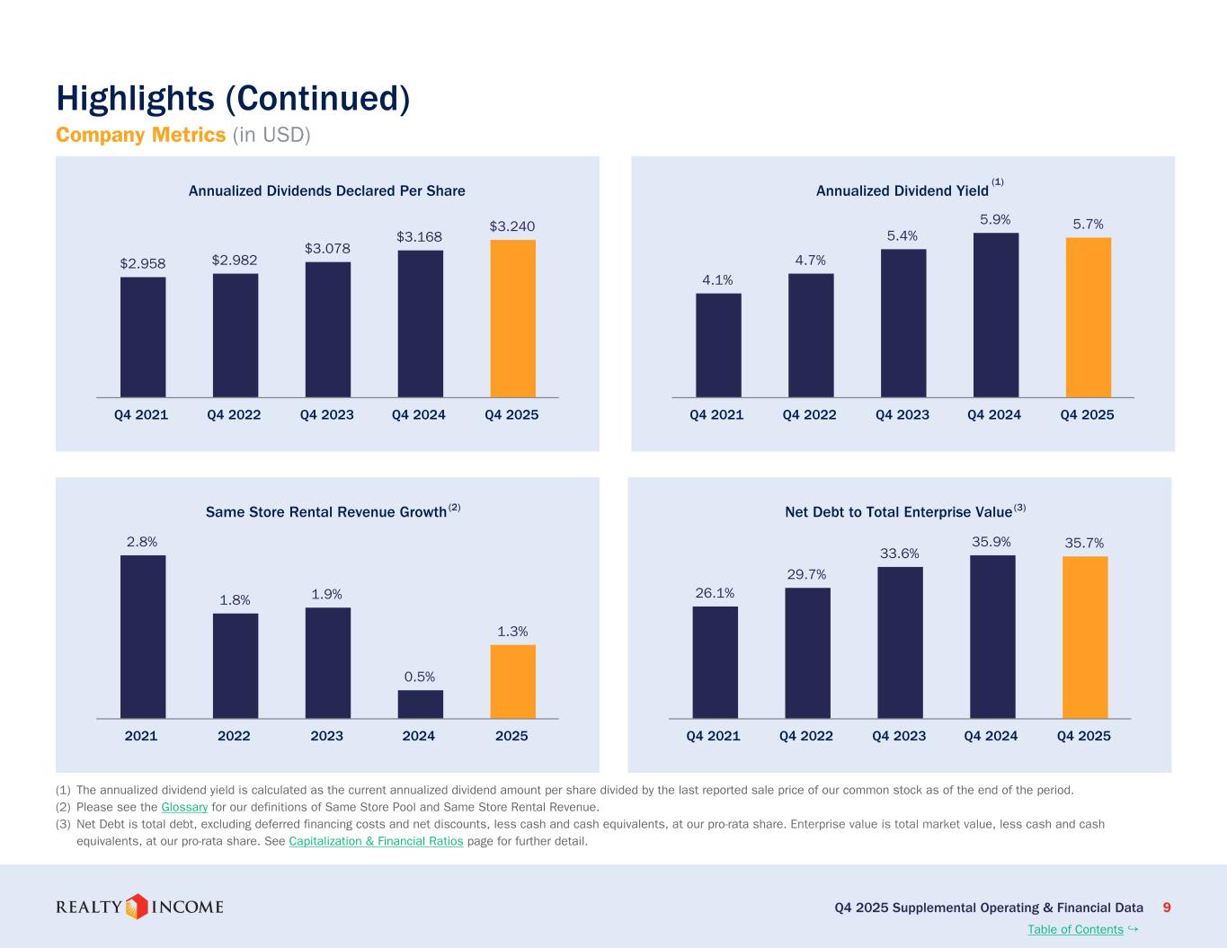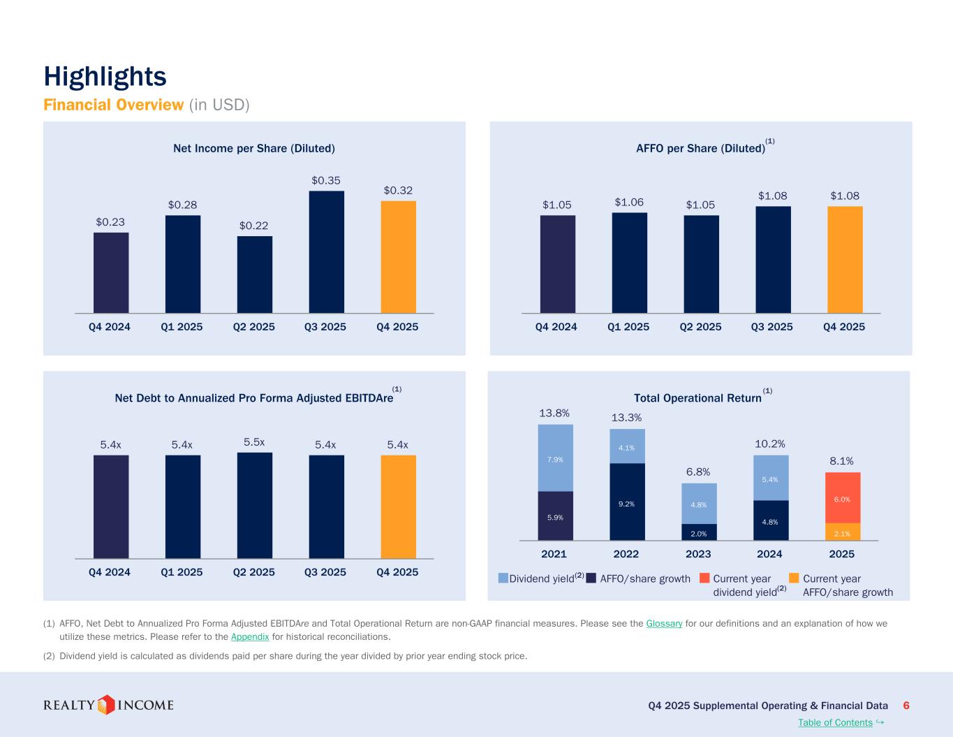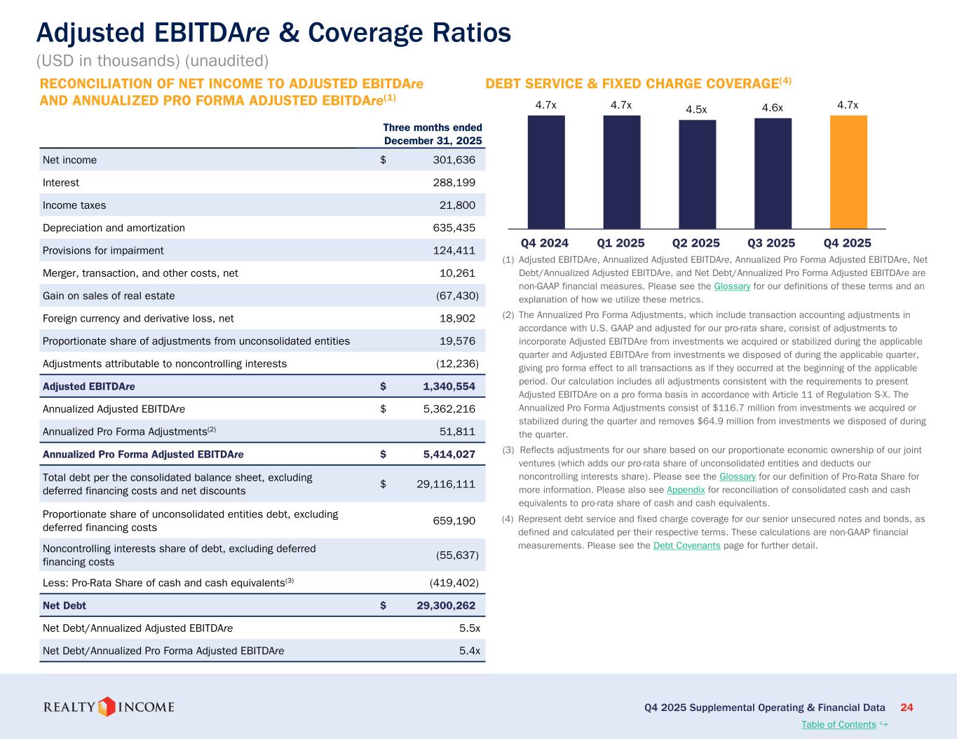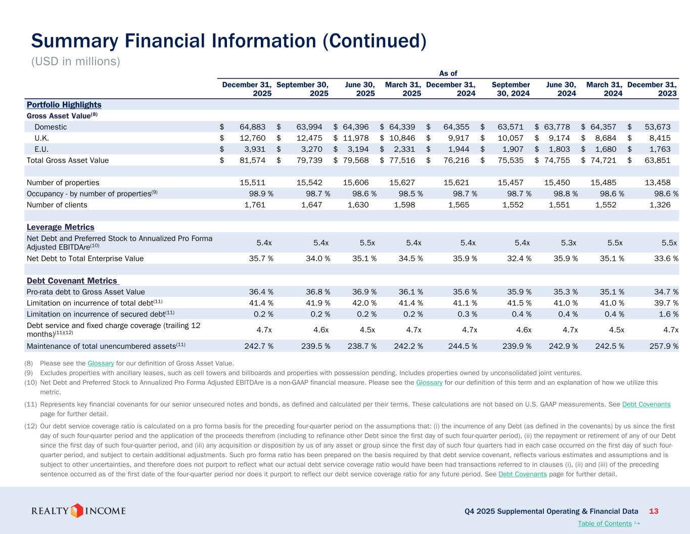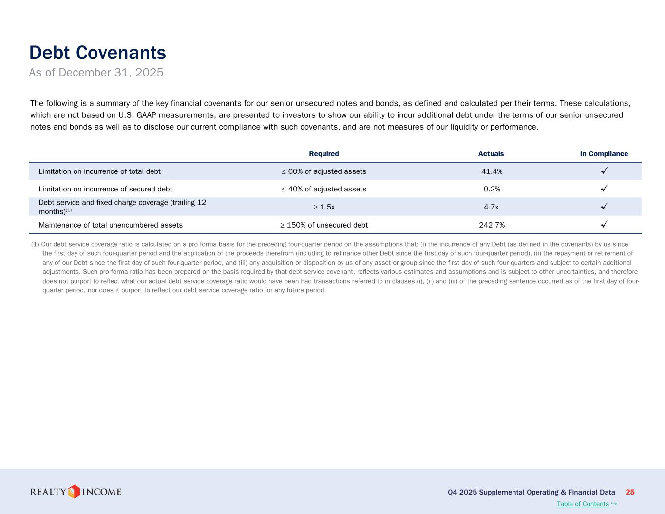 Q4 2025 Supplemental Operating & Financial Data 42 Cash Income represents expected rent for real estate acquisitions as well as rent to be received upon completion of the properties under development. For unconsolidated entities and consolidated entities with noncontrolling interests, this represents our pro-rata share of the cash income. For loans receivable and preferred equity investments, this represents earned interest income and preferred dividend income, respectively. Funds From Operations (FFO), a non-GAAP financial measure, consistent with the Nareit definition, is net income available to common stockholders, plus depreciation and amortization of real estate assets, plus provisions for impairments of depreciable real estate assets, and reduced by gain on property sales. Presentation of the information regarding FFO and AFFO (described on the "FFO and Normalized FFO" and "AFFO" pages) is intended to assist the reader in comparing the operating performance of different REITs, although it should be noted that not all REITs calculate FFO and AFFO in the same way, so comparisons with other REITs may not be meaningful. FFO and AFFO should not be considered alternatives to reviewing our cash flows from operating, investing, and financing activities. In addition, FFO and AFFO should not be considered measures of liquidity, of our ability to make cash distributions, or of our ability to pay interest payments. We consider FFO to be an appropriate supplemental measure of a REIT’s operating performance as it is based on a net income analysis of property portfolio performance that adds back items such as depreciation and impairments for FFO. The historical accounting convention used for real estate assets requires straight-line depreciation of buildings and improvements, which implies that the value of real estate assets diminishes predictably over time. Since real estate values historically rise and fall with market conditions, presentations of operating results for a REIT using historical accounting for depreciation could be less informative. The use of FFO is recommended by the REIT industry as a supplemental performance measure. In addition, FFO is used as a measure of our compliance with the financial covenants of our credit facility. Gross Asset Value is total assets before accumulated depreciation and amortization. Initial Weighted Average Cash Yield for acquisitions and properties under development is computed as cash income for the first twelve months following the acquisition date, divided by the total cost of the property (including all expenses borne by us), and includes our pro-rata share of cash income from unconsolidated joint ventures and consolidated entities with noncontrolling interests. Initial weighted average cash yield for loans receivable and preferred equity investments is computed using the cash income for the first twelve months following the acquisition date, divided by the total cost of the investment. Investment Grade Clients are our clients, our clients that are subsidiaries or affiliates of companies, and credit investments secured with a real estate property leased to a tenant, that as of the balance sheet date, have a credit rating of Baa3/BBB- or higher from one of the three major rating agencies (Moody’s/S&P/Fitch). Net Cash Capitalization Rates (dispositions) are computed as annualized current month contractual cash net operating income, divided by the net proceeds received upon sale of the property (including all expenses borne by us). Net Debt/Annualized Adjusted EBITDAre, a ratio used by management as a measure of leverage, is calculated as net debt (which we define as total debt, excluding deferred financing costs and net discounts, less cash and cash equivalents, at our pro-rata share), divided by Annualized Adjusted EBITDAre. Net Debt/Annualized Pro Forma Adjusted EBITDAre, a ratio used by management as a measure of leverage, is calculated as net debt (which we define as total debt, excluding deferred financing costs and net discounts, less cash and cash equivalents, at our pro-rata share), divided by Annualized Pro Forma Adjusted EBITDAre. Net Debt and Preferred Stock/Annualized Pro Forma Adjusted EBITDAre, a ratio used by management as a measure of leverage, is calculated as net debt (which we define as total debt, excluding deferred financing costs and net discounts, less cash and cash equivalents, at our pro-rata share), divided by Annualized Pro Forma Adjusted EBITDAre. We utilize net debt plus preferred stock in certain periods, as applicable. In September 2024, we redeemed all 6.9 million shares of Realty Income Series A Preferred Stock outstanding. Glossary (Continued) Table of Contents ↪