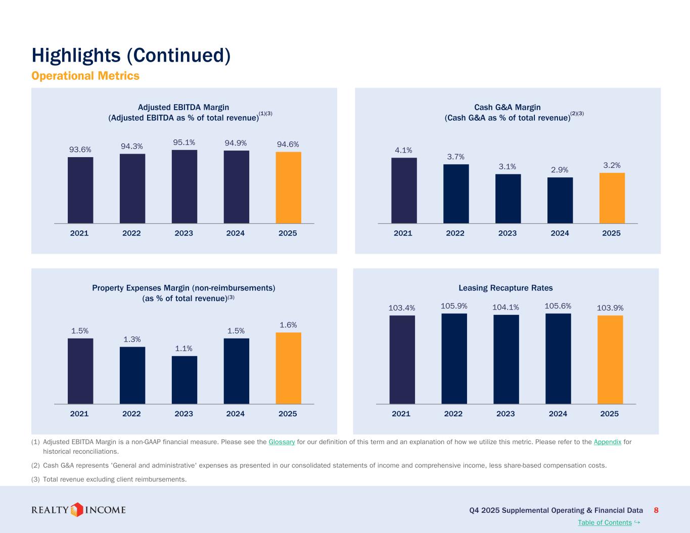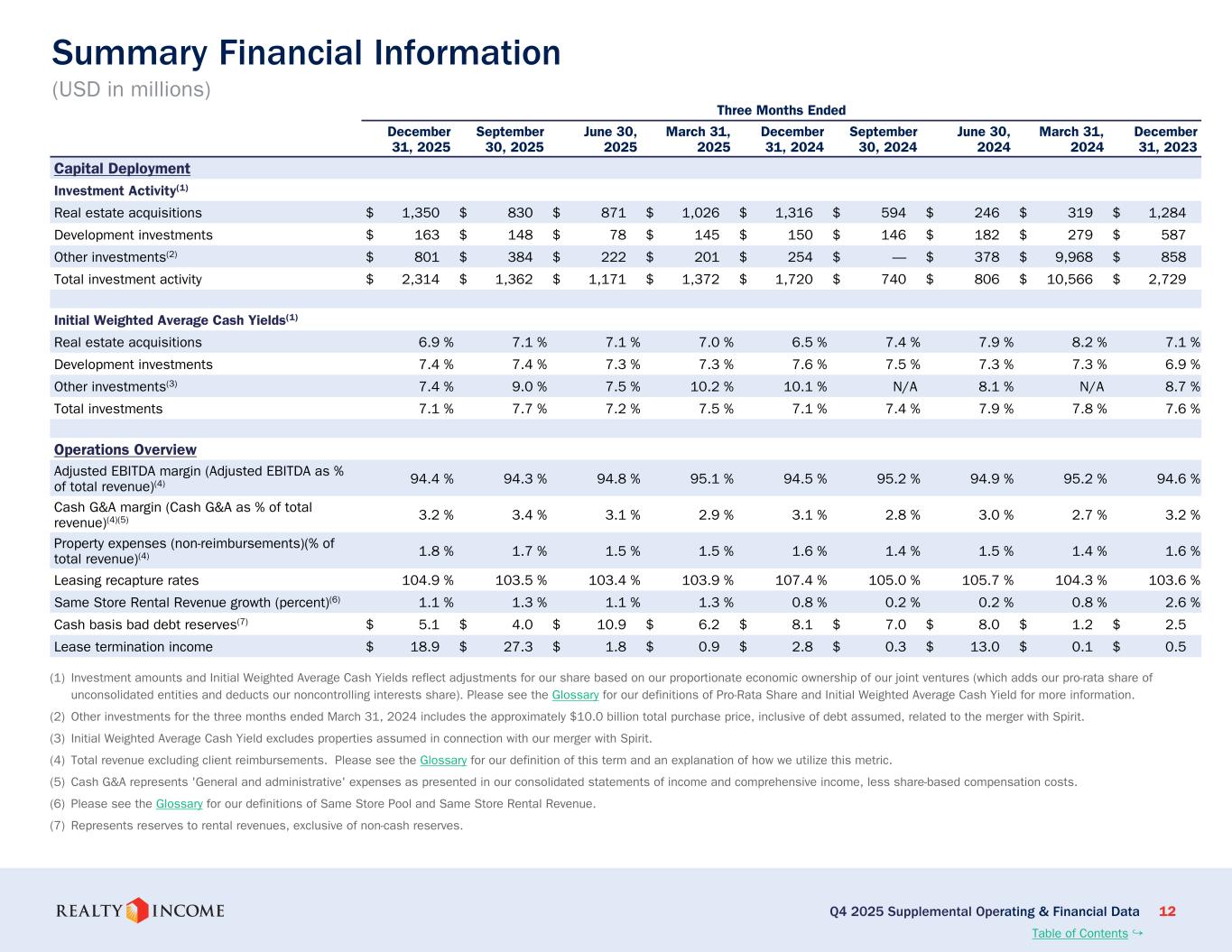 Q4 2025 Supplemental Operating & Financial Data 12 Summary Financial Information (USD in millions) Three Months Ended December 31, 2025 September 30, 2025 June 30, 2025 March 31, 2025 December 31, 2024 September 30, 2024 June 30, 2024 March 31, 2024 December 31, 2023 Capital Deployment Investment Activity(1) Real estate acquisitions $ 1,350 $ 830 $ 871 $ 1,026 $ 1,316 $ 594 $ 246 $ 319 $ 1,284 Development investments $ 163 $ 148 $ 78 $ 145 $ 150 $ 146 $ 182 $ 279 $ 587 Other investments(2) $ 801 $ 384 $ 222 $ 201 $ 254 $ — $ 378 $ 9,968 $ 858 Total investment activity $ 2,314 $ 1,362 $ 1,171 $ 1,372 $ 1,720 $ 740 $ 806 $ 10,566 $ 2,729 Initial Weighted Average Cash Yields(1) Real estate acquisitions 6.9 % 7.1 % 7.1 % 7.0 % 6.5 % 7.4 % 7.9 % 8.2 % 7.1 % Development investments 7.4 % 7.4 % 7.3 % 7.3 % 7.6 % 7.5 % 7.3 % 7.3 % 6.9 % Other investments(3) 7.4 % 9.0 % 7.5 % 10.2 % 10.1 % N/A 8.1 % N/A 8.7 % Total investments 7.1 % 7.7 % 7.2 % 7.5 % 7.1 % 7.4 % 7.9 % 7.8 % 7.6 % Operations Overview Adjusted EBITDA margin (Adjusted EBITDA as % of total revenue)(4) 94.4 % 94.3 % 94.8 % 95.1 % 94.5 % 95.2 % 94.9 % 95.2 % 94.6 % Cash G&A margin (Cash G&A as % of total revenue)(4)(5) 3.2 % 3.4 % 3.1 % 2.9 % 3.1 % 2.8 % 3.0 % 2.7 % 3.2 % Property expenses (non-reimbursements)(% of total revenue)(4) 1.8 % 1.7 % 1.5 % 1.5 % 1.6 % 1.4 % 1.5 % 1.4 % 1.6 % Leasing recapture rates 104.9 % 103.5 % 103.4 % 103.9 % 107.4 % 105.0 % 105.7 % 104.3 % 103.6 % Same Store Rental Revenue growth (percent)(6) 1.1 % 1.3 % 1.1 % 1.3 % 0.8 % 0.2 % 0.2 % 0.8 % 2.6 % Cash basis bad debt reserves(7) $ 5.1 $ 4.0 $ 10.9 $ 6.2 $ 8.1 $ 7.0 $ 8.0 $ 1.2 $ 2.5 Lease termination income $ 18.9 $ 27.3 $ 1.8 $ 0.9 $ 2.8 $ 0.3 $ 13.0 $ 0.1 $ 0.5 Table of Contents ↪ (1) Investment amounts and Initial Weighted Average Cash Yields reflect adjustments for our share based on our proportionate economic ownership of our joint ventures (which adds our pro-rata share of unconsolidated entities and deducts our noncontrolling interests share). Please see the Glossary for our definitions of Pro-Rata Share and Initial Weighted Average Cash Yield for more information. (2) Other investments for the three months ended March 31, 2024 includes the approximately $10.0 billion total purchase price, inclusive of debt assumed, related to the merger with Spirit. (3) Initial Weighted Average Cash Yield excludes properties assumed in connection with our merger with Spirit. (4) Total revenue excluding client reimbursements. Please see the Glossary for our definition of this term and an explanation of how we utilize this metric. (5) Cash G&A represents 'General and administrative' expenses as presented in our consolidated statements of income and comprehensive income, less share-based compensation costs. (6) Please see the Glossary for our definitions of Same Store Pool and Same Store Rental Revenue. (7) Represents reserves to rental revenues, exclusive of non-cash reserves.
