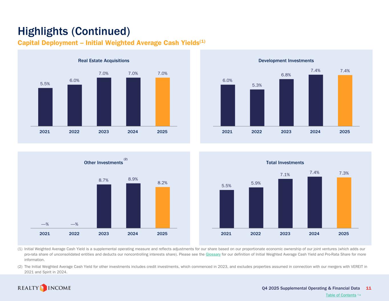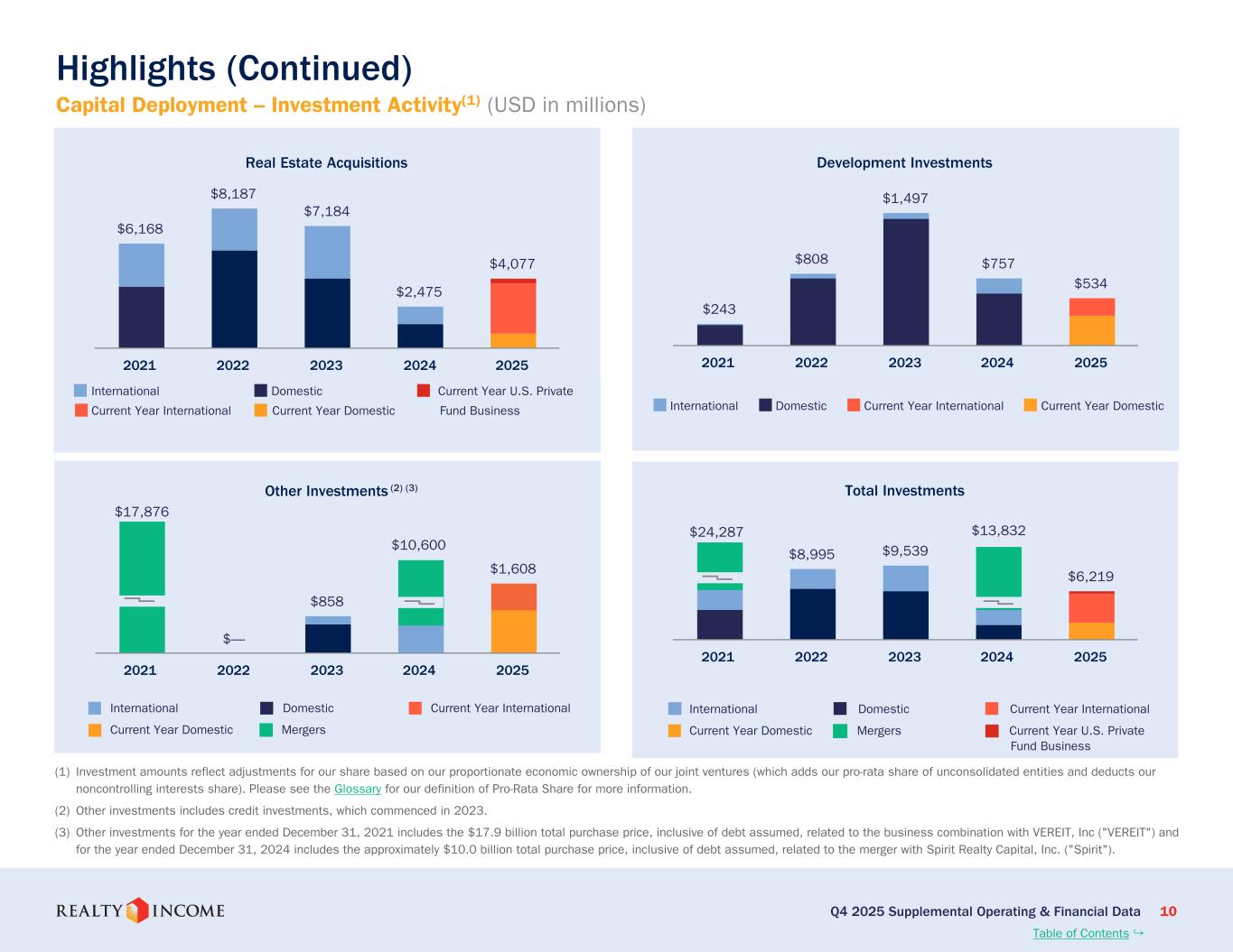 Q4 2025 Supplemental Operating & Financial Data 10 Real Estate Acquisitions $6,168 $8,187 $7,184 $2,475 $4,077 2021 2022 2023 2024 2025 Development Investments $243 $808 $1,497 $757 $534 Domestic International 2021 2022 2023 2024 2025 Other Investments $3,000 $— $858 $2,132 $1,608 Domestic International M&A 2021 2022 2023 2024 2025 Total Investments $8,995 $9,539 $11,864 $6,219 Domestic International U.S. Core Fund M&A 2021 2022 2023 2024 2025 $24,287 Highlights (Continued) Capital Deployment – Investment Activity(1) (USD in millions) Table of Contents ↪ (2) (3) $10,600 3, 32 (1) Investment amounts reflect adjustments for our share based on our proportionate economic ownership of our joint ventures (which adds our pro-rata share of unconsolidated entities and deducts our noncontrolling interests share). Please see the Glossary for our definition of Pro-Rata Share for more information. (2) Other investments includes credit investments, which commenced in 2023. (3) Other investments for the year ended December 31, 2021 includes the $17.9 billion total purchase price, inclusive of debt assumed, related to the business combination with VEREIT, Inc ("VEREIT") and for the year ended December 31, 2024 includes the approximately $10.0 billion total purchase price, inclusive of debt assumed, related to the merger with Spirit Realty Capital, Inc. ("Spirit"). International Domestic Current Year U.S. Private Current Year International Current Year Domestic Fund Business International Domestic Current Year International Current Year Domestic International Domestic Current Year International Current Year Domestic Mergers Current Year U.S. Private Fund Business $17,876 International Domestic Current Year International Current Year Domestic Mergers
