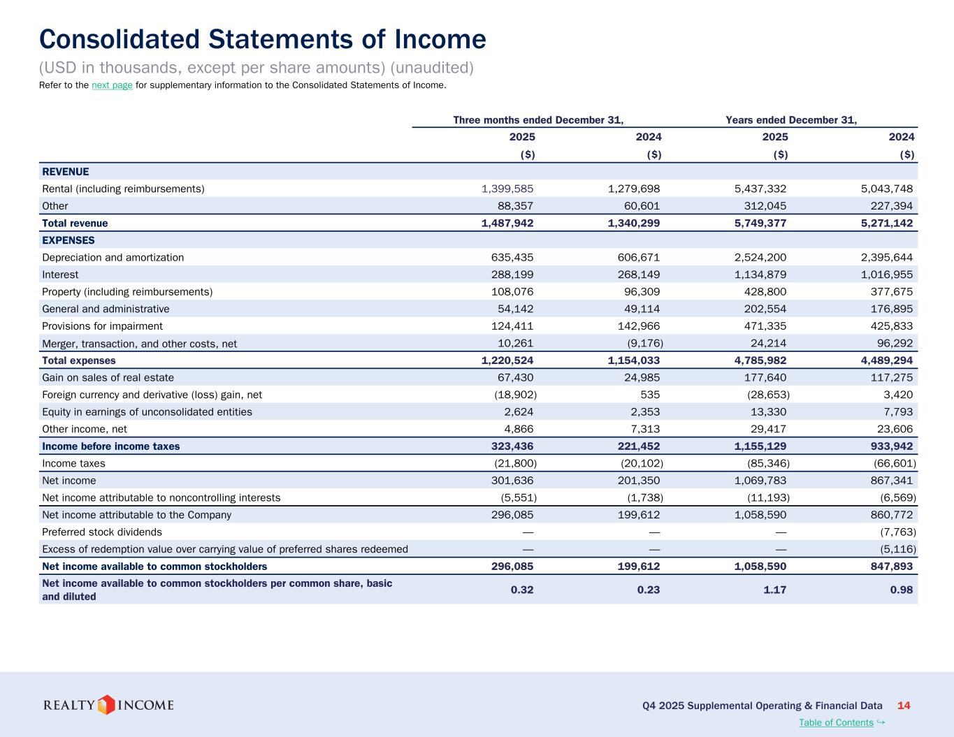 Q4 2025 Supplemental Operating & Financial Data 14 Three months ended December 31, Years ended December 31, 2025 2024 2025 2024 ($) ($) ($) ($) REVENUE   Rental (including reimbursements) 1,399,585 1,279,698 5,437,332 5,043,748 Other 88,357 60,601 312,045 227,394 Total revenue 1,487,942 1,340,299 5,749,377 5,271,142 EXPENSES Depreciation and amortization 635,435 606,671 2,524,200 2,395,644 Interest 288,199 268,149 1,134,879 1,016,955 Property (including reimbursements) 108,076 96,309 428,800 377,675 General and administrative 54,142 49,114 202,554 176,895 Provisions for impairment 124,411 142,966 471,335 425,833 Merger, transaction, and other costs, net 10,261 (9,176) 24,214 96,292 Total expenses 1,220,524 1,154,033 4,785,982 4,489,294 Gain on sales of real estate 67,430 24,985 177,640 117,275 Foreign currency and derivative (loss) gain, net (18,902) 535 (28,653) 3,420 Equity in earnings of unconsolidated entities 2,624 2,353 13,330 7,793 Other income, net 4,866 7,313 29,417 23,606 Income before income taxes 323,436 221,452 1,155,129 933,942 Income taxes (21,800) (20,102) (85,346) (66,601) Net income 301,636 201,350 1,069,783 867,341 Net income attributable to noncontrolling interests (5,551) (1,738) (11,193) (6,569) Net income attributable to the Company 296,085 199,612 1,058,590 860,772 Preferred stock dividends — — — (7,763) Excess of redemption value over carrying value of preferred shares redeemed — — — (5,116) Net income available to common stockholders 296,085 199,612 1,058,590 847,893 Net income available to common stockholders per common share, basic and diluted 0.32 0.23 1.17 0.98 Consolidated Statements of Income (USD in thousands, except per share amounts) (unaudited) Refer to the next page for supplementary information to the Consolidated Statements of Income. Table of Contents ↪