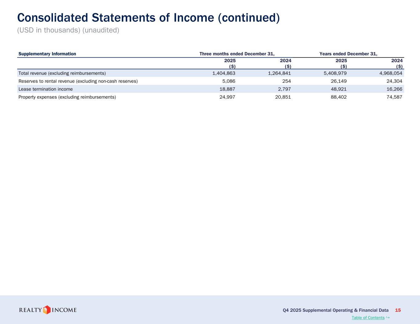 Q4 2025 Supplemental Operating & Financial Data 15 Consolidated Statements of Income (continued) (USD in thousands) (unaudited) Supplementary Information Three months ended December 31, Years ended December 31, 2025 ($) 2024 ($) 2025 ($) 2024 ($) Total revenue (excluding reimbursements) 1,404,863 1,264,841 5,408,979 4,968,054 Reserves to rental revenue (excluding non-cash reserves) 5,086 254 26,149 24,304 Lease termination income 18,887 2,797 48,921 16,266 Property expenses (excluding reimbursements) 24,997 20,851 88,402 74,587 Table of Contents ↪