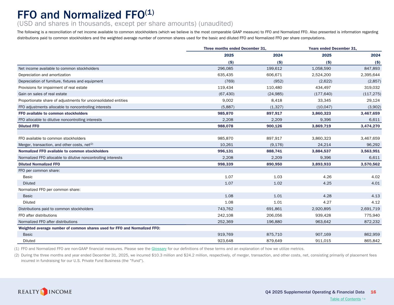 Q4 2025 Supplemental Operating & Financial Data 16 The following is a reconciliation of net income available to common stockholders (which we believe is the most comparable GAAP measure) to FFO and Normalized FFO. Also presented is information regarding distributions paid to common stockholders and the weighted average number of common shares used for the basic and diluted FFO and Normalized FFO per share computations. Three months ended December 31, Years ended December 31, 2025 2024 2025 2024 ($) ($) ($) ($) Net income available to common stockholders 296,085 199,612 1,058,590 847,893 Depreciation and amortization 635,435 606,671 2,524,200 2,395,644 Depreciation of furniture, fixtures and equipment (769) (952) (2,622) (2,857) Provisions for impairment of real estate 119,434 110,480 434,497 319,032 Gain on sales of real estate (67,430) (24,985) (177,640) (117,275) Proportionate share of adjustments for unconsolidated entities 9,002 8,418 33,345 29,124 FFO adjustments allocable to noncontrolling interests (5,887) (1,327) (10,047) (3,902) FFO available to common stockholders 985,870 897,917 3,860,323 3,467,659 FFO allocable to dilutive noncontrolling interests 2,208 2,209 9,396 6,611 Diluted FFO 988,078 900,126 3,869,719 3,474,270 FFO available to common stockholders 985,870 897,917 3,860,323 3,467,659 Merger, transaction, and other costs, net(2) 10,261 (9,176) 24,214 96,292 Normalized FFO available to common stockholders 996,131 888,741 3,884,537 3,563,951 Normalized FFO allocable to dilutive noncontrolling interests 2,208 2,209 9,396 6,611 Diluted Normalized FFO 998,339 890,950 3,893,933 3,570,562 FFO per common share: Basic 1.07 1.03 4.26 4.02 Diluted 1.07 1.02 4.25 4.01 Normalized FFO per common share: Basic 1.08 1.01 4.28 4.13 Diluted 1.08 1.01 4.27 4.12 Distributions paid to common stockholders 743,762 691,861 2,920,895 2,691,719 FFO after distributions 242,108 206,056 939,428 775,940 Normalized FFO after distributions 252,369 196,880 963,642 872,232 Weighted average number of common shares used for FFO and Normalized FFO: Basic 919,769 875,710 907,169 862,959 Diluted 923,648 879,649 911,015 865,842 FFO and Normalized FFO(1) (USD and shares in thousands, except per share amounts) (unaudited) (1) FFO and Normalized FFO are non-GAAP financial measures. Please see the Glossary for our definitions of these terms and an explanation of how we utilize metrics. (2) During the three months and year ended December 31, 2025, we incurred $10.3 million and $24.2 million, respectively, of merger, transaction, and other costs, net, consisting primarily of placement fees incurred in fundraising for our U.S. Private Fund Business (the "Fund"). Table of Contents ↪
